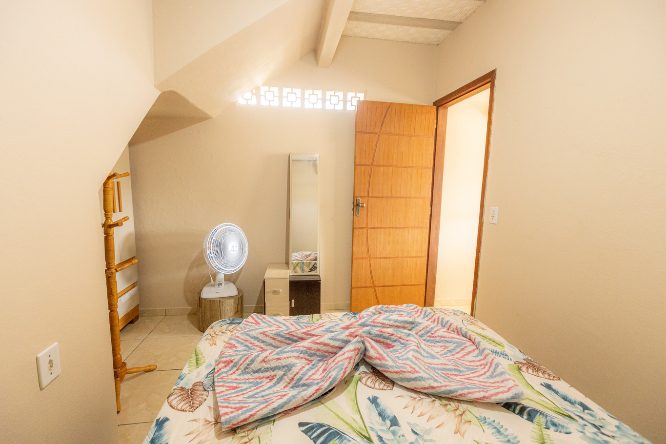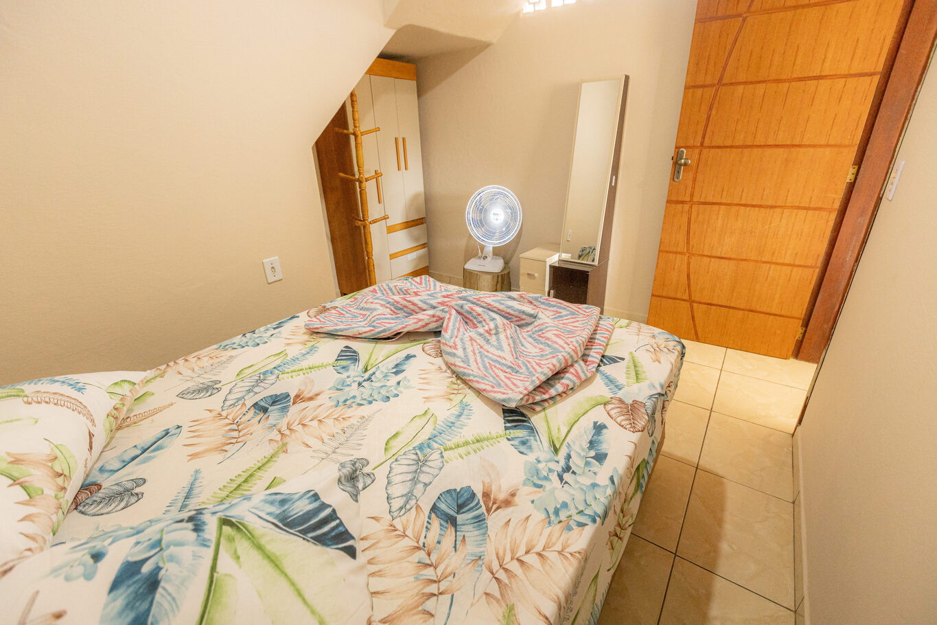 - Quarto com 1 cama de casal, armário e ventilador portátil