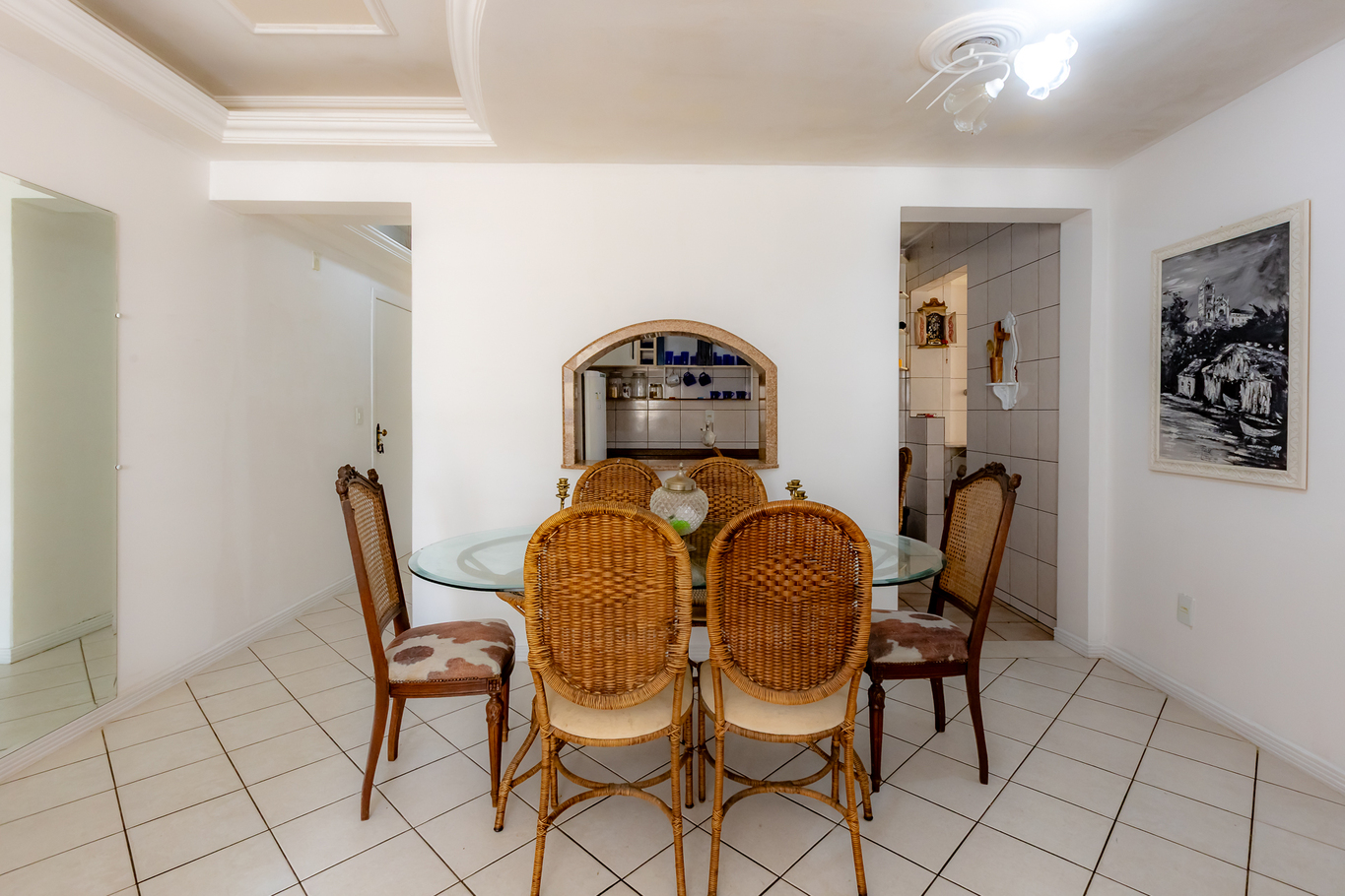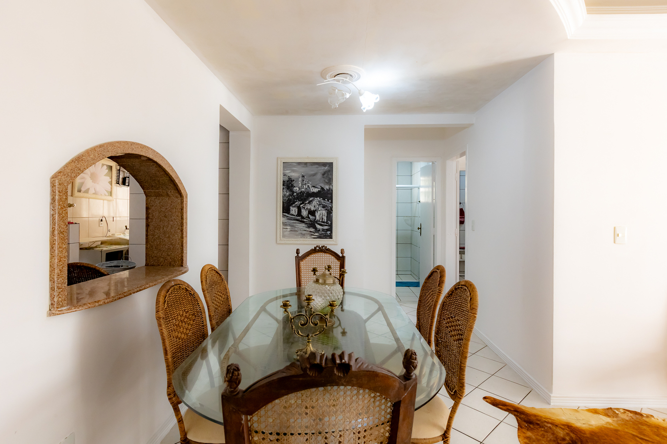 - Sala com mesa de jantar para 6 pessoas, sofá, smart TV e varanda