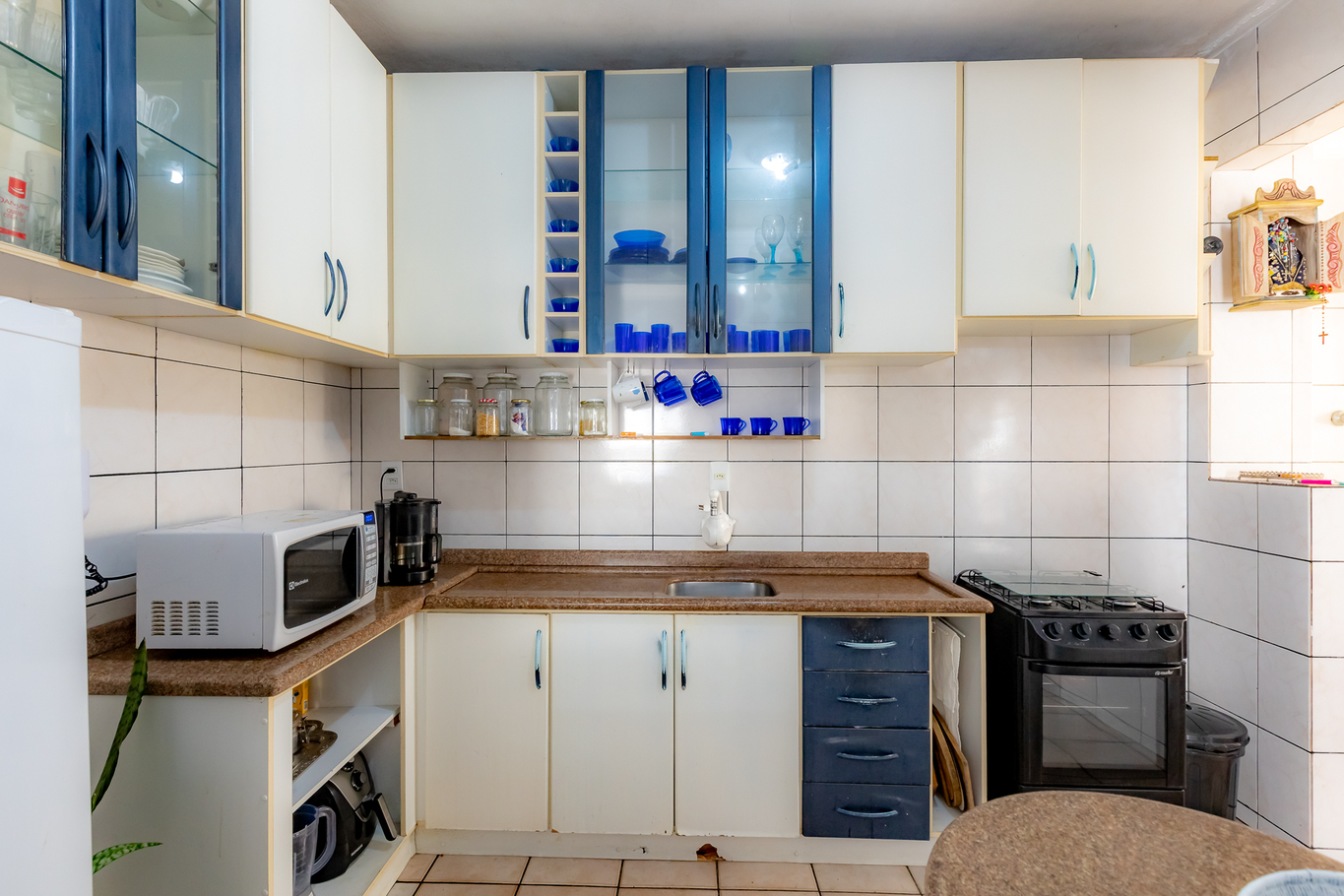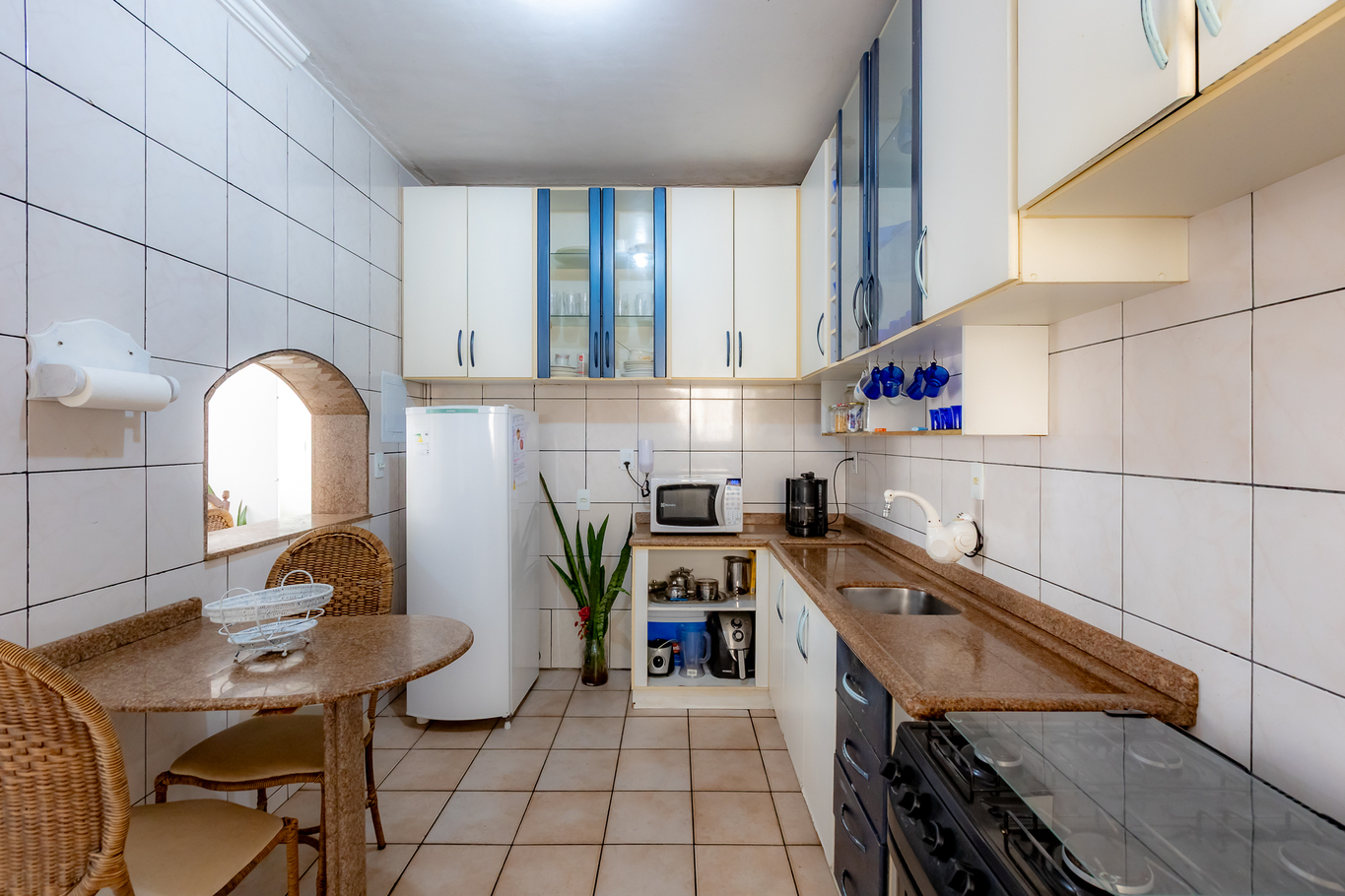 - Cozinha equipada com fogão, forno, micro-ondas, geladeira, cafeteira, liquidificador, chaleira e utensílios básicos (taças, jarra d'água, etc.). Possui mesa para duas pessoas.