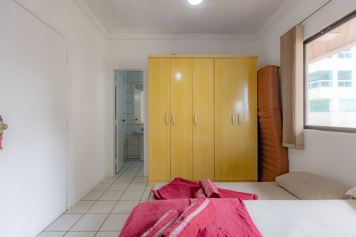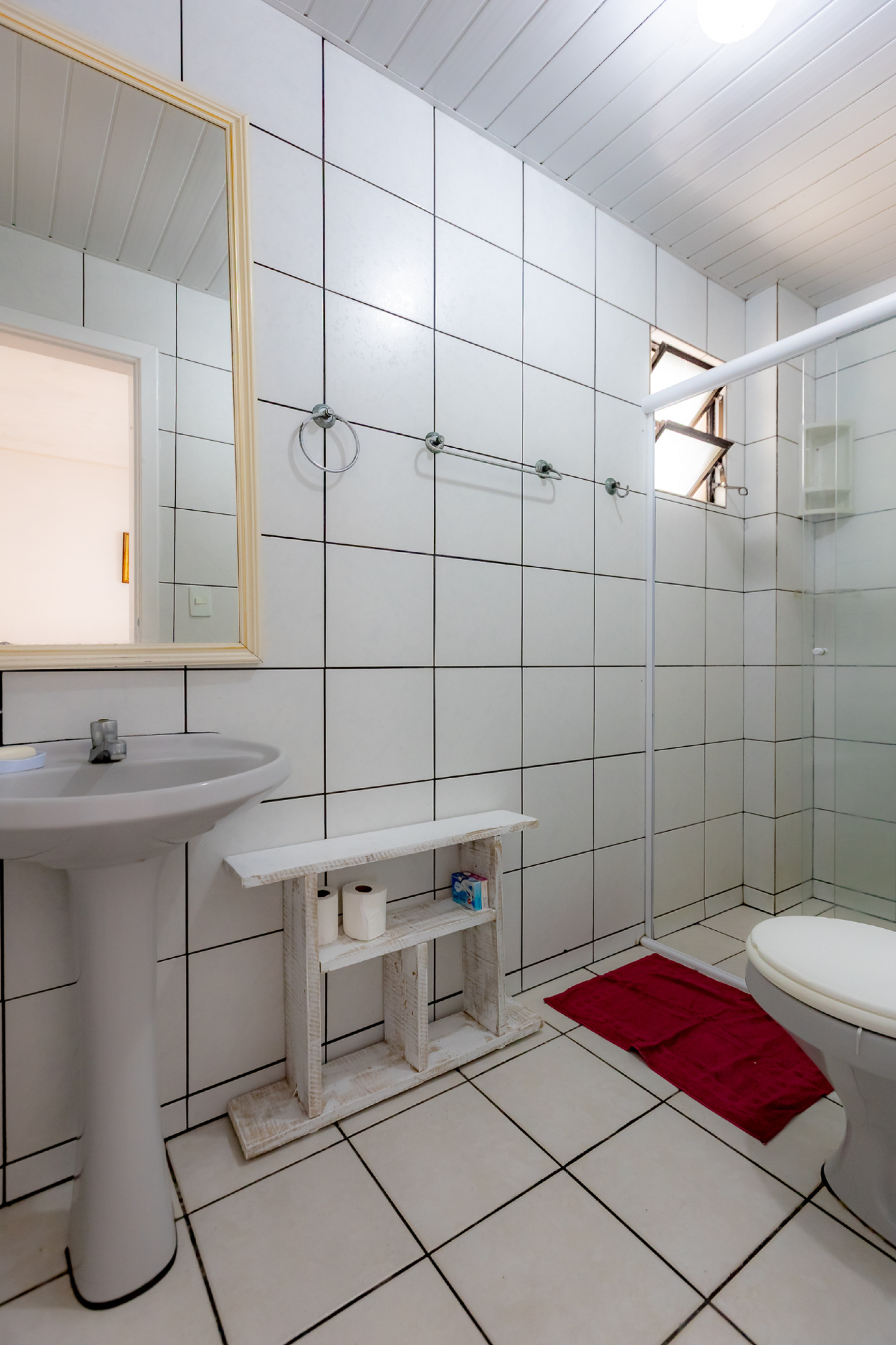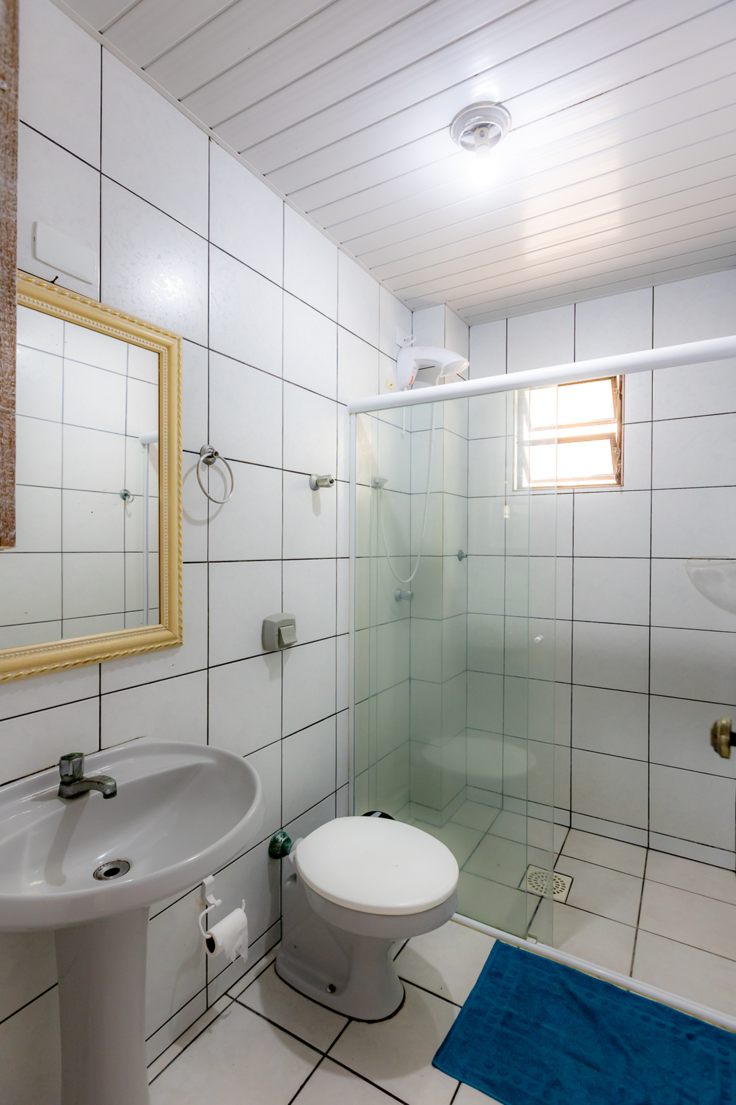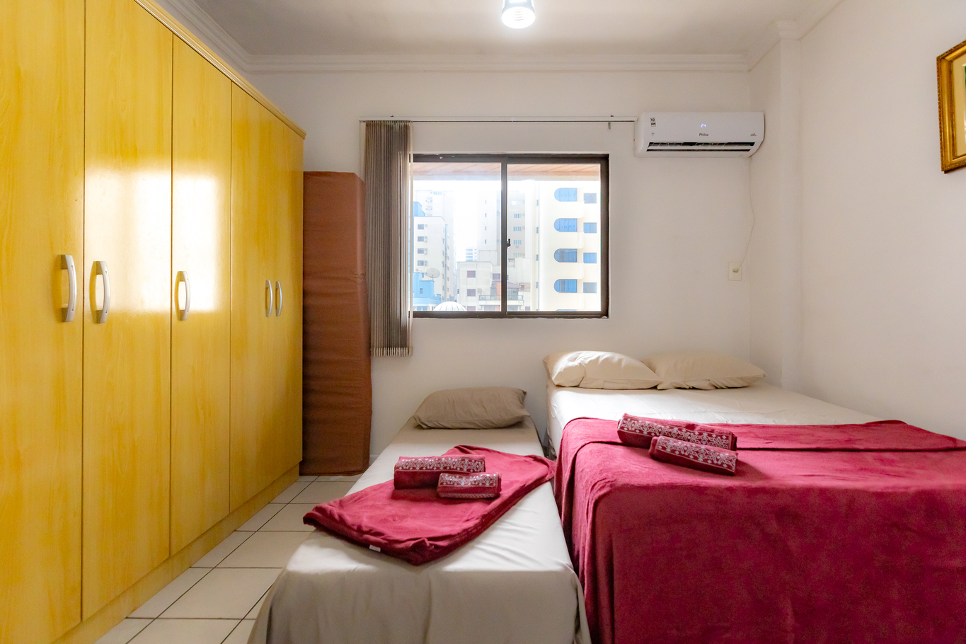 - Quarto 1 (Suíte): 1 cama de casal e 1 cama de solteiro, ar-condicionado, armário e banheiro privativo com chuveiro elétrico e box de vidro/acrílico