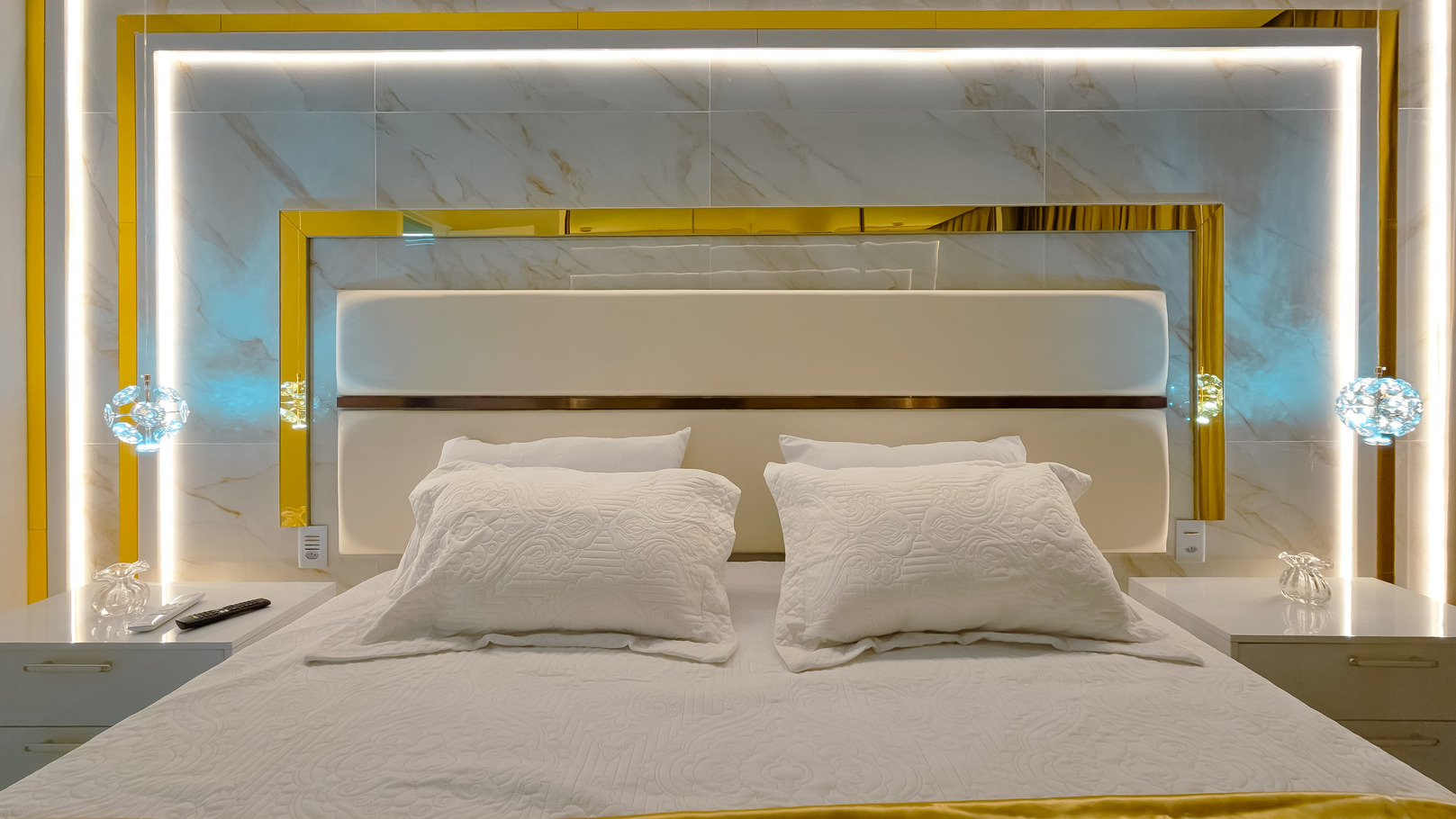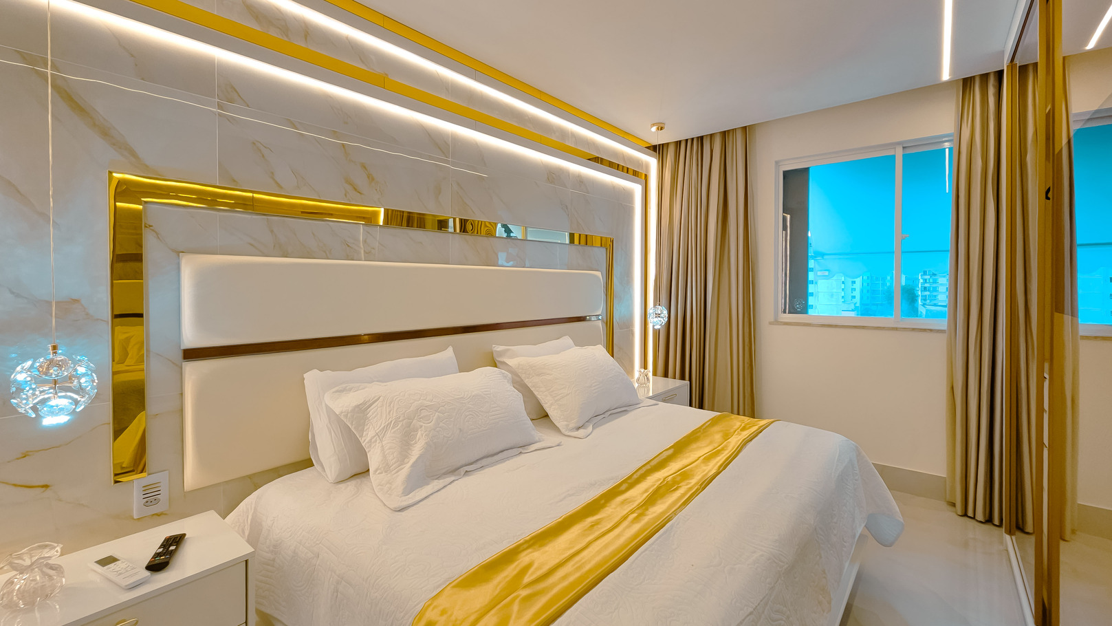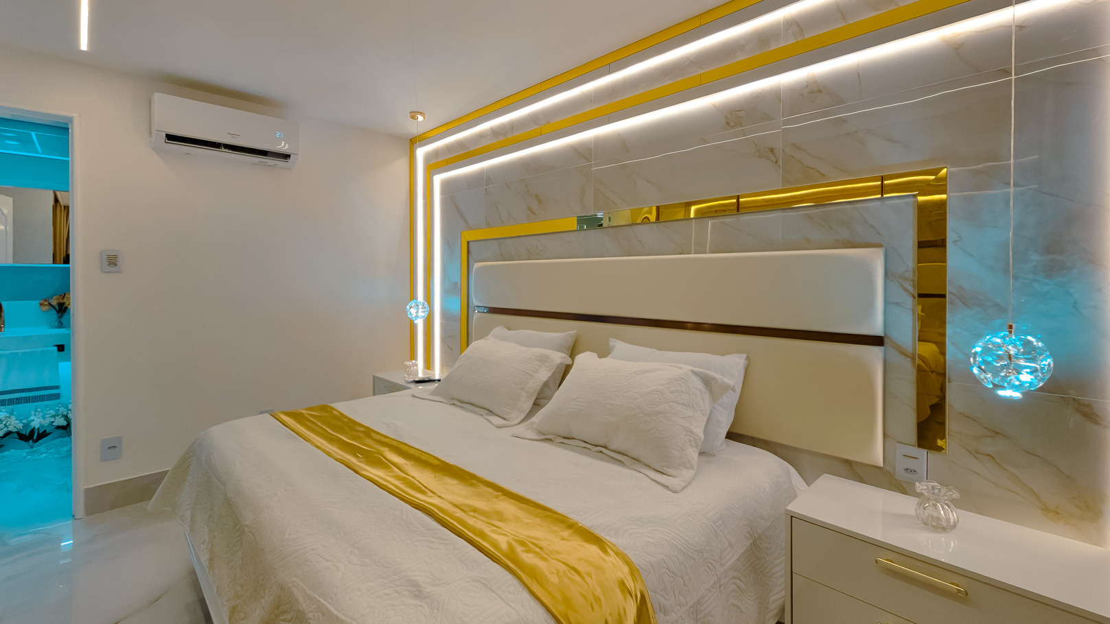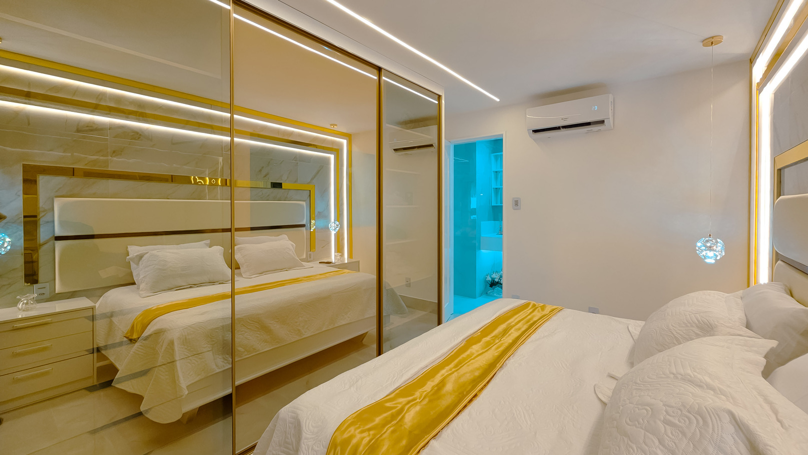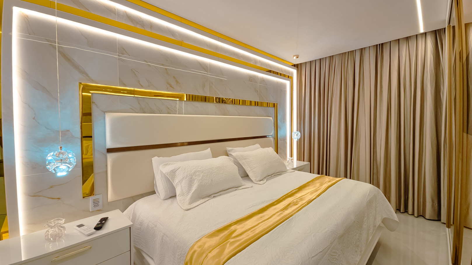- Quarto com cama queen, ar-condicionado, cabeceira luxo Abu Dhabi com acrílico dourado e fita de LED, guarda-roupa com portas em vidro e smart TV integrada, e iluminação de perfil no teto