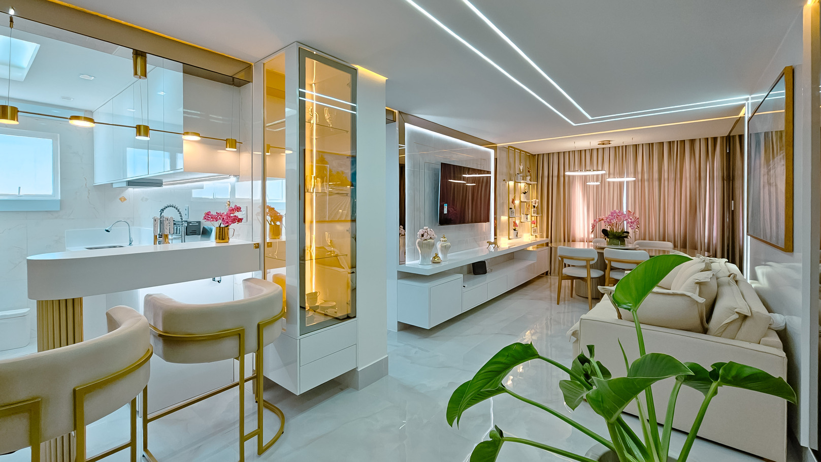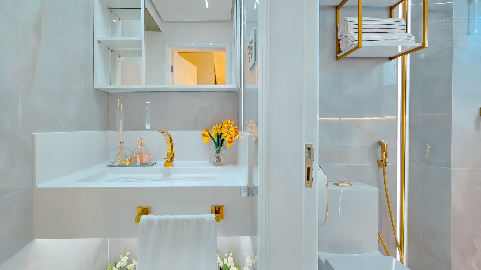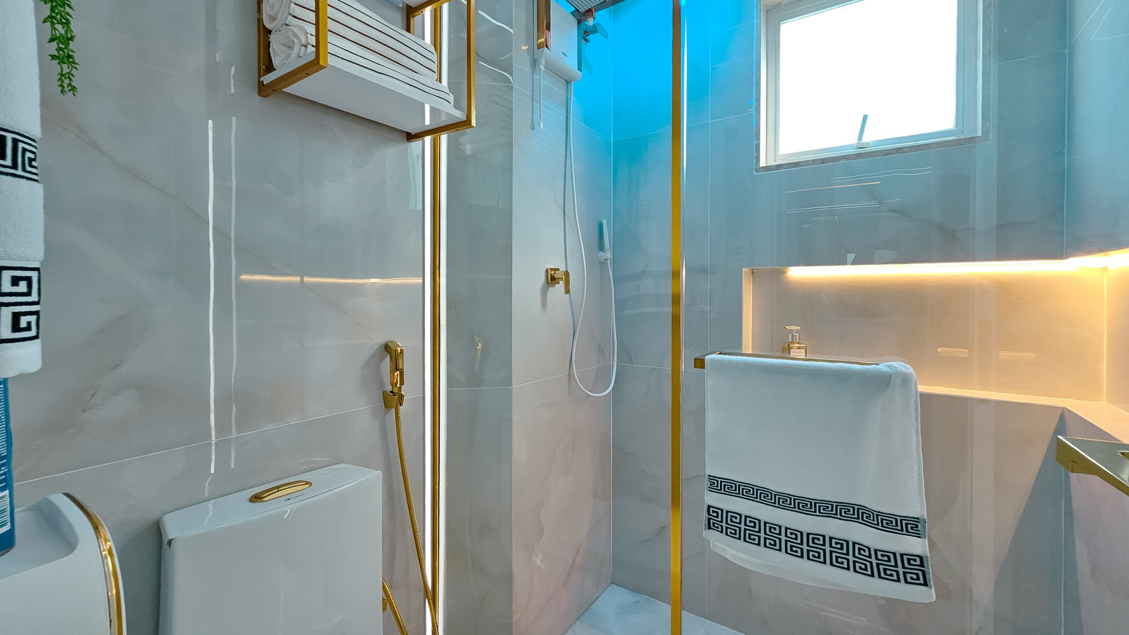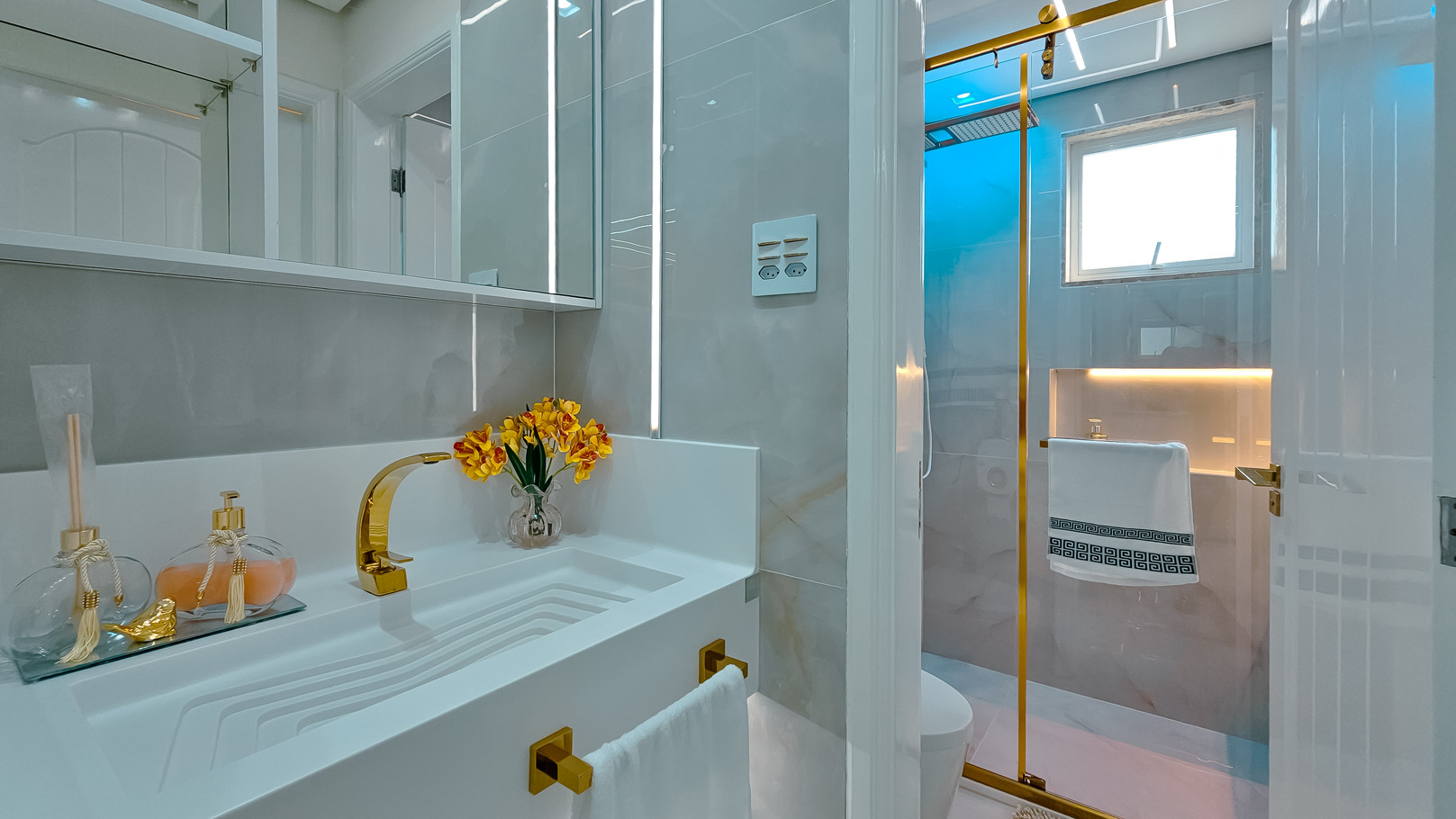 - Banheiro com box moove dourado com maior espaço de entrada, iluminação de perfil e LED, puxador metálico dourado com porta-toalha integrado, prateleiras e lixeira com sensor