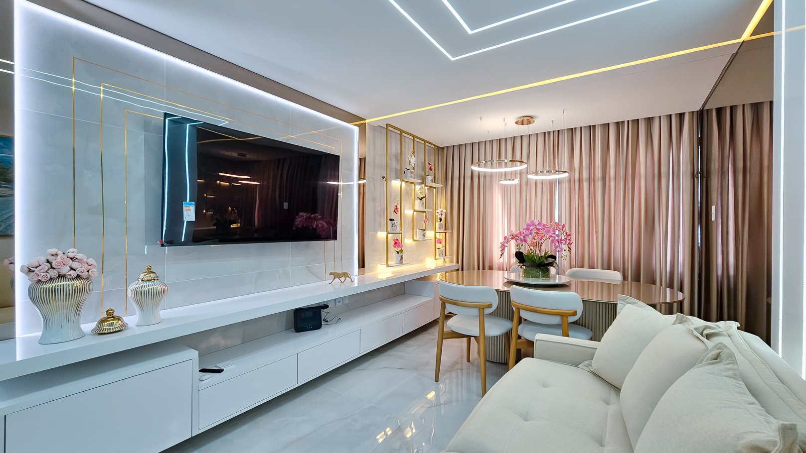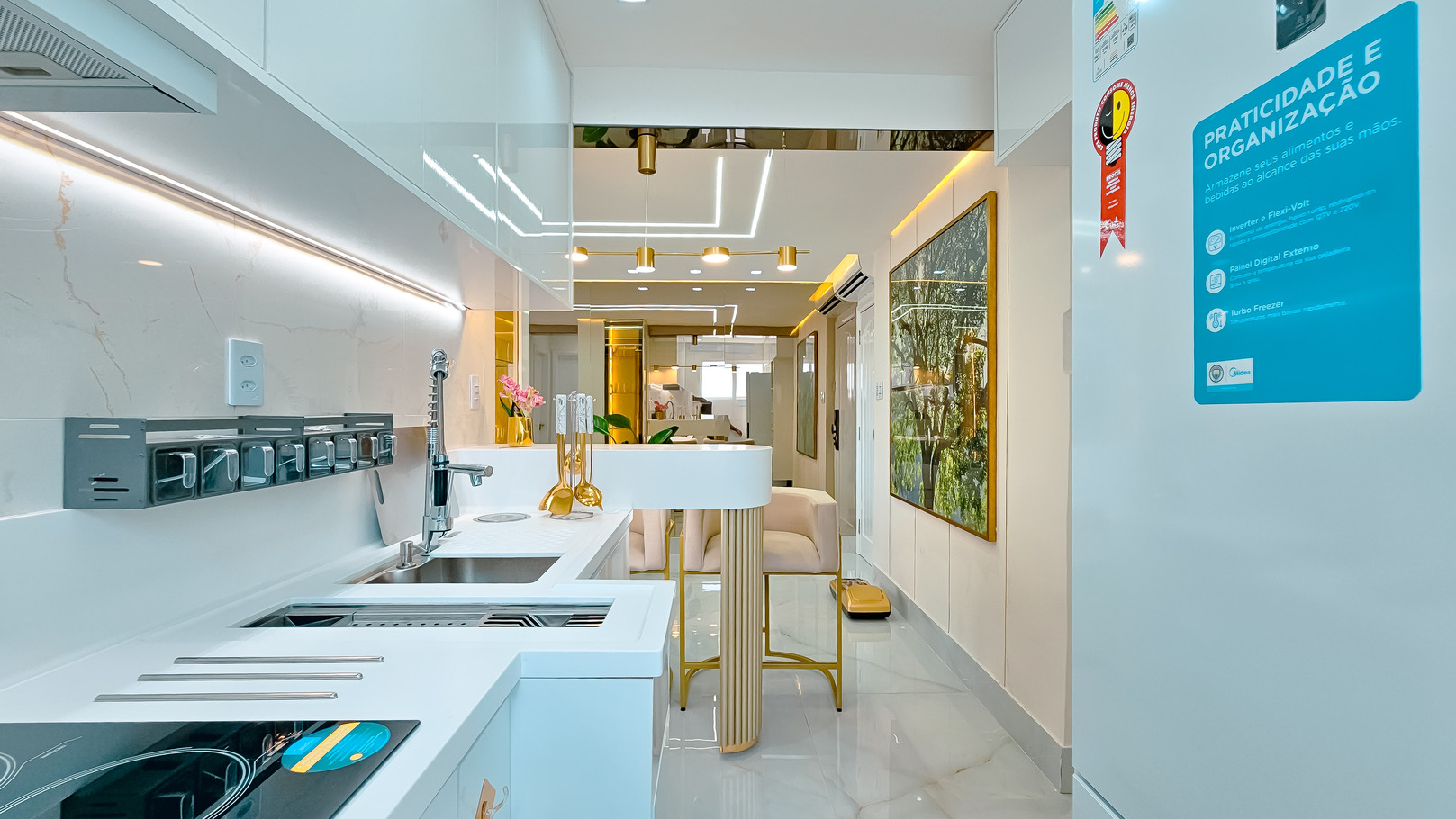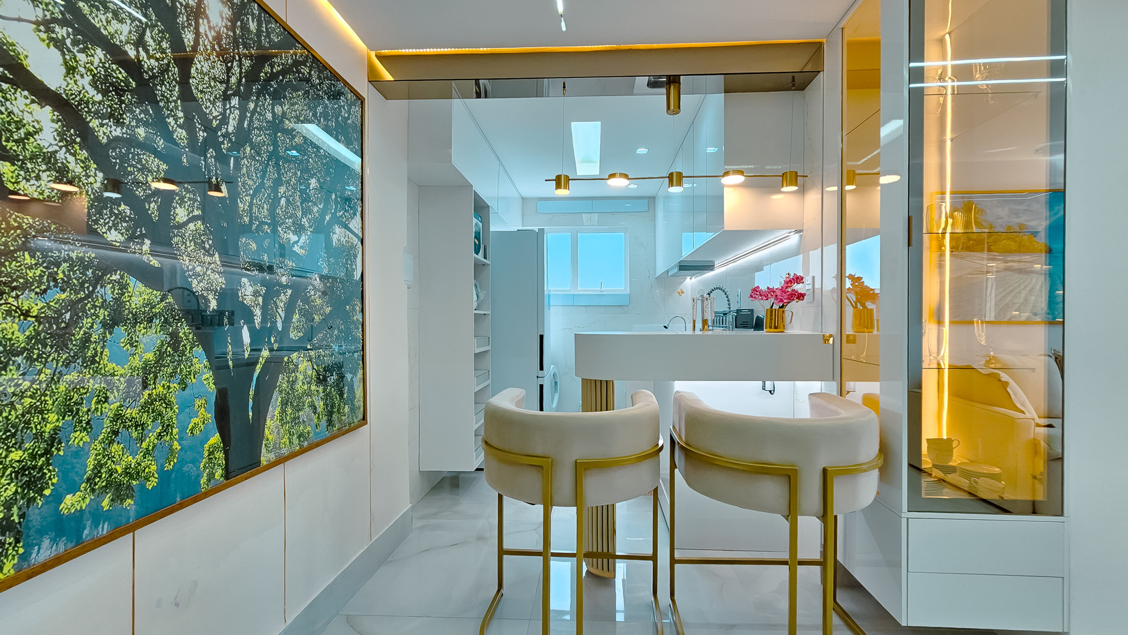 - Banheiro com box moove dourado com maior espaço de entrada, iluminação de perfil e LED, puxador metálico dourado com porta-toalha integrado, prateleiras e lixeira com sensor