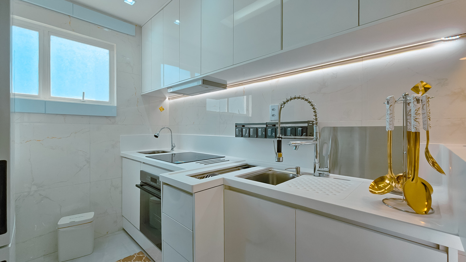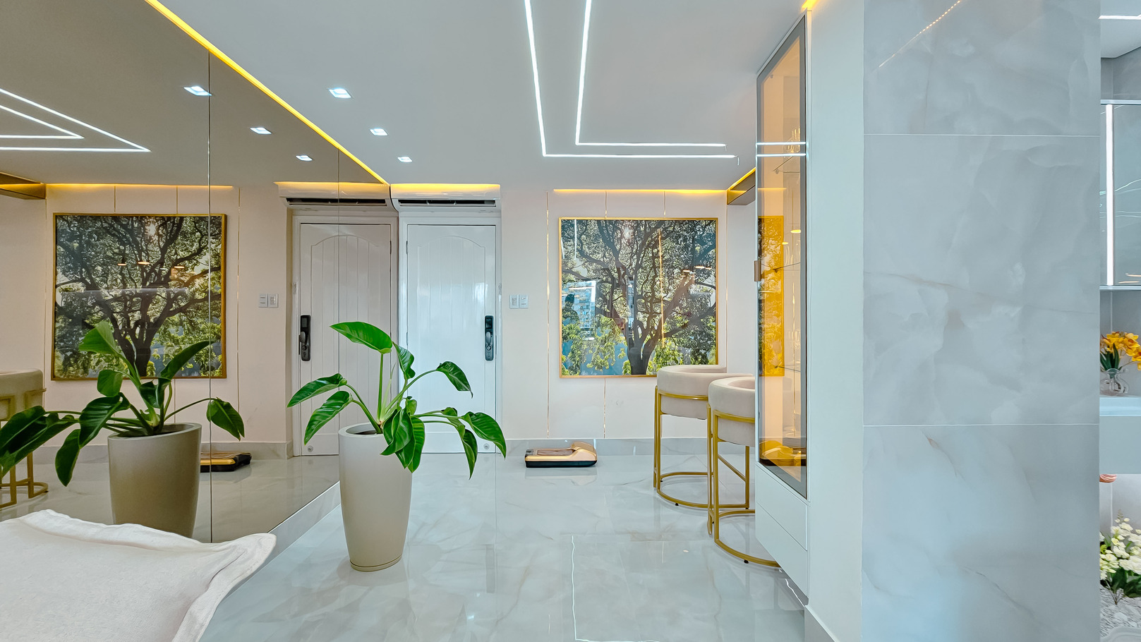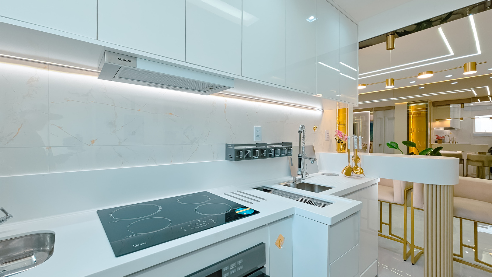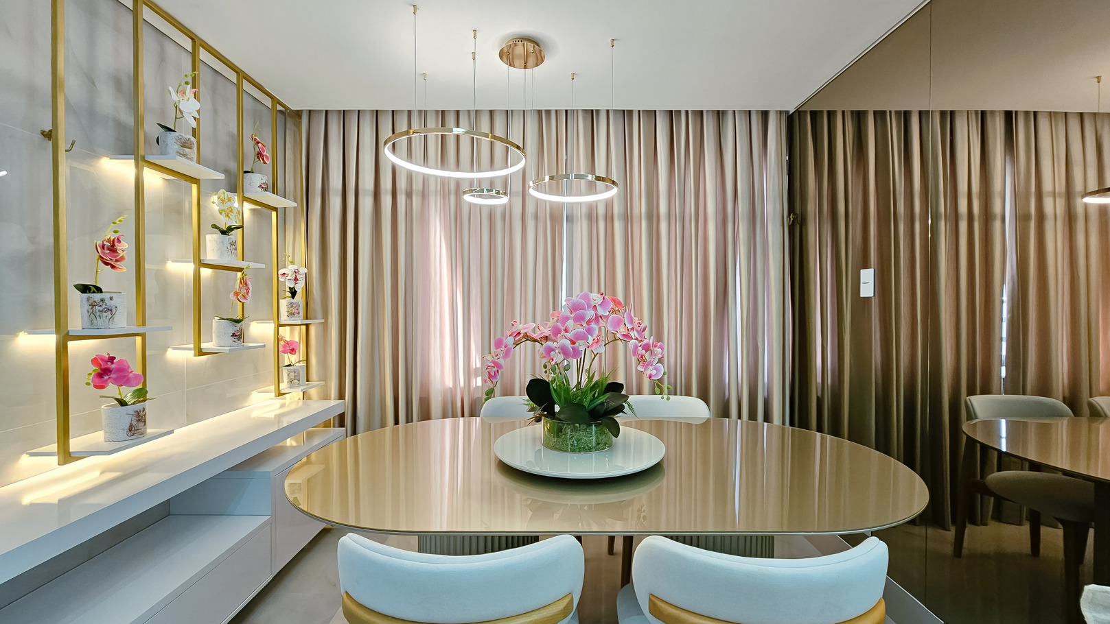 - Banheiro com box moove dourado com maior espaço de entrada, iluminação de perfil e LED, puxador metálico dourado com porta-toalha integrado, prateleiras e lixeira com sensor