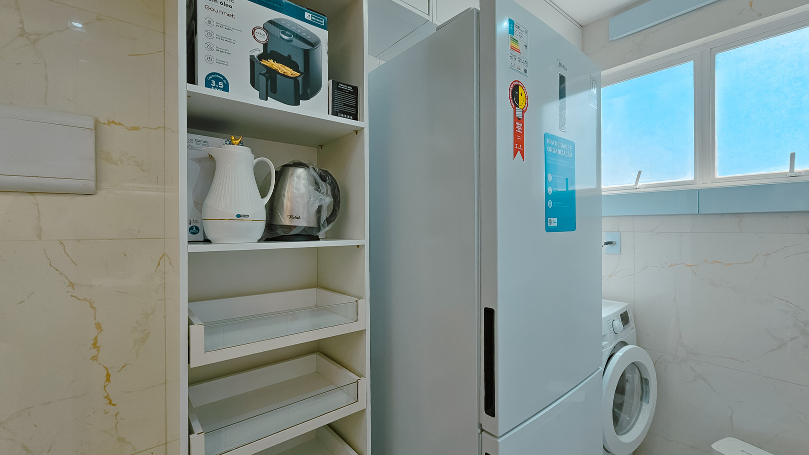 - Cozinha completa com forno, fogão, exaustor, geladeira, cafeteira, fritadeira, torradeira, liquidificador, filtro de água e utensílios diversos(exceto óleo e sal)