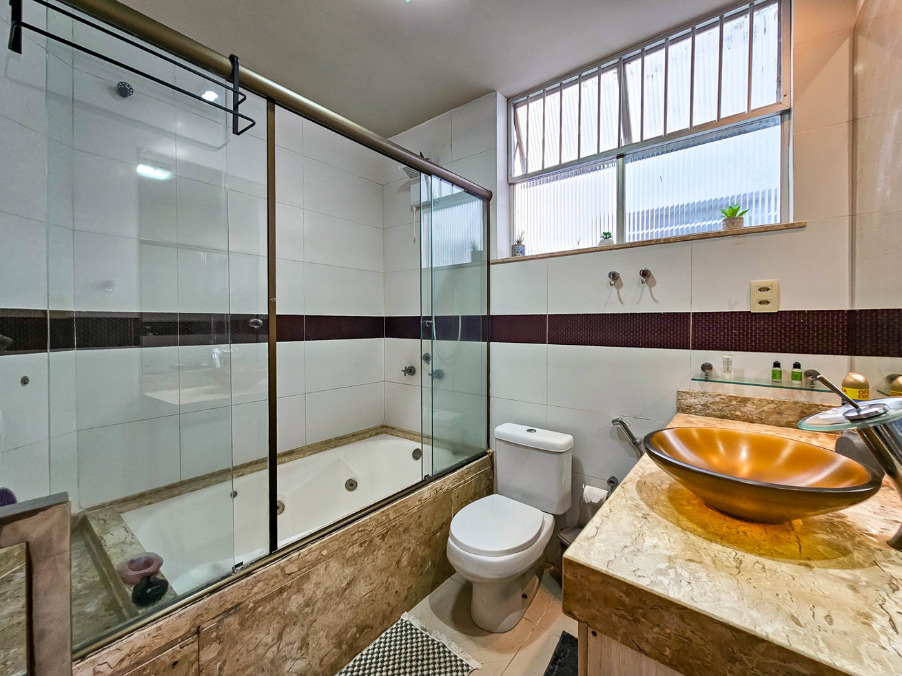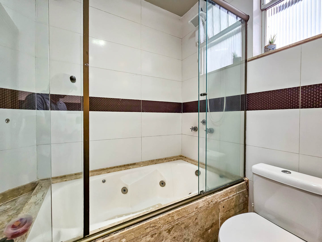 - Banheiro 1 com chuveiro elétrico, box, banheira e secador de cabelo