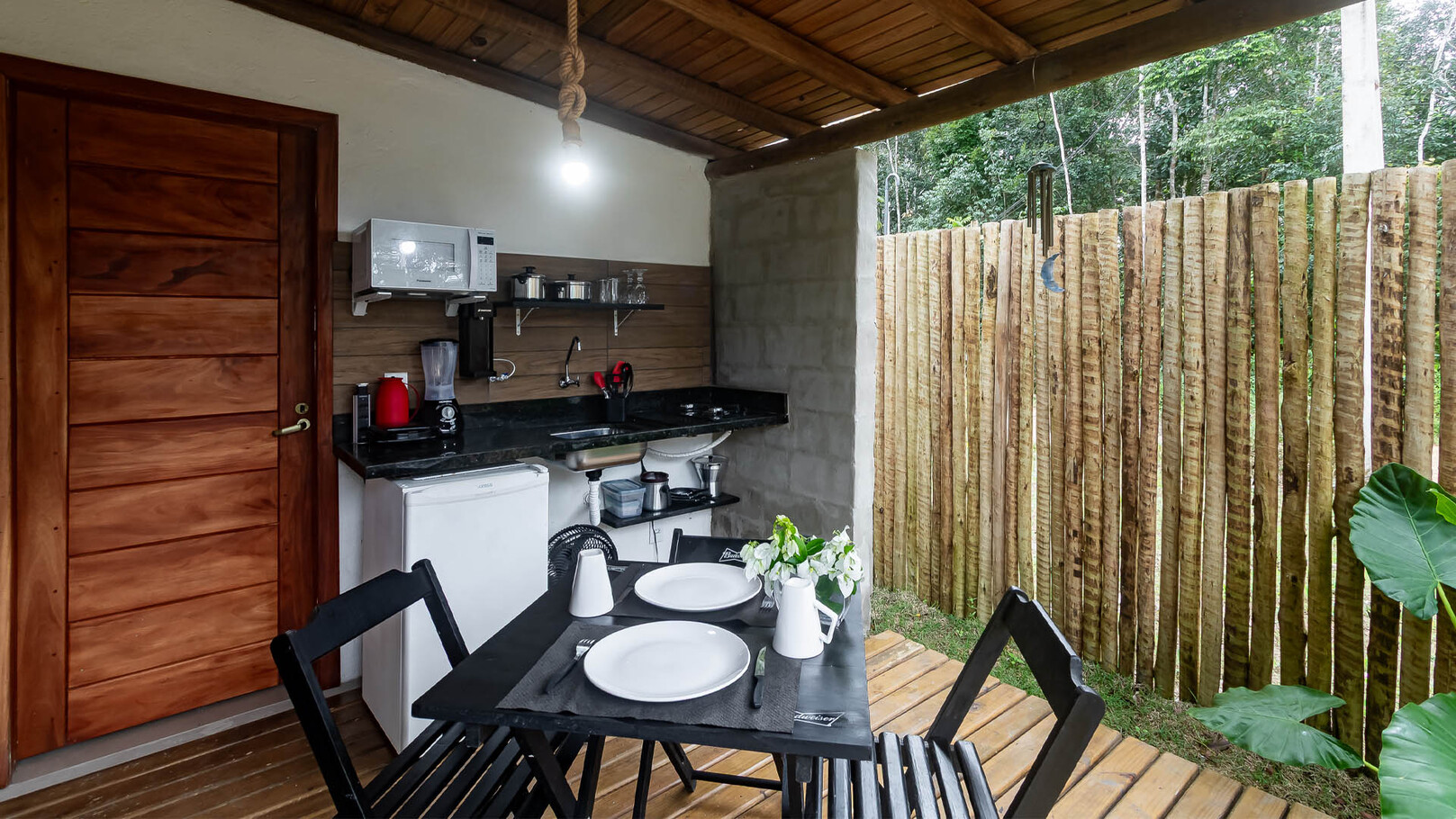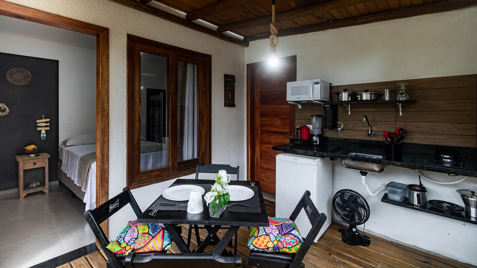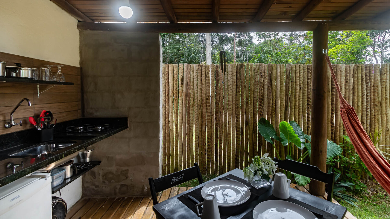 - Cozinha na varanda gourmet com fogão, microondas, frigobar e mesa para 4 pessoas(exceto óleo e sal)