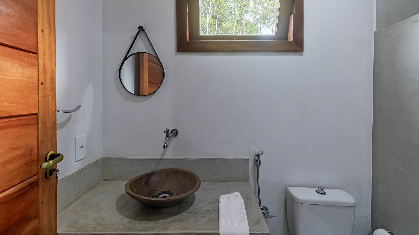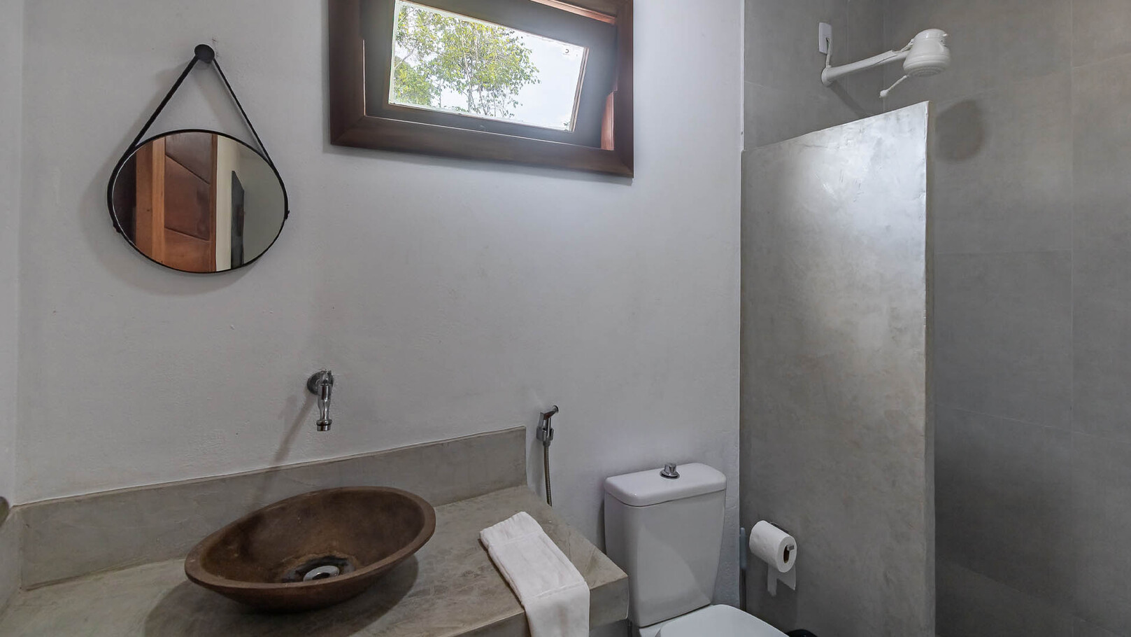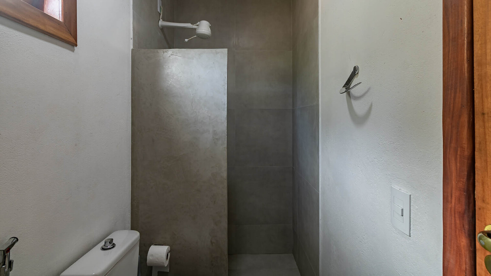 - Banheiro com chuveiro elétrico, box de cimento queimado e espelho grande