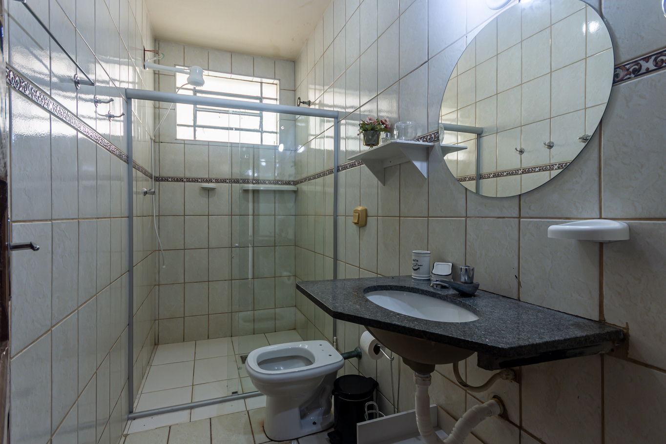 - Banheiro com chuveiro elétrico, box de vidro/acrílico e secador de cabelo
