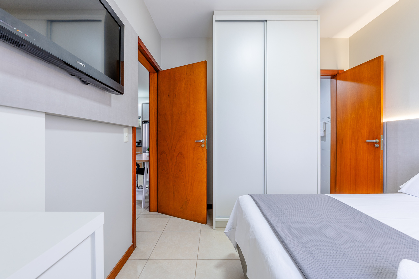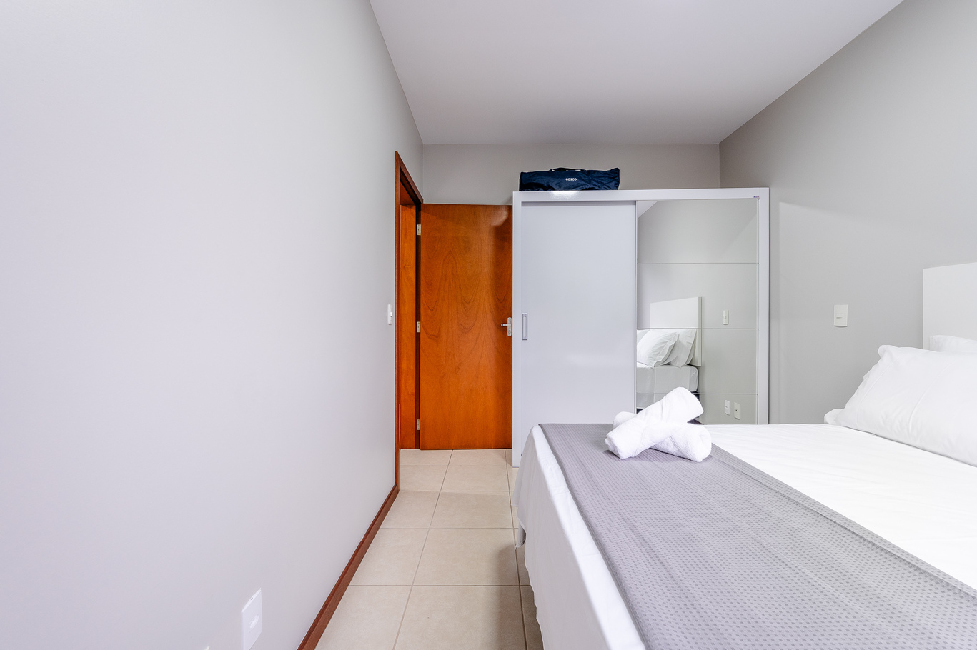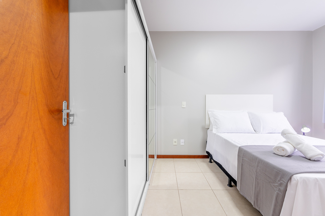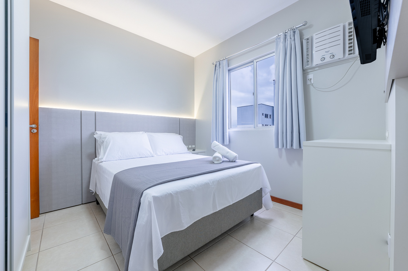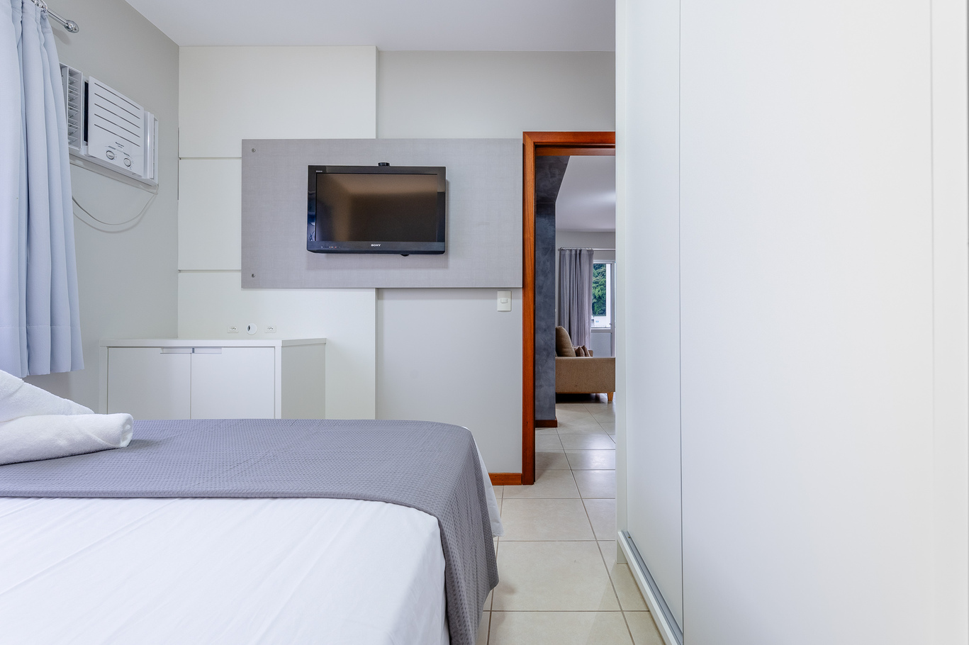 Quarto 1 (suíte): 1 cama de casal + 1 colchão de solteiro, ar-condicionado, TV, armário e banheiro privativo com chuveiro elétrico, box de vidro/acrílico e secador de cabelo