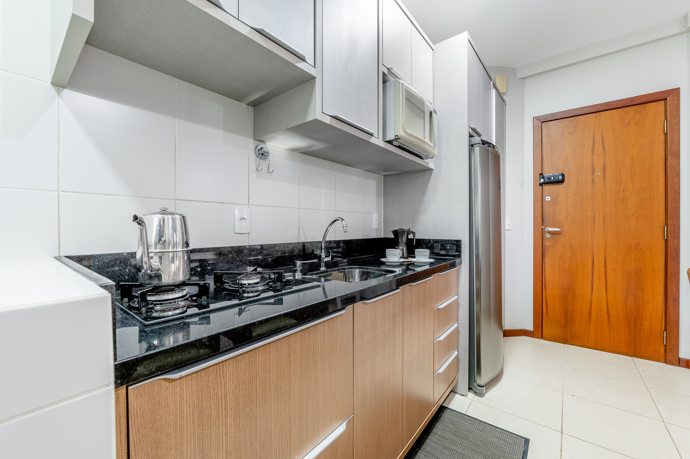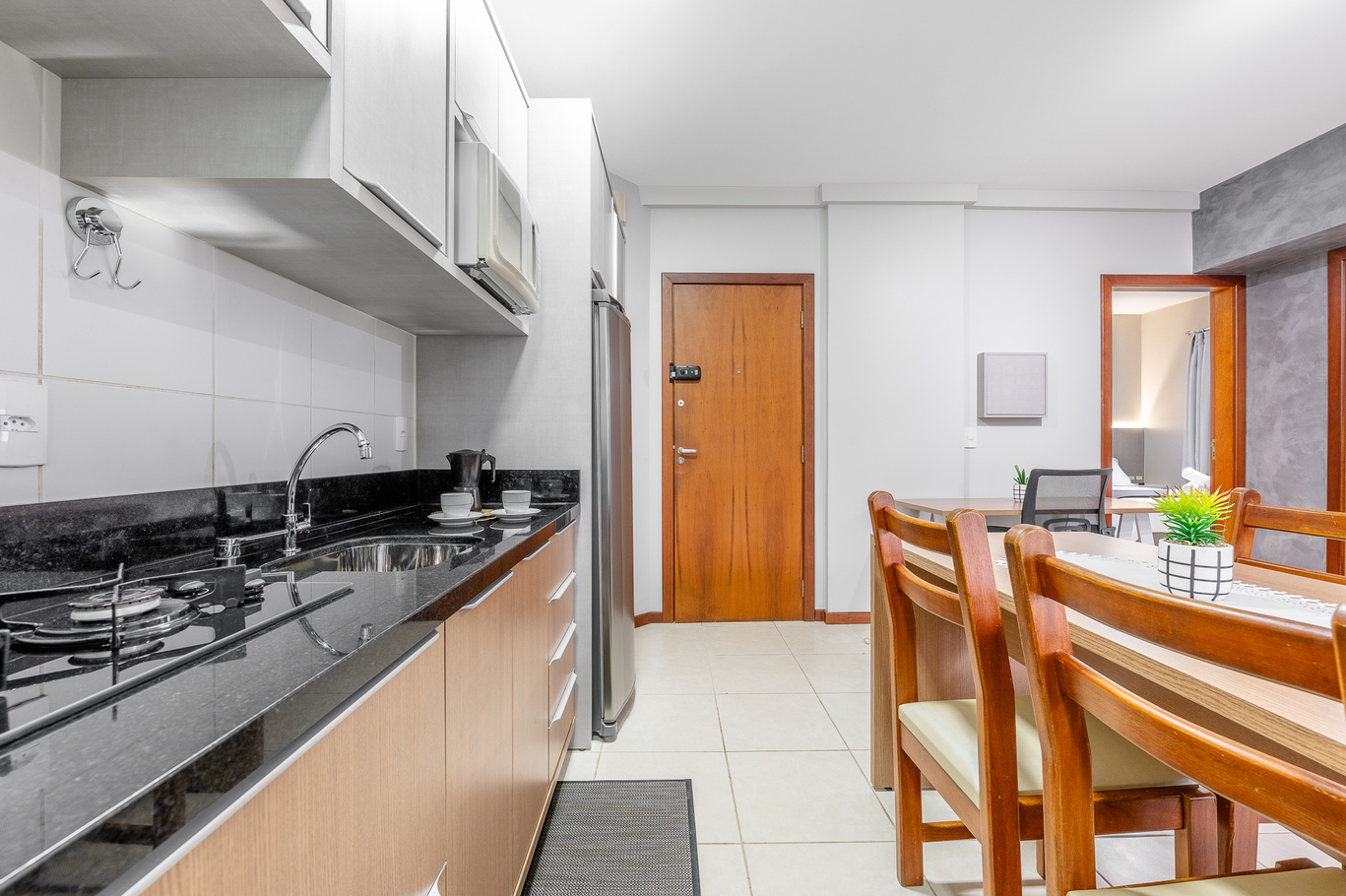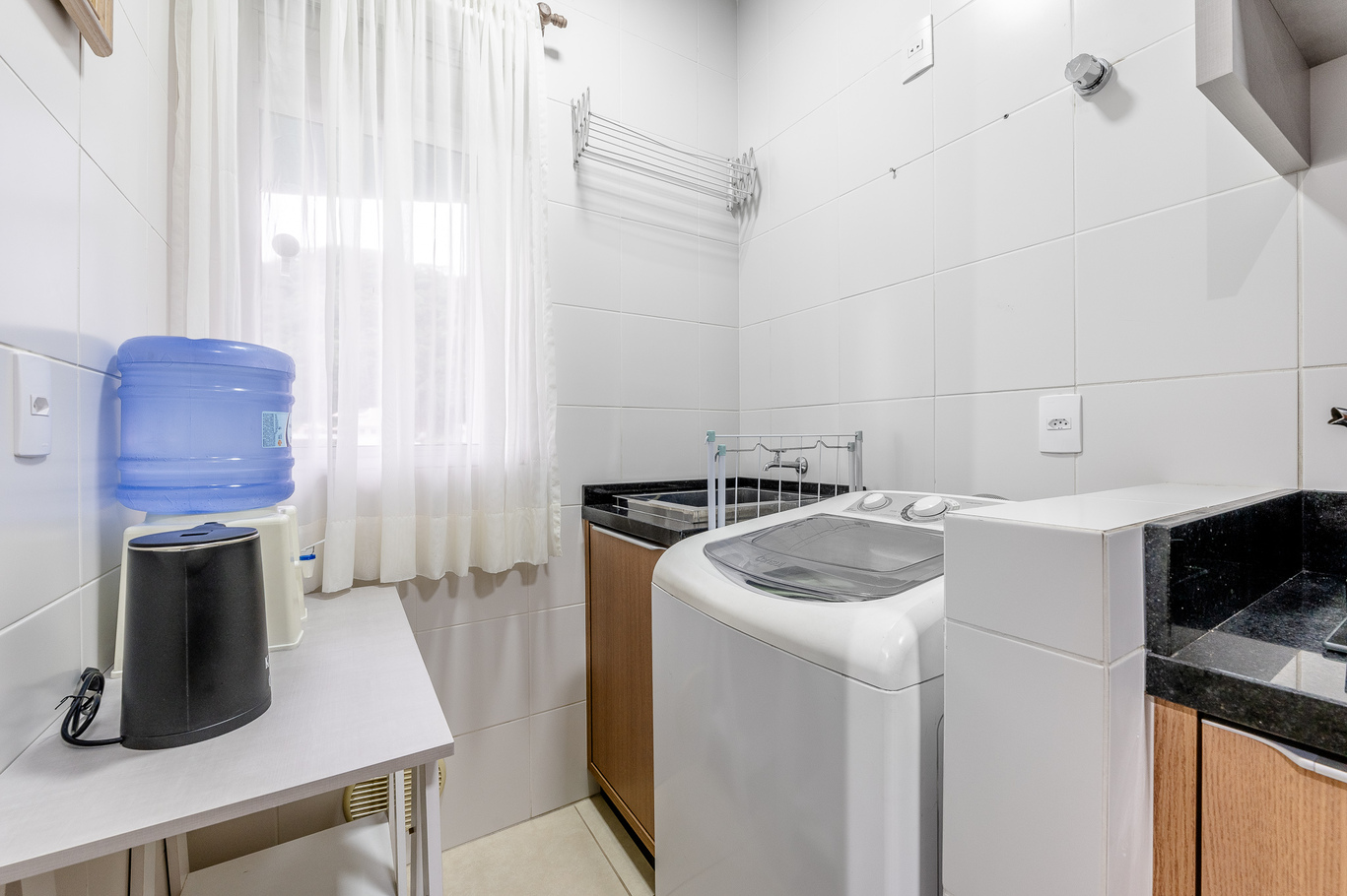 Cozinha: equipada com fogão, forno, micro-ondas, cafeteira, torradeira, Airfryer, utensílios e balcão para refeições