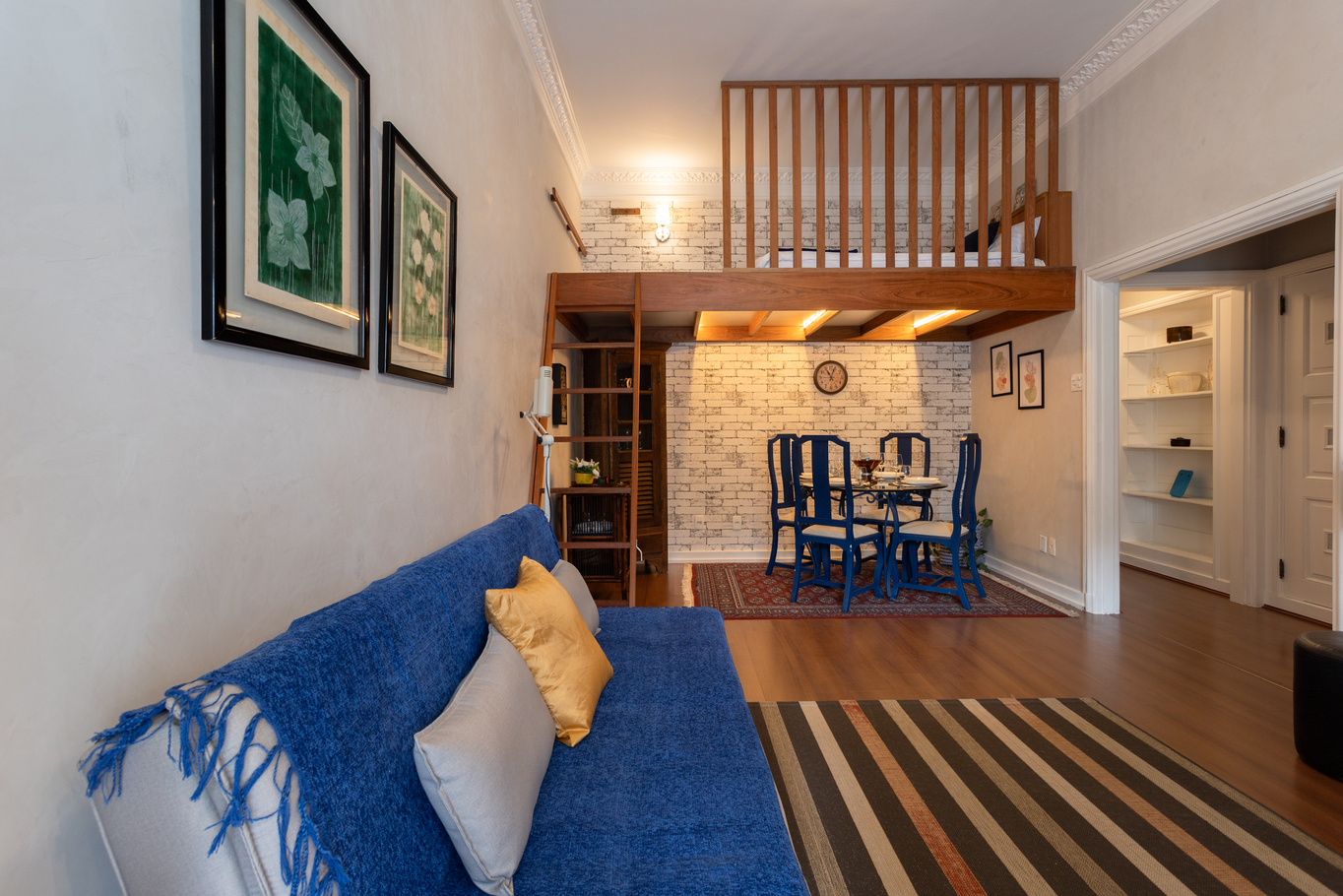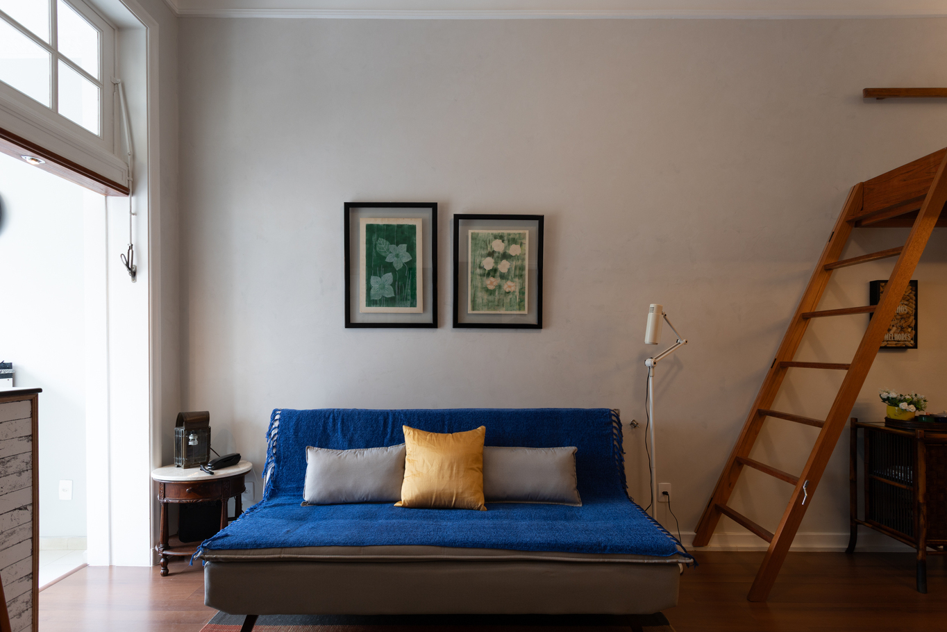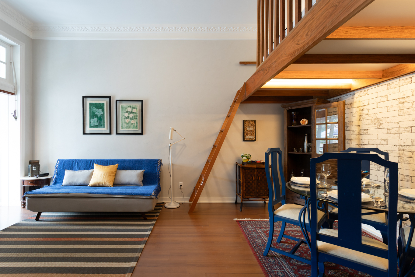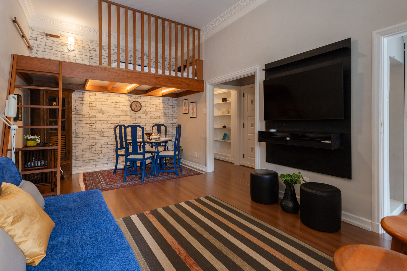 - Sala com sofá-cama, Smart TV, mesa de jantar e decoração charmosa
