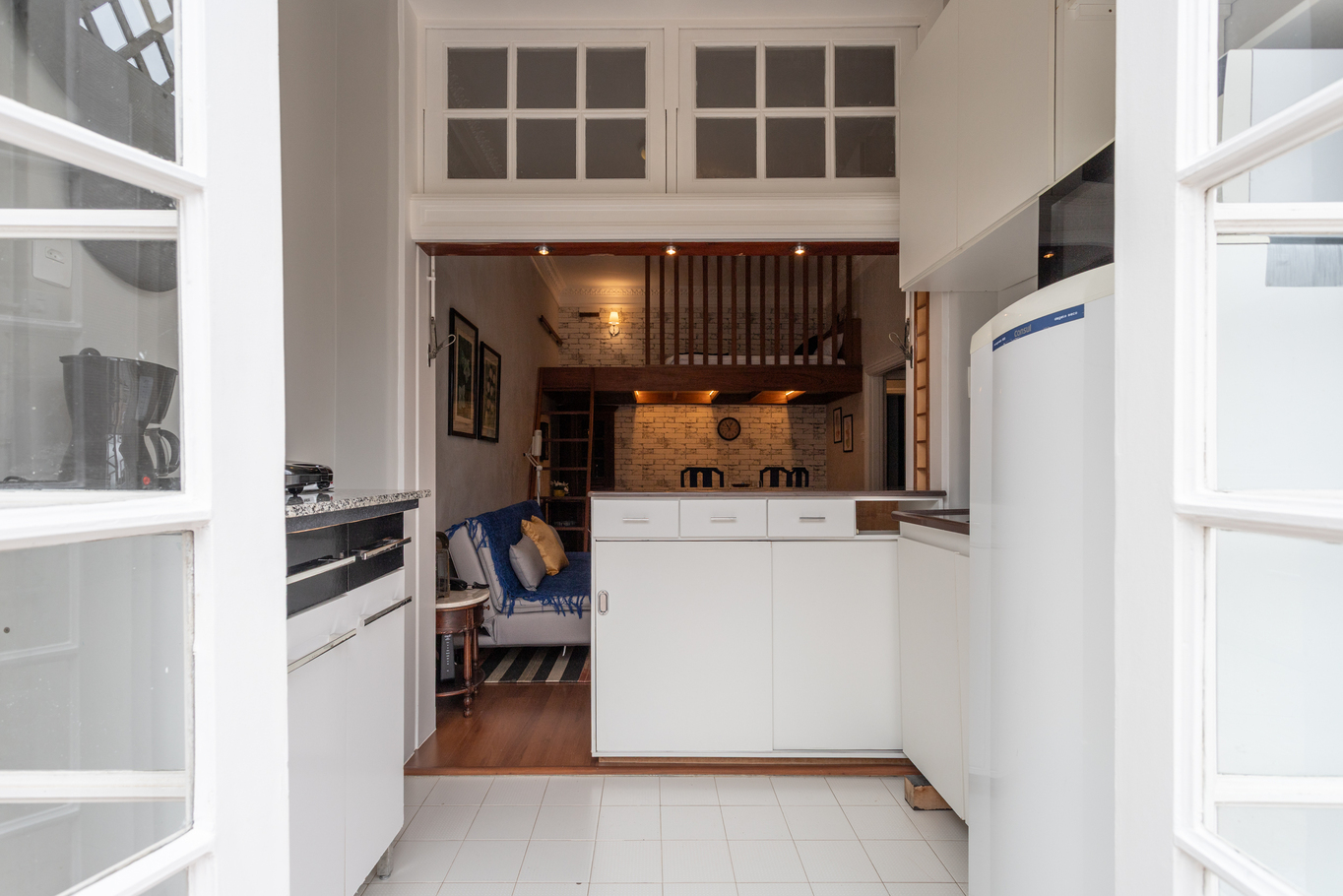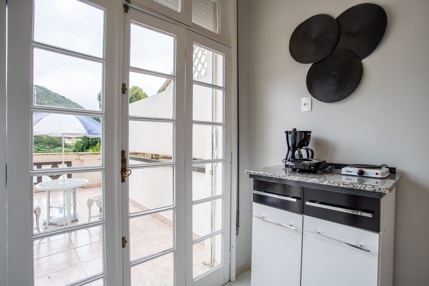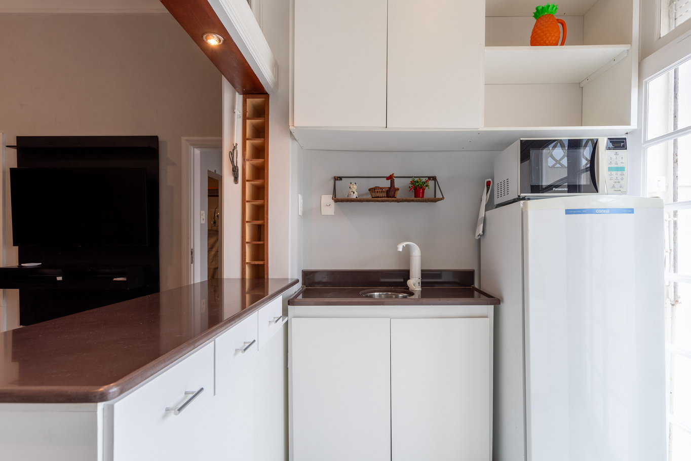 - Cozinha americana equipada com fogão, micro-ondas, cafeteira, liquidificador, geladeira, utensílios completos(exceto óleo e sal)