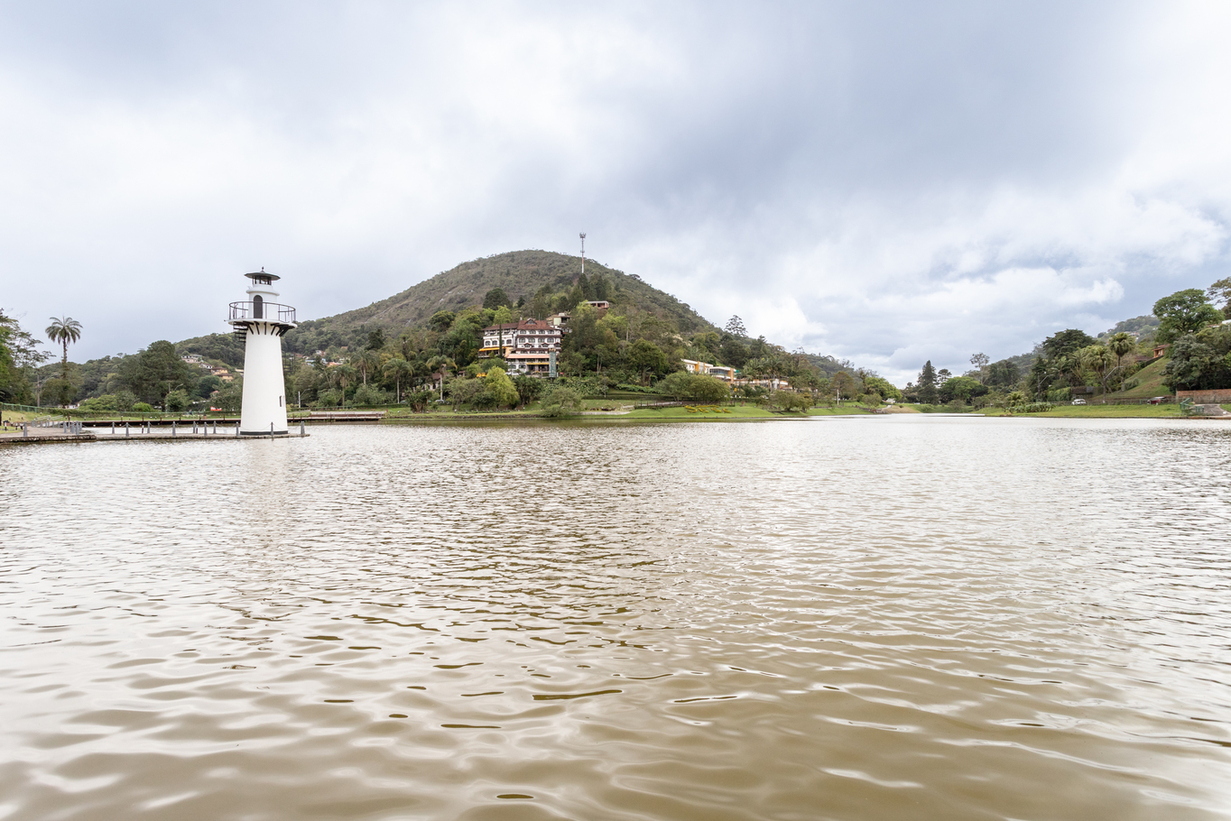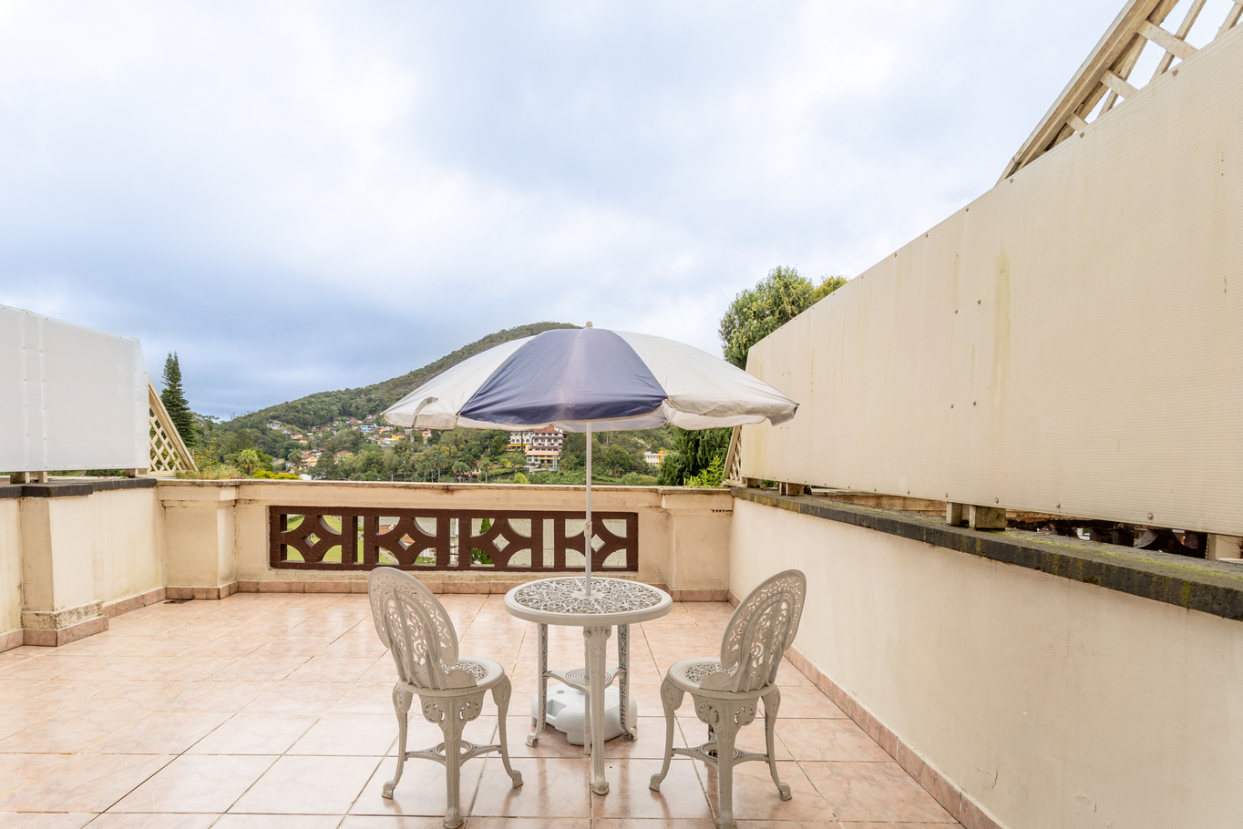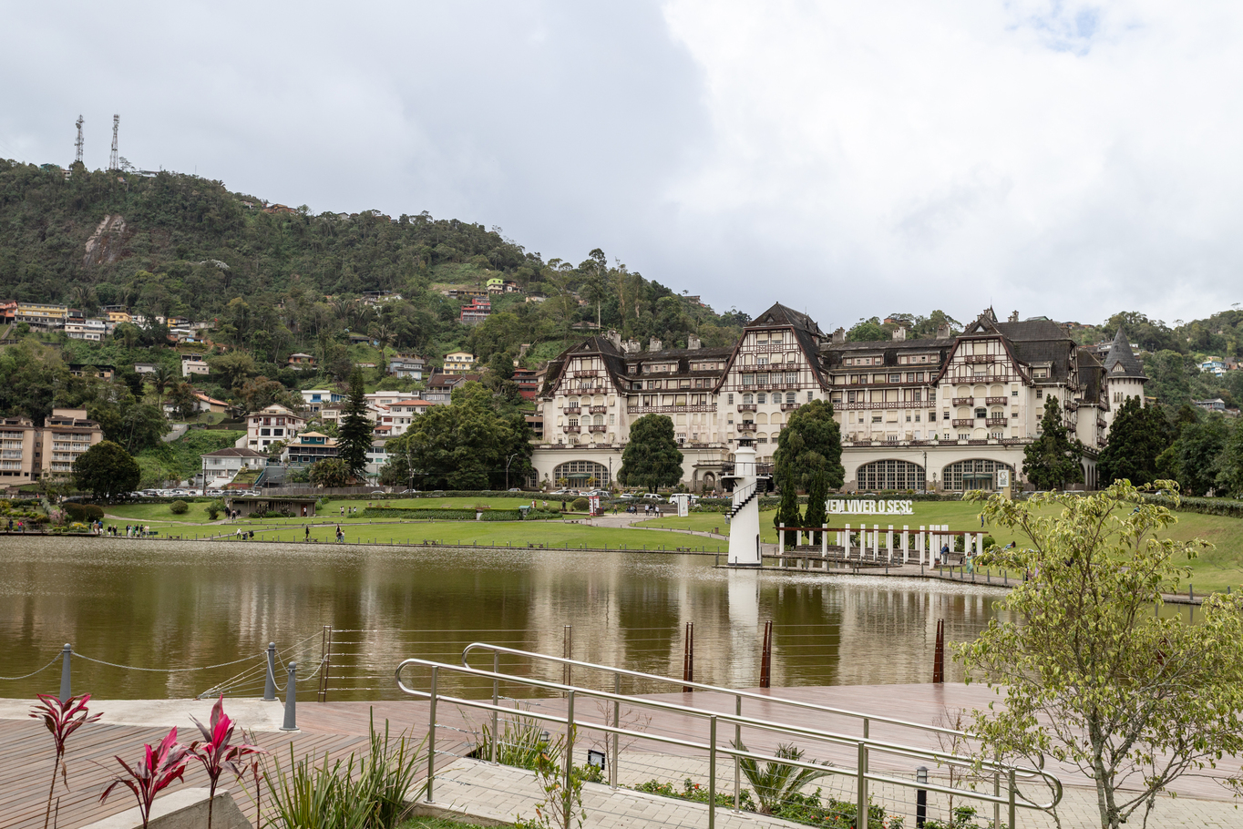 - Ampla varanda com mesa, cadeiras, guarda-sol e vista para o lago do Palácio Quitandinha