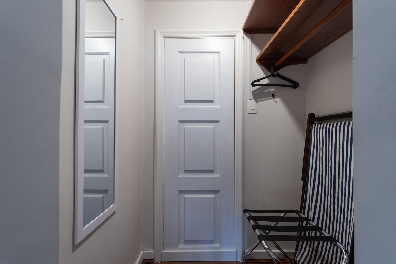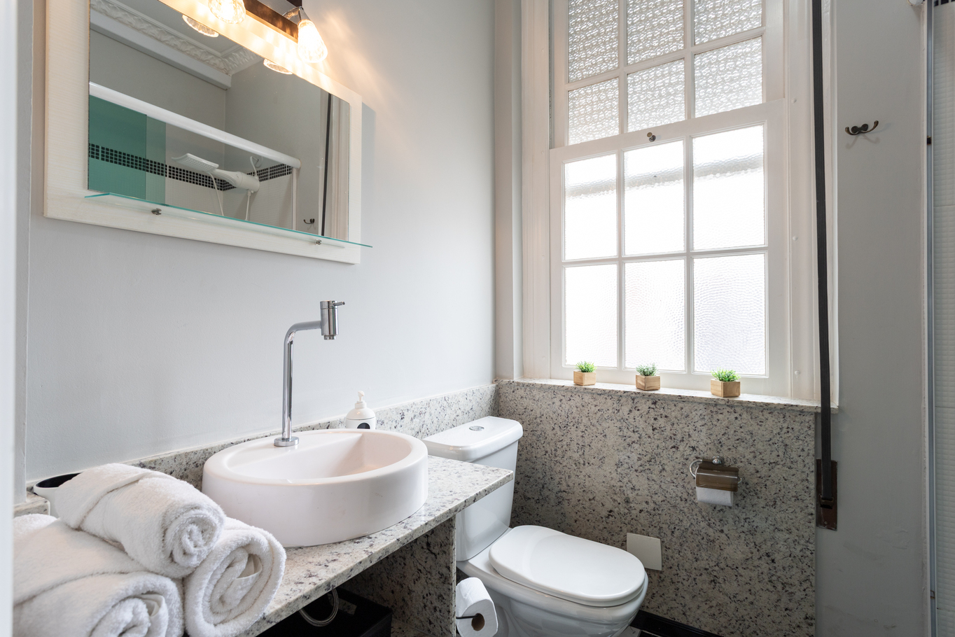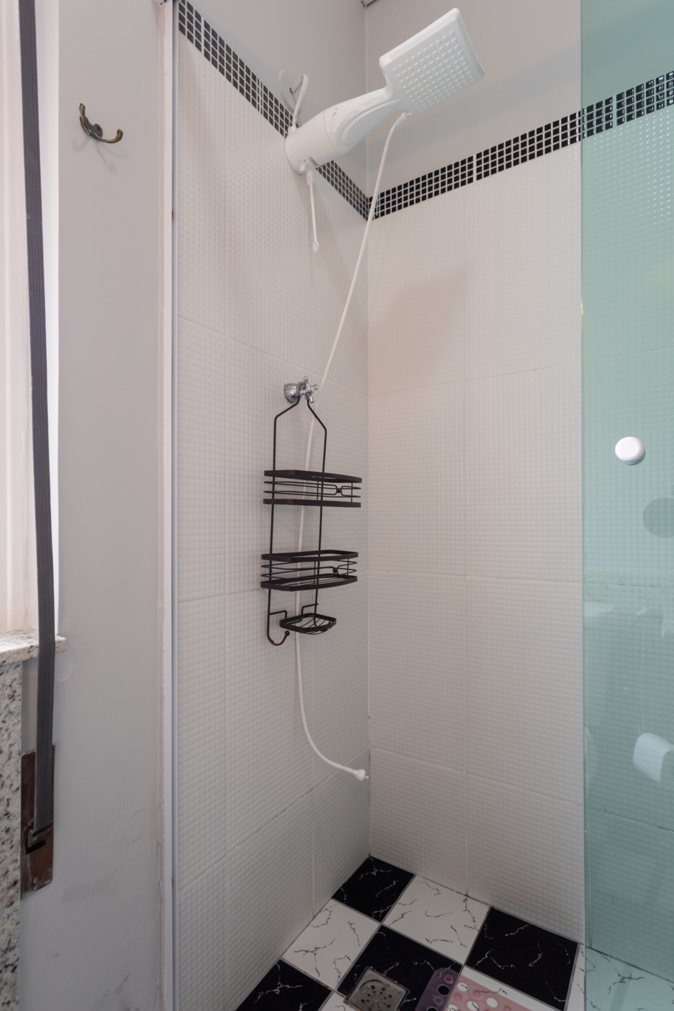 - Banheiro com box de vidro, chuveiro elétrico, secador de cabelo e closet com espelho
