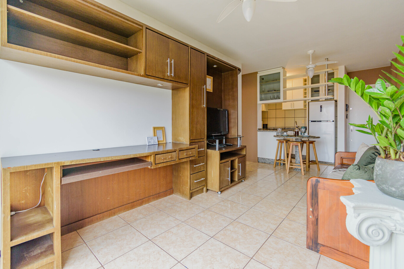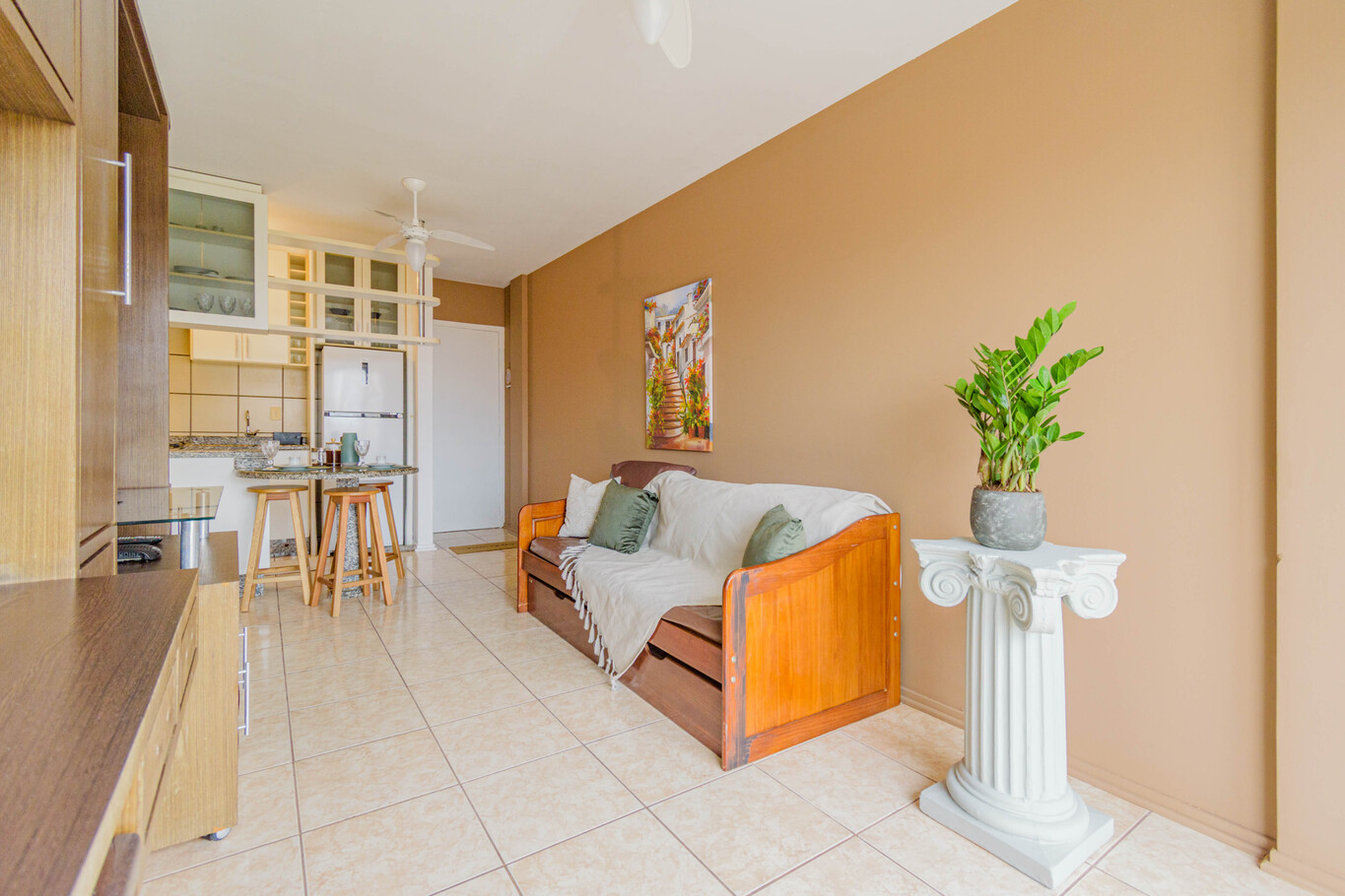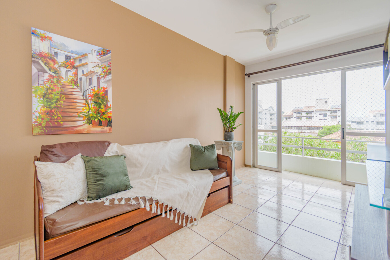 - Sala com sofá-cama, mesa de jantar, Smart TV e ventilador de teto