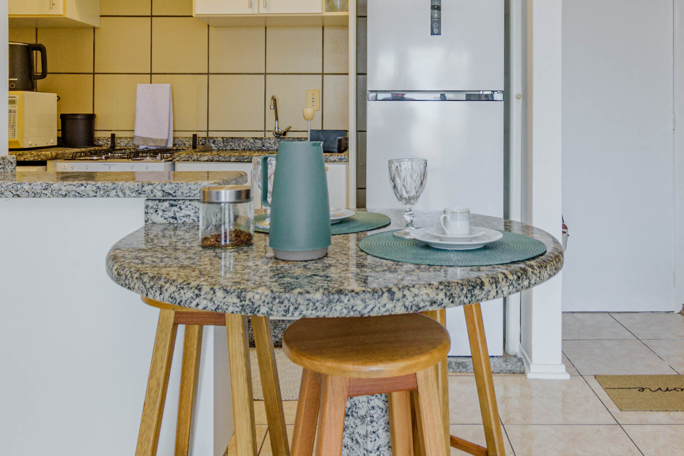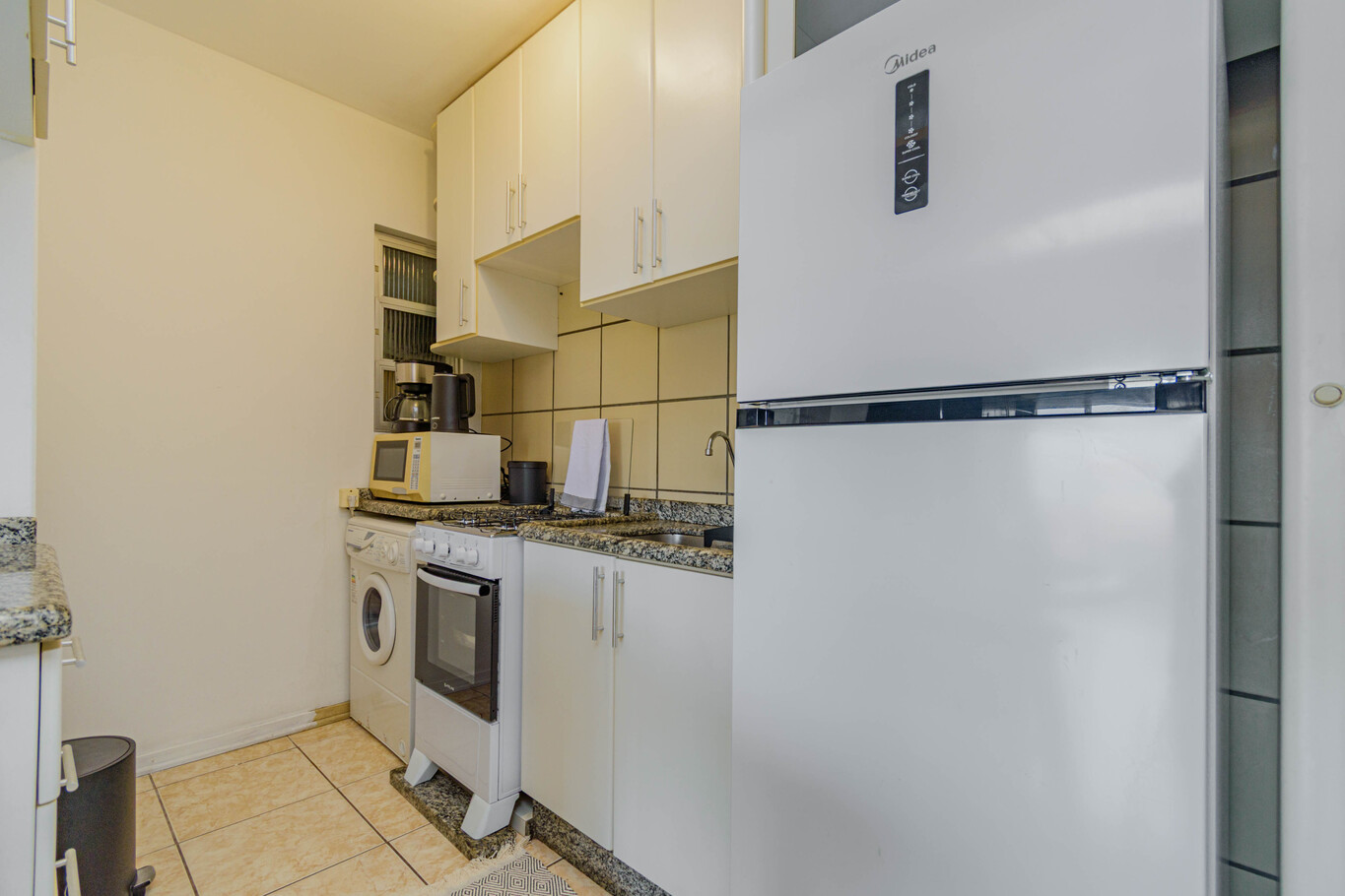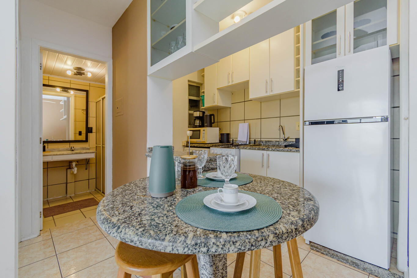 - Cozinha equipada com fogão, forno, geladeira, micro-ondas, cafeteira e utensílios completos para refeições(exceto óleo e sal)