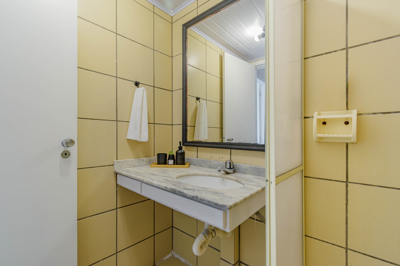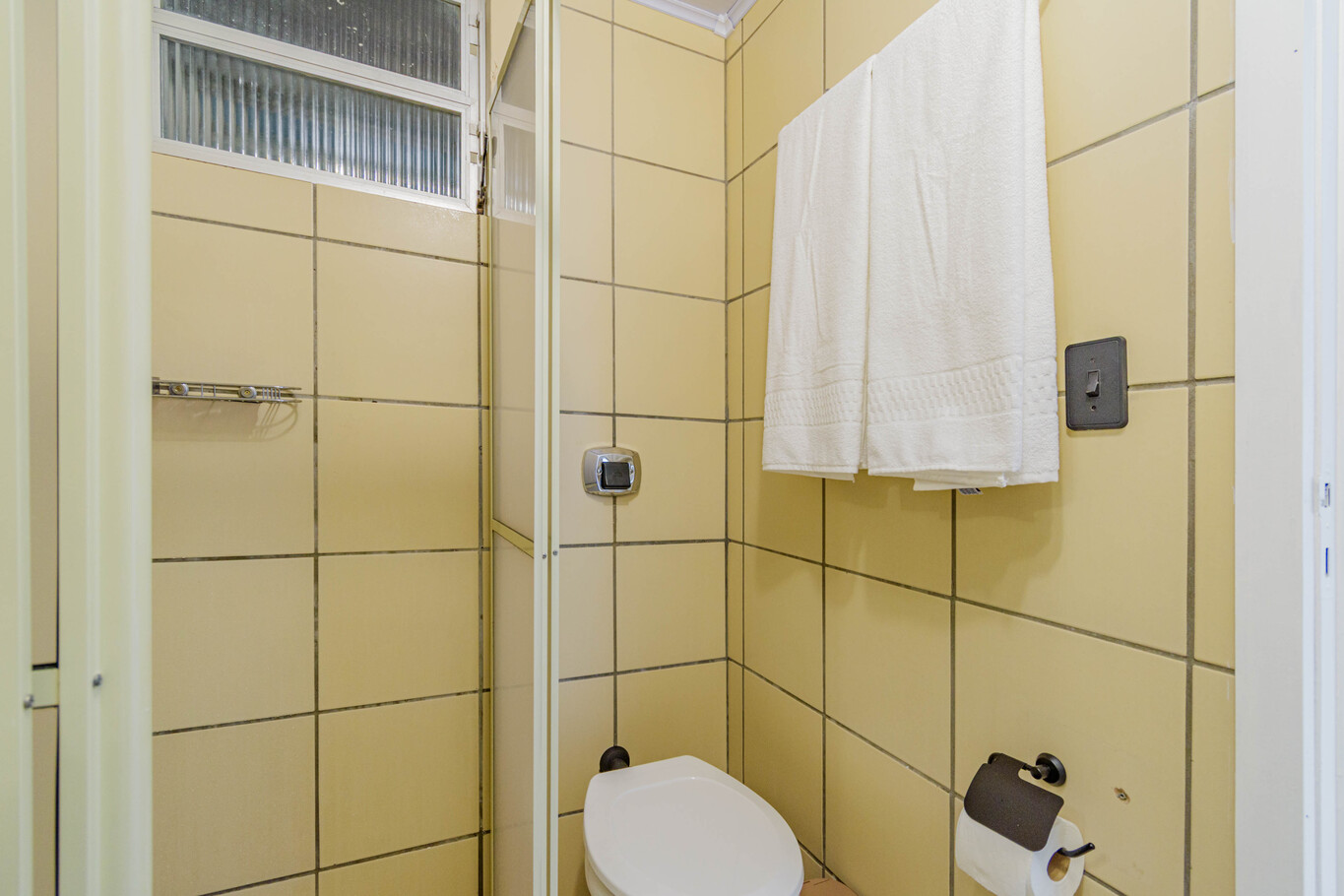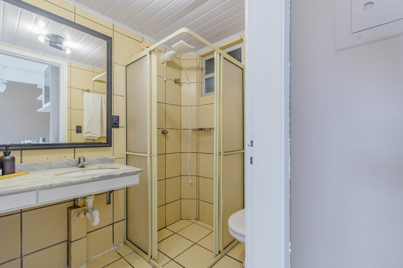 - Banheiro com box, chuveiro elétrico e secador de cabelo