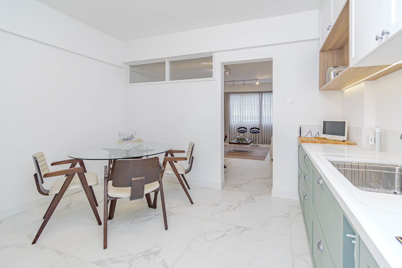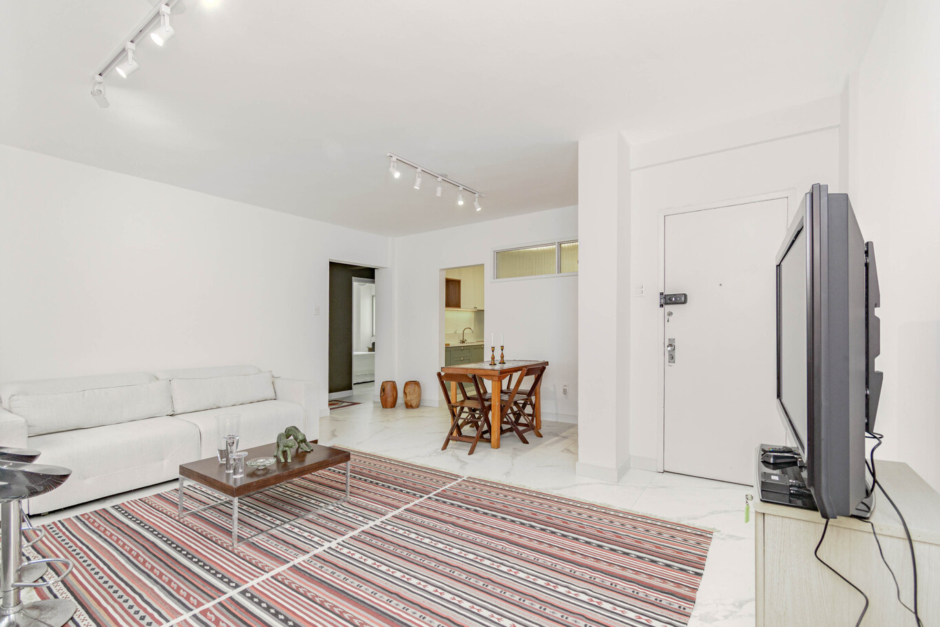 - Sala ampla com sofá, smart TV e mesa de jantar