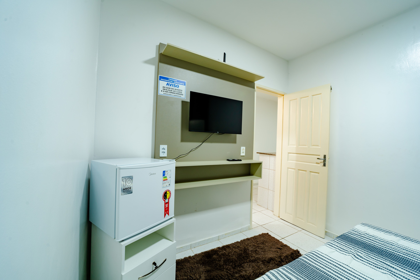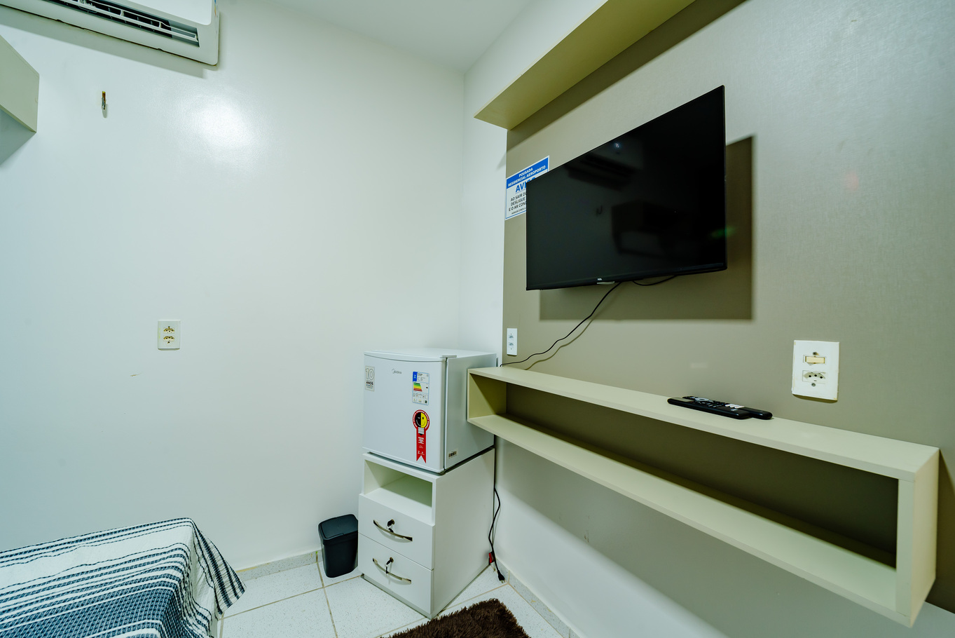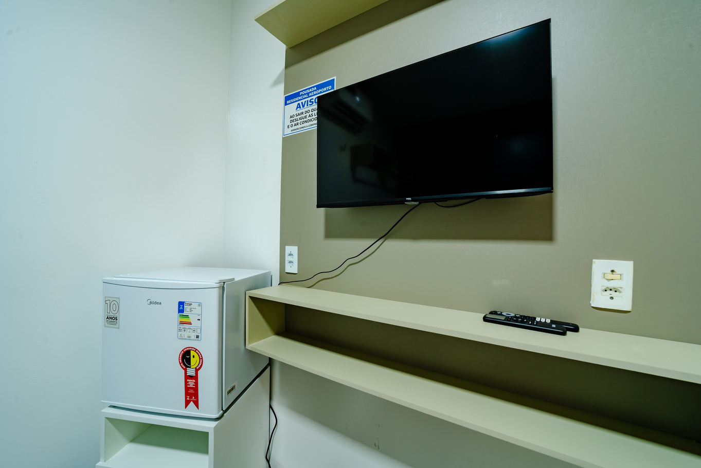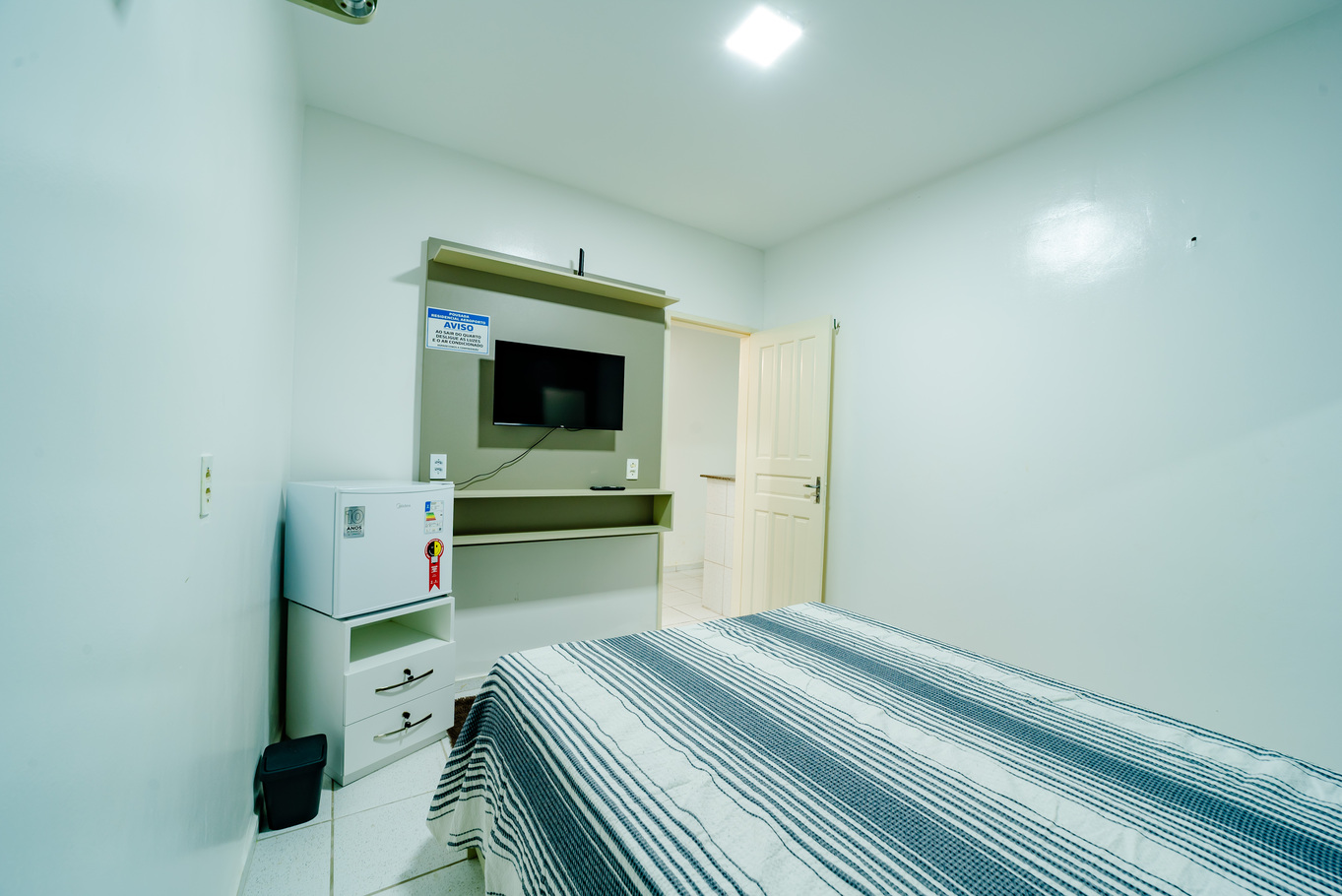 - Quarto com cama de casal, frigobar, ar-condicionado e Smart TV para seu entretenimento