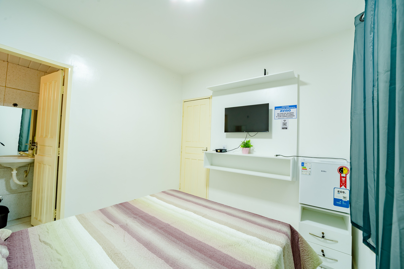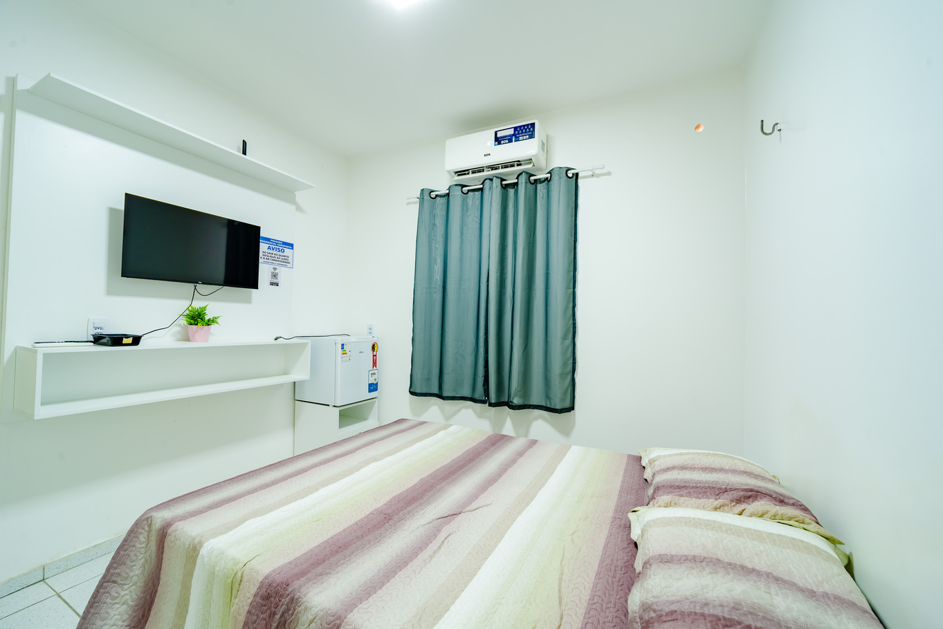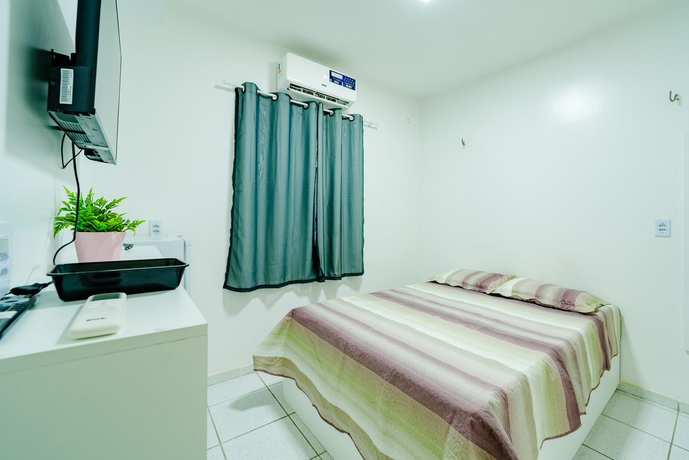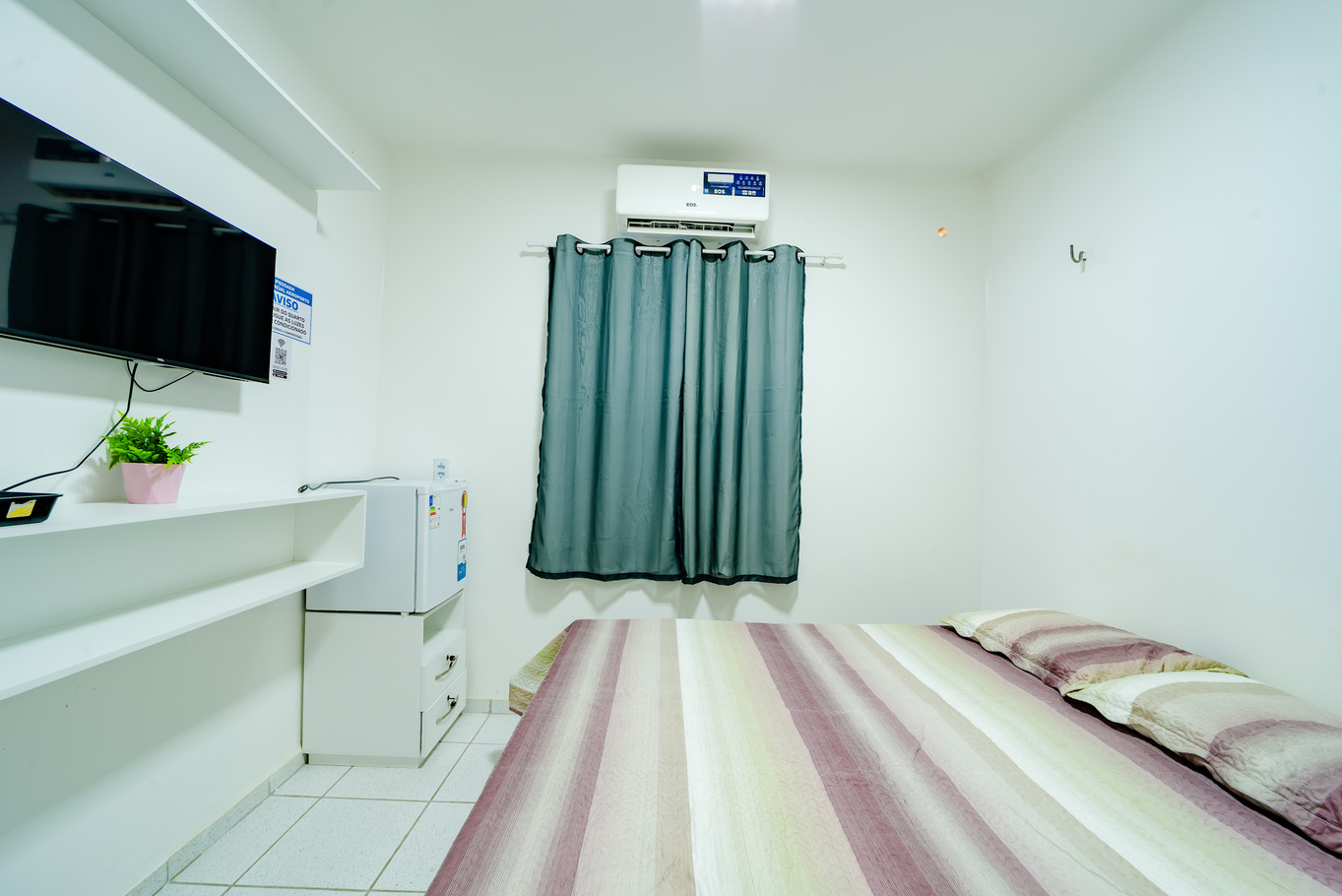 - Quarto com cama de casal, frigobar, ar-condicionado e Smart TV para seu entretenimento