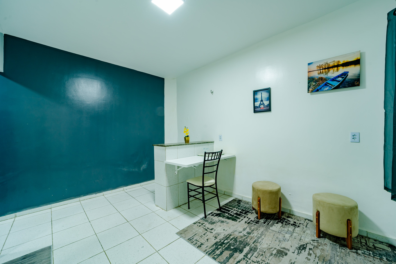 - Sala com puffs e bancada multifuncional para refeições e trabalho