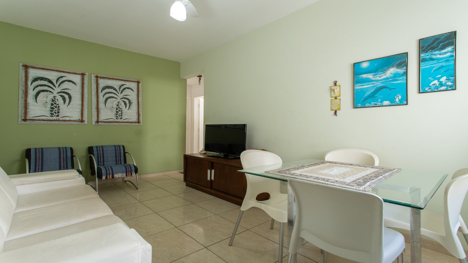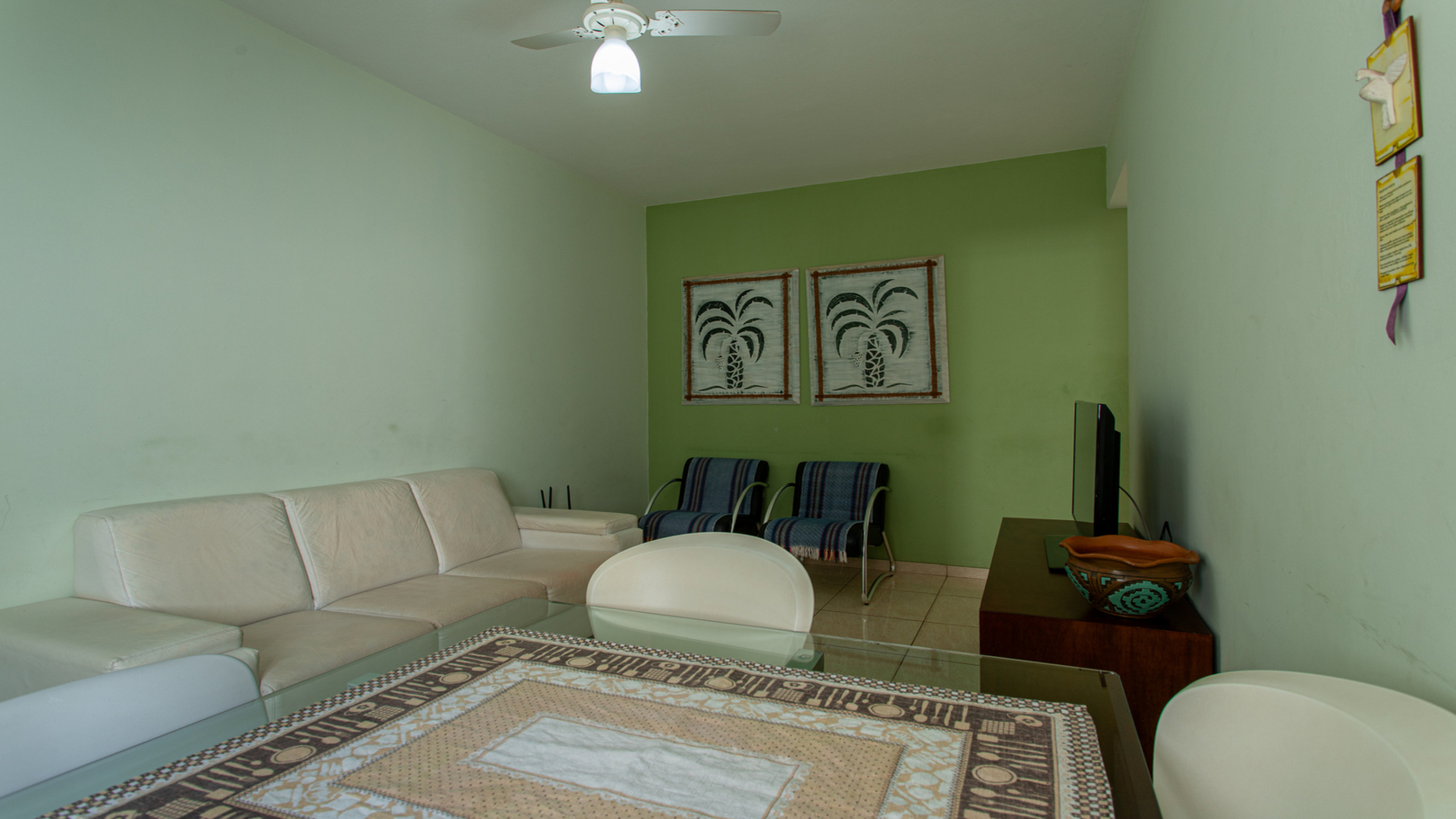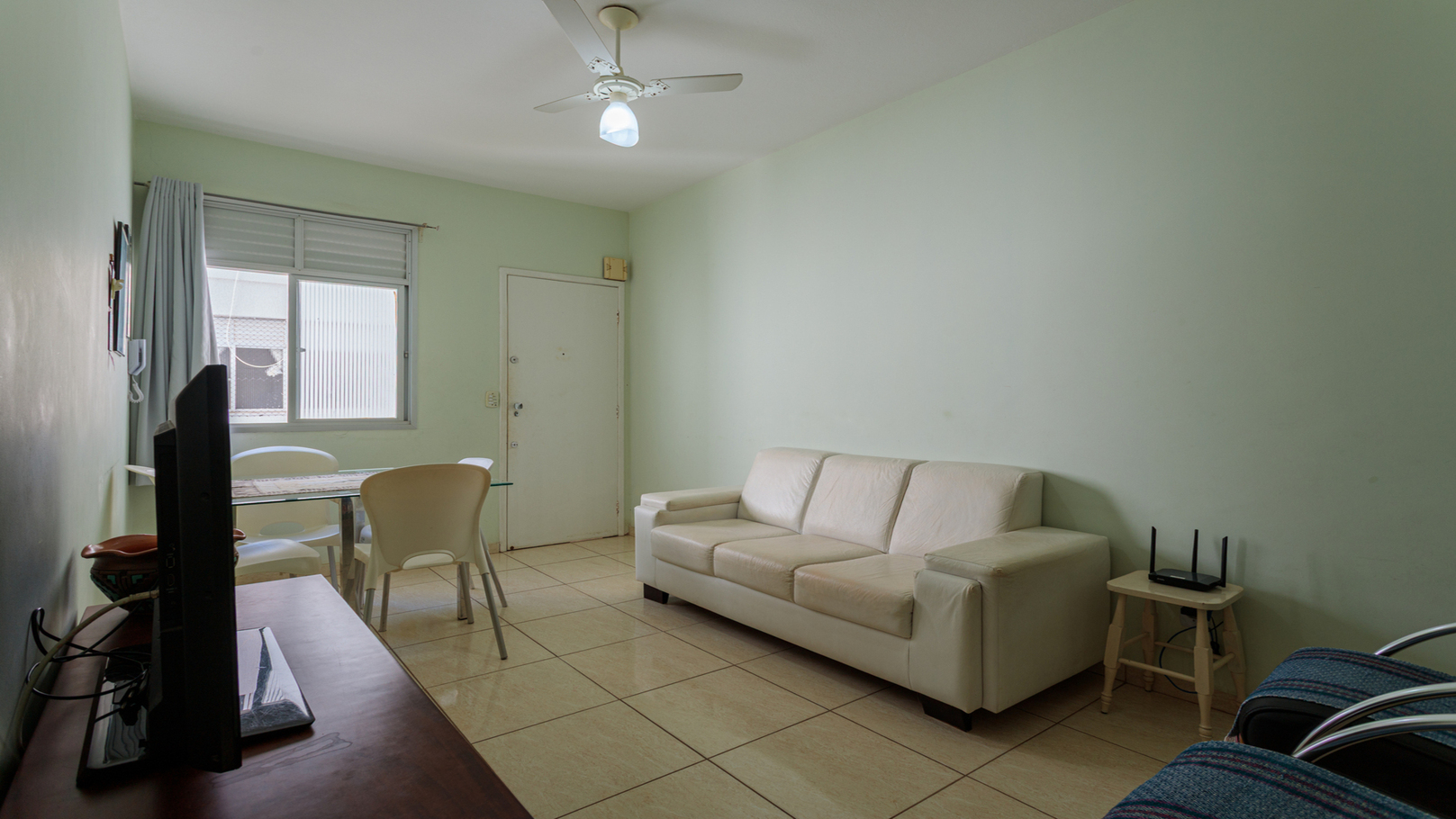 - Sala integrada com mesa de jantar, sofá, poltrona, TV e ventilador de teto, oferecendo praticidade e circulação confortável