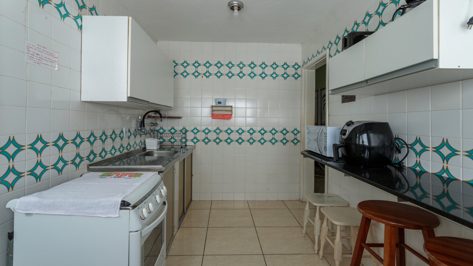 - Cozinha equipada com fogão, forno, geladeira, micro-ondas, fritadeira, torradeira, cafeteira, liquidificador e utensílios diversos(exceto óleo e sal)