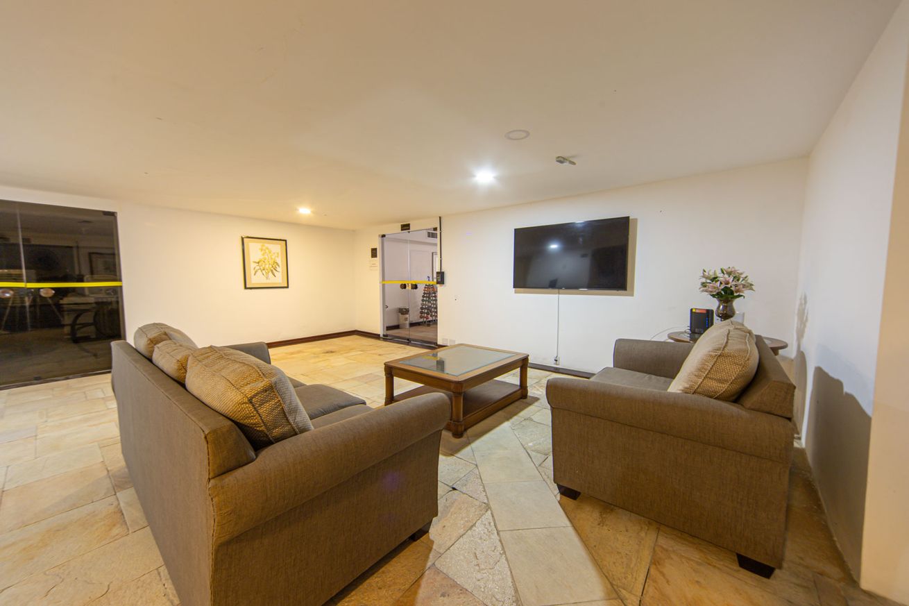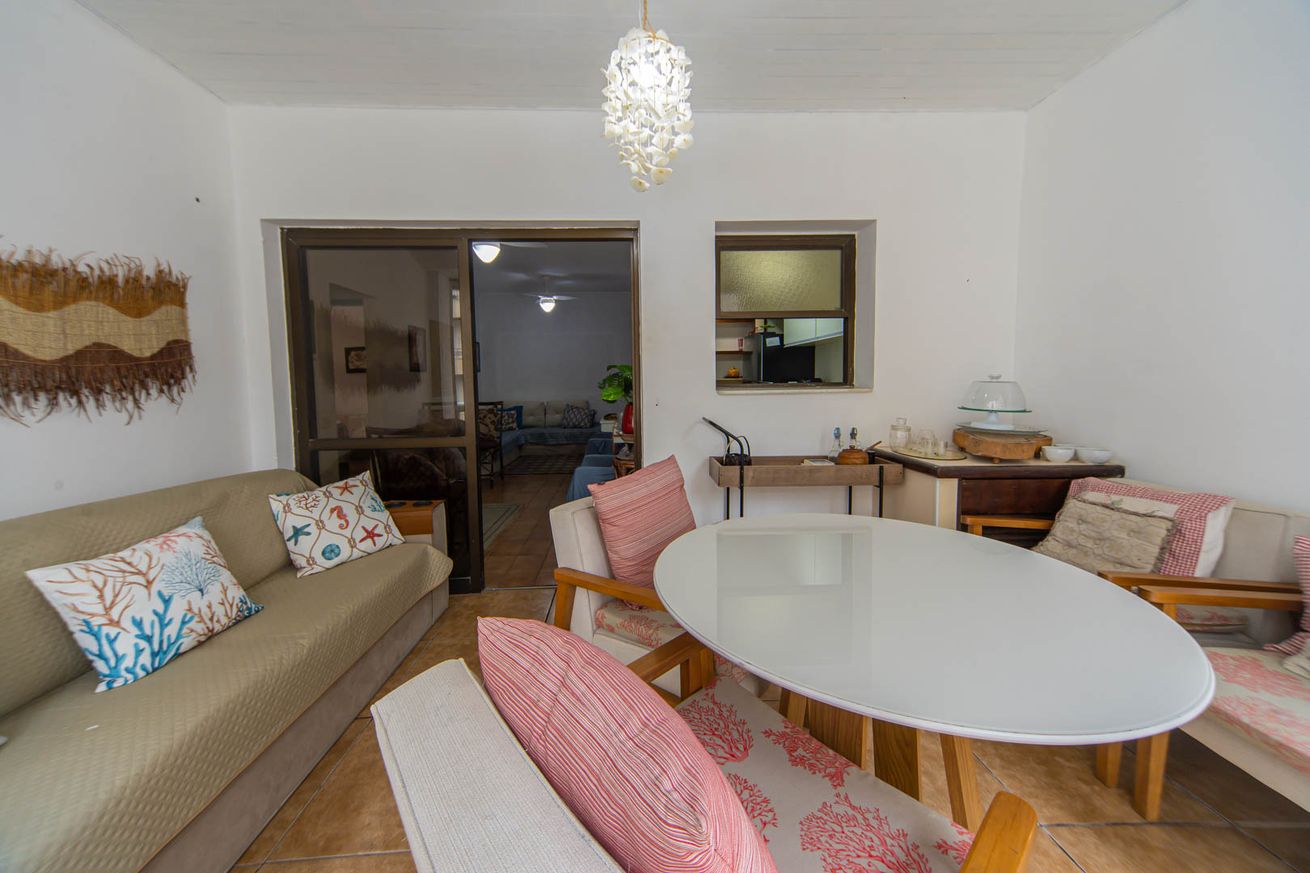- Sala bem iluminada e completa com sofás confortáveis, Smart TV, mesa de jantar e decoração acolhedora