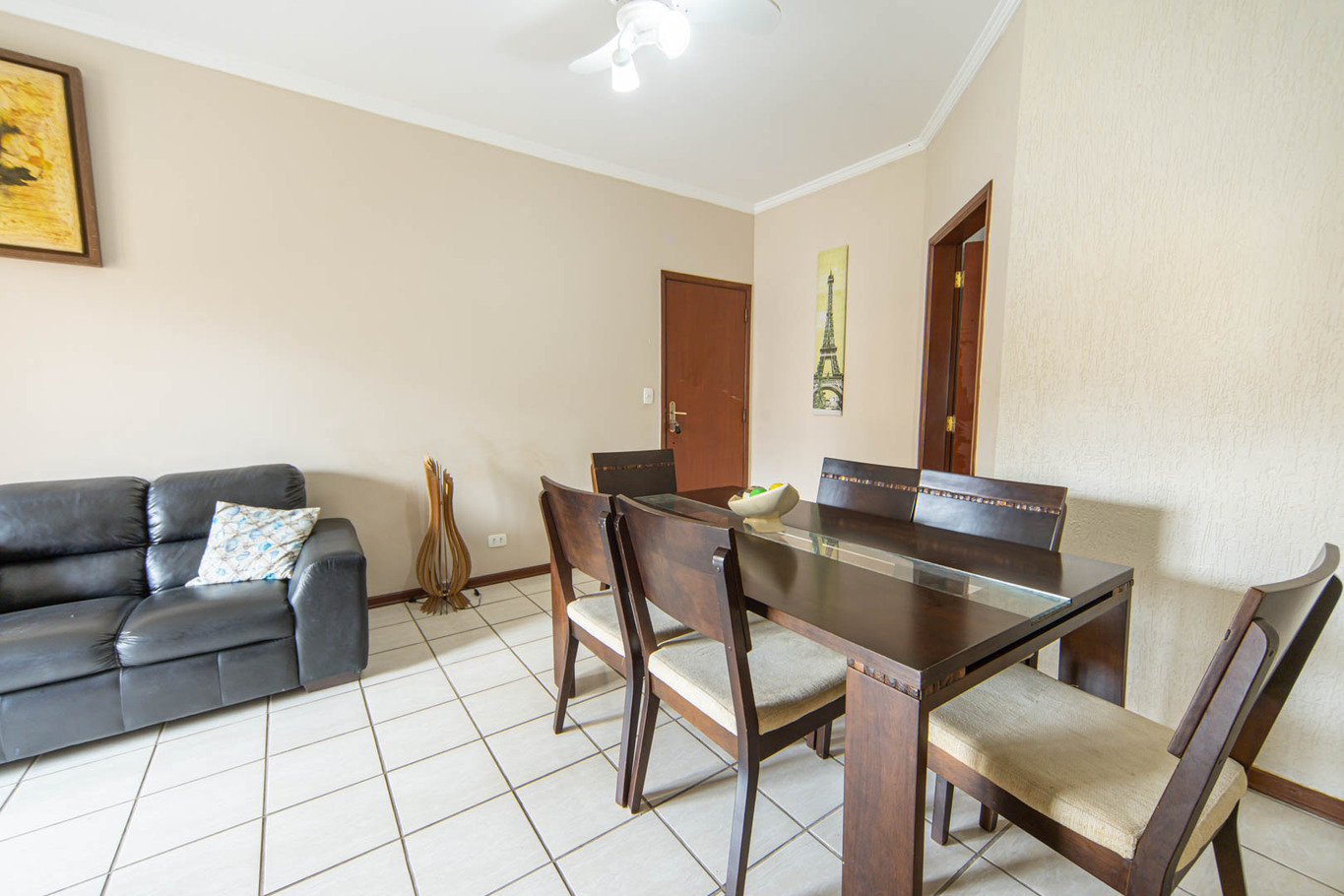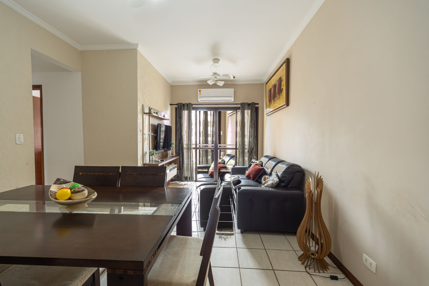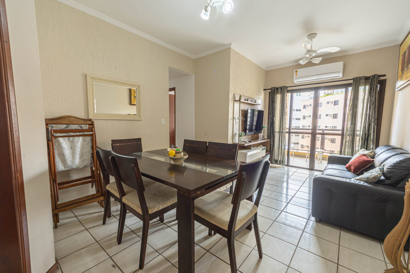 - Sala com ar-condicionado, smart TV, sofá, poltrona, mesa de jantar e varanda