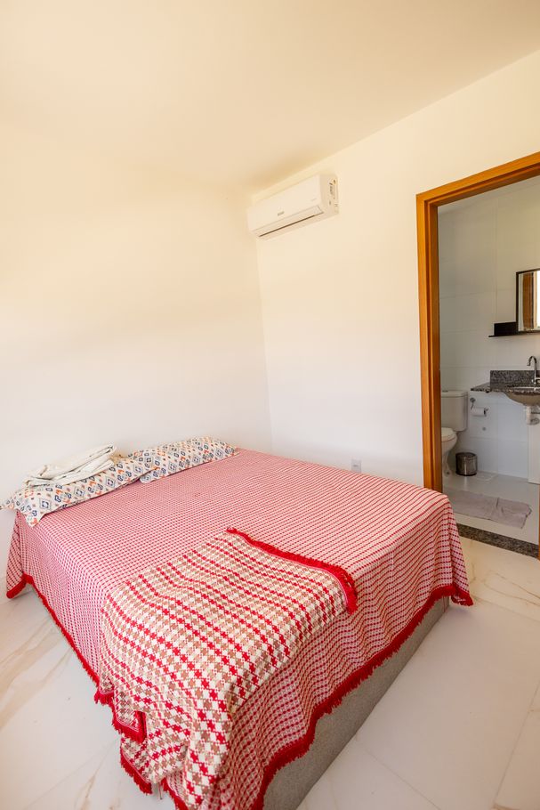- Quarto 1(suíte): 1 cama de casal, ar-condicionado e armário tipo arara, banheiro privativo com chuveiro elétrico e box