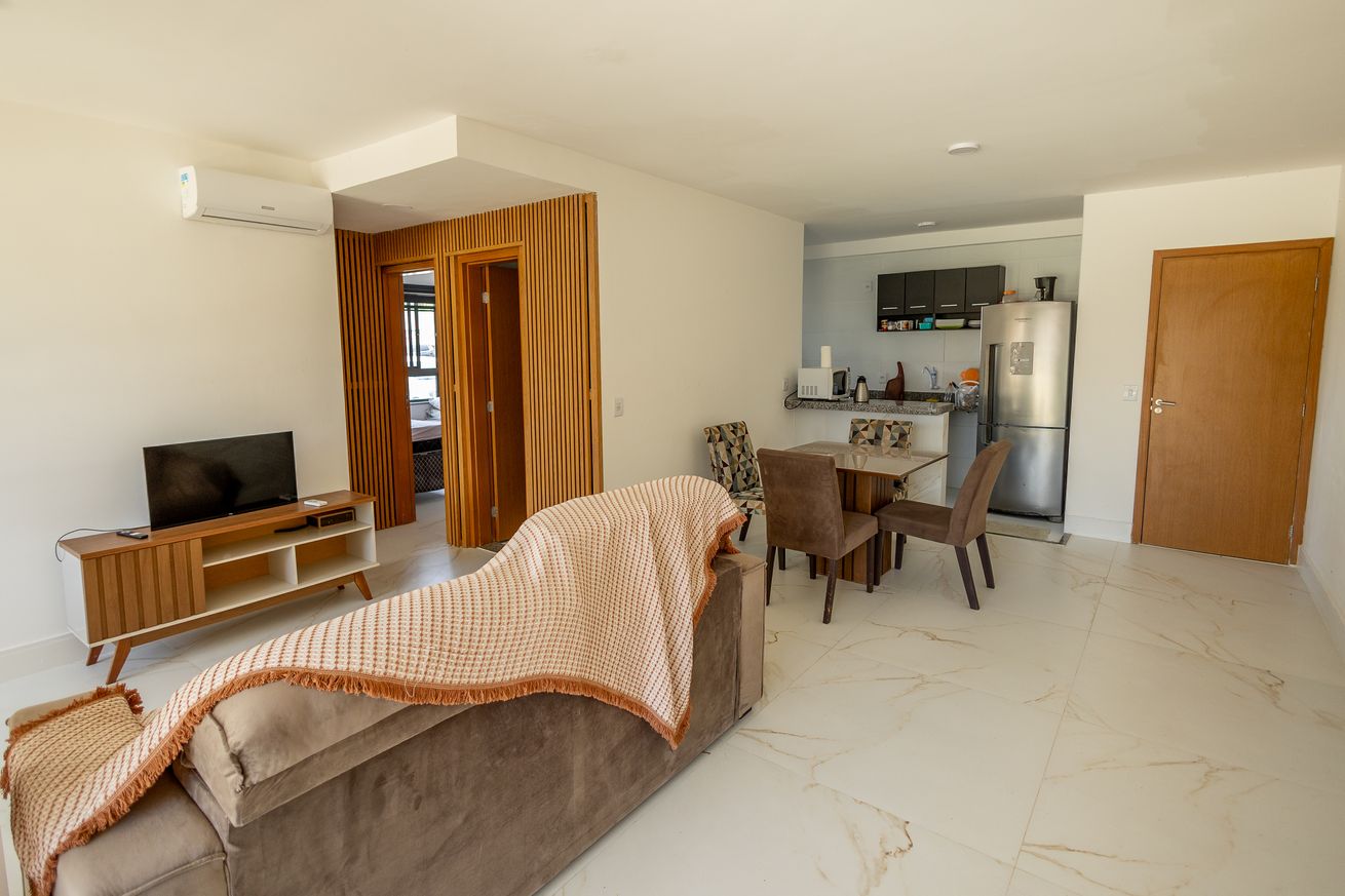 - Sala e convivência com sofá confortável, smart TV, ar-condicionado, mesa de jantar para 4 pessoas