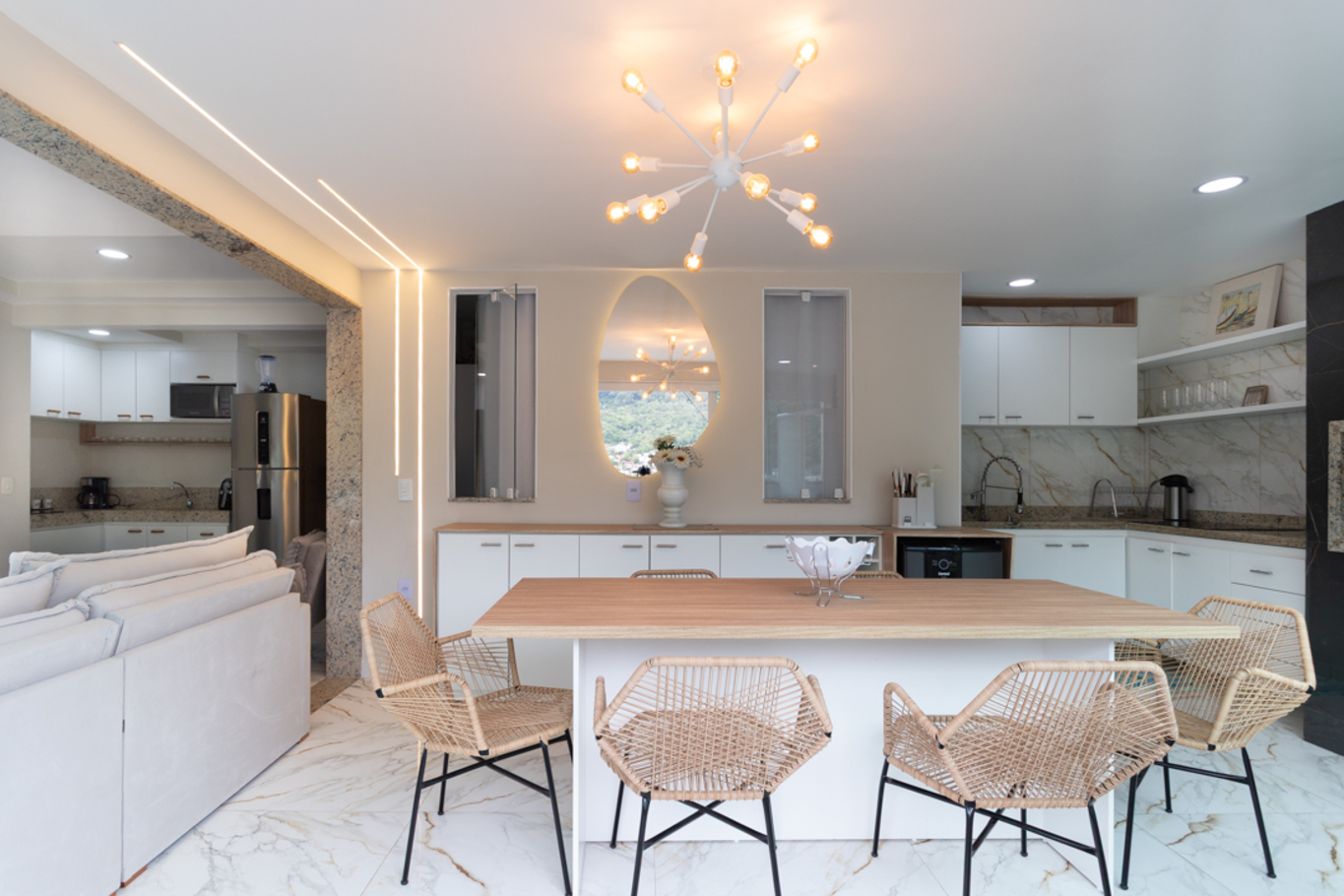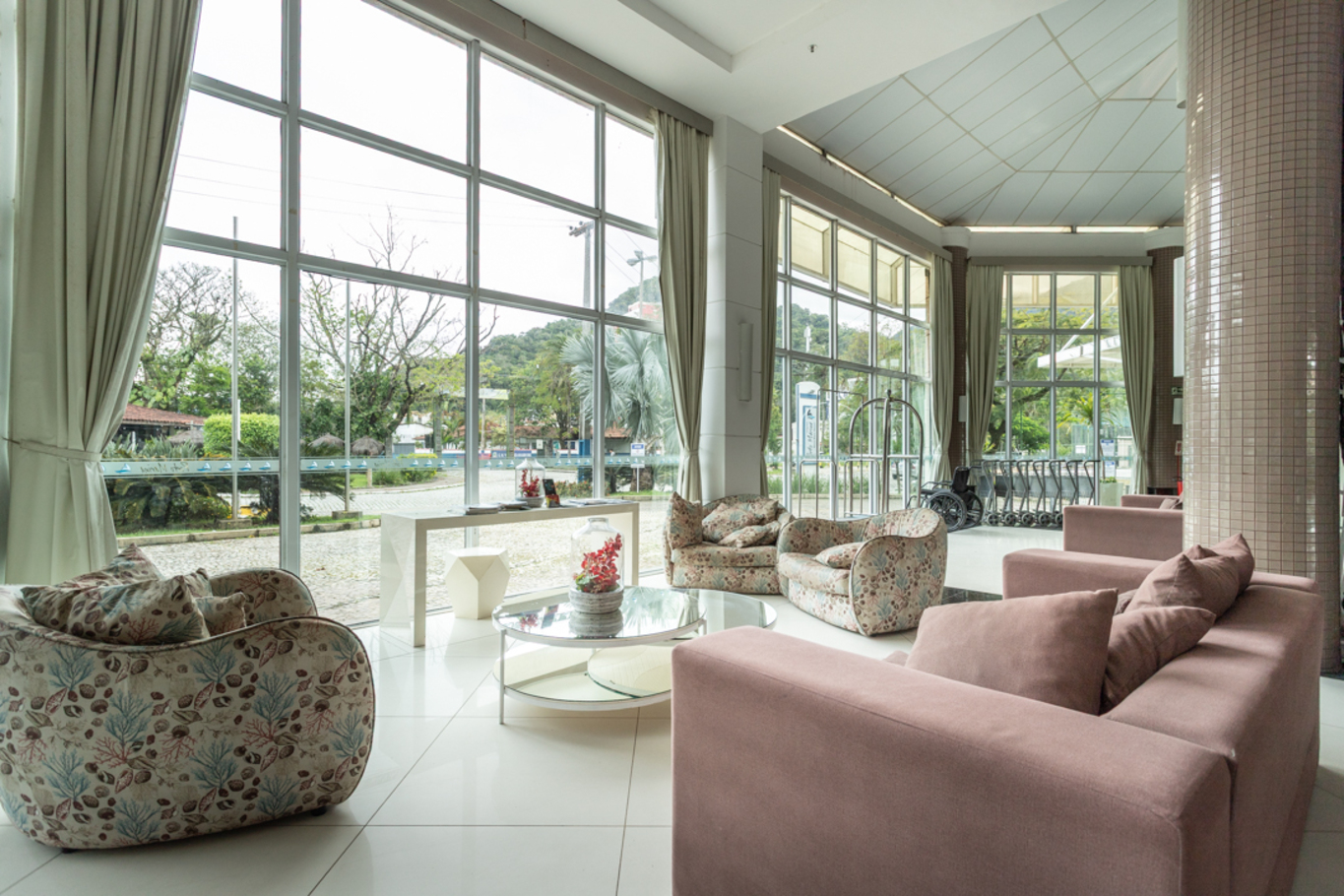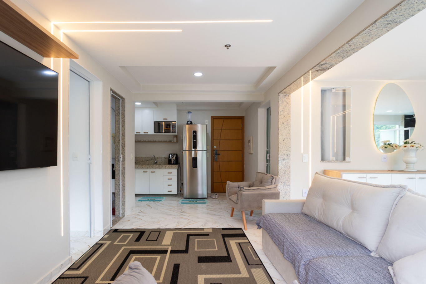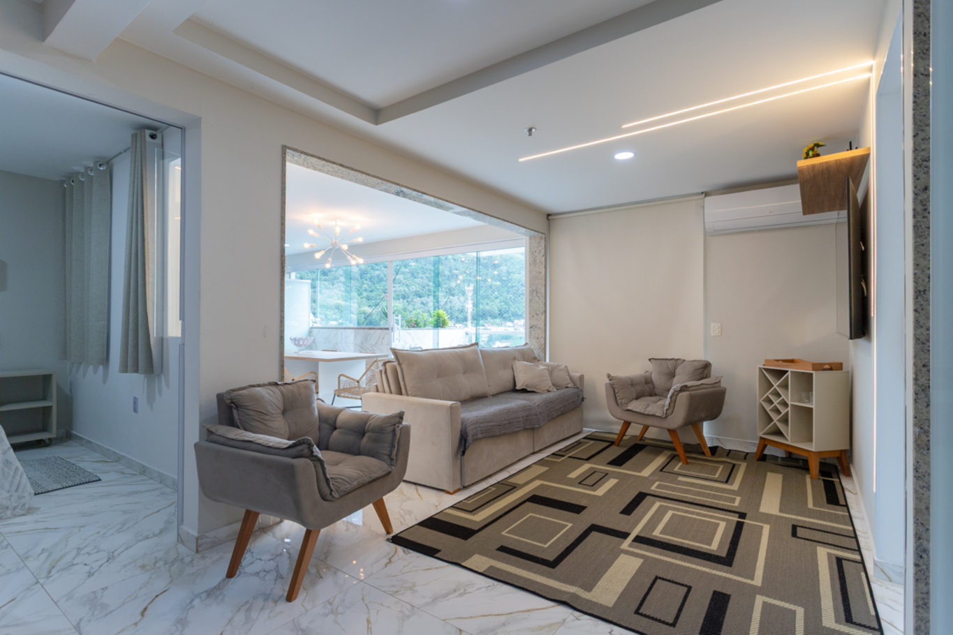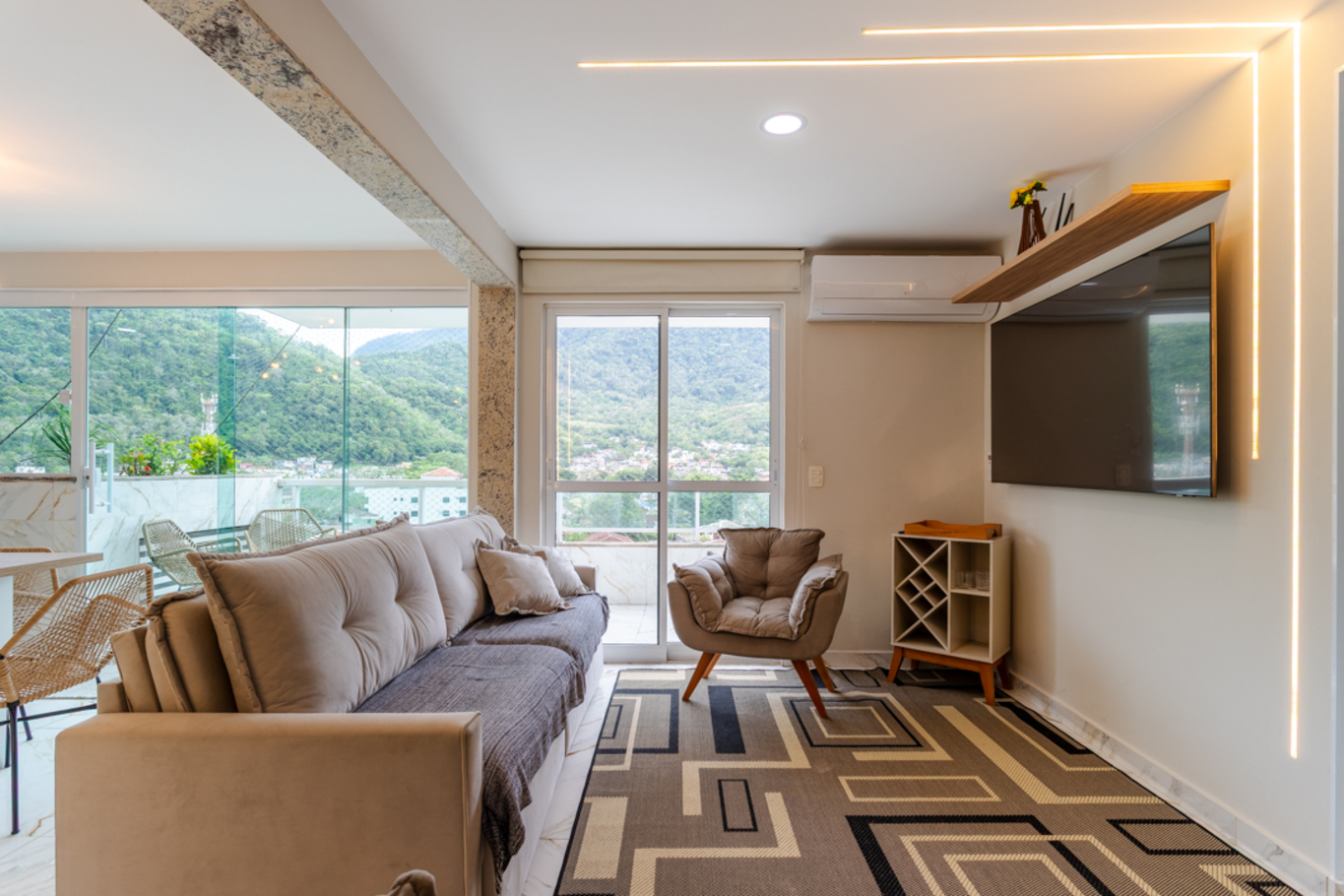 - Sala climatizada com smart TV, poltrona e sofá-cama