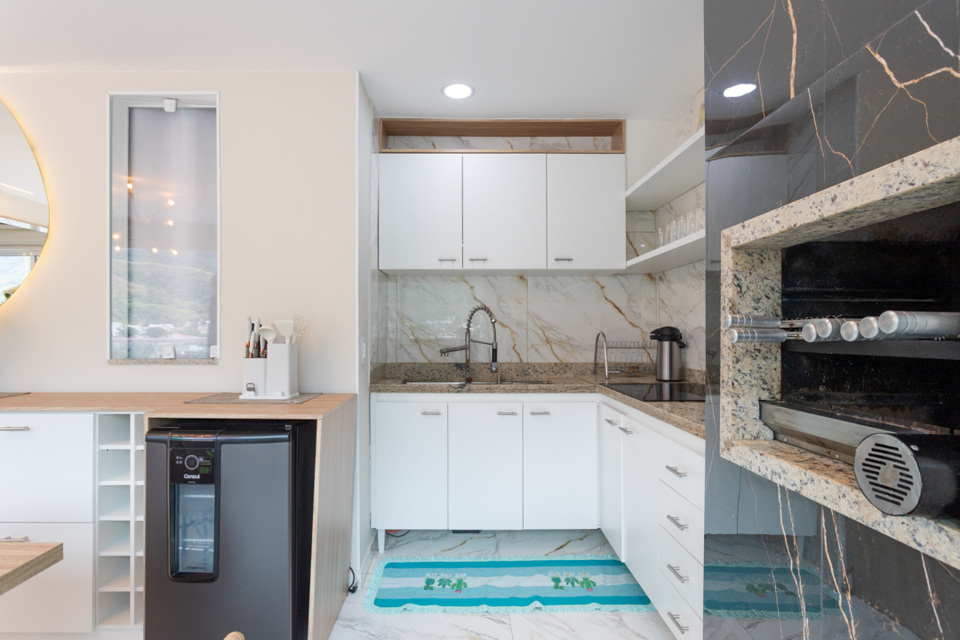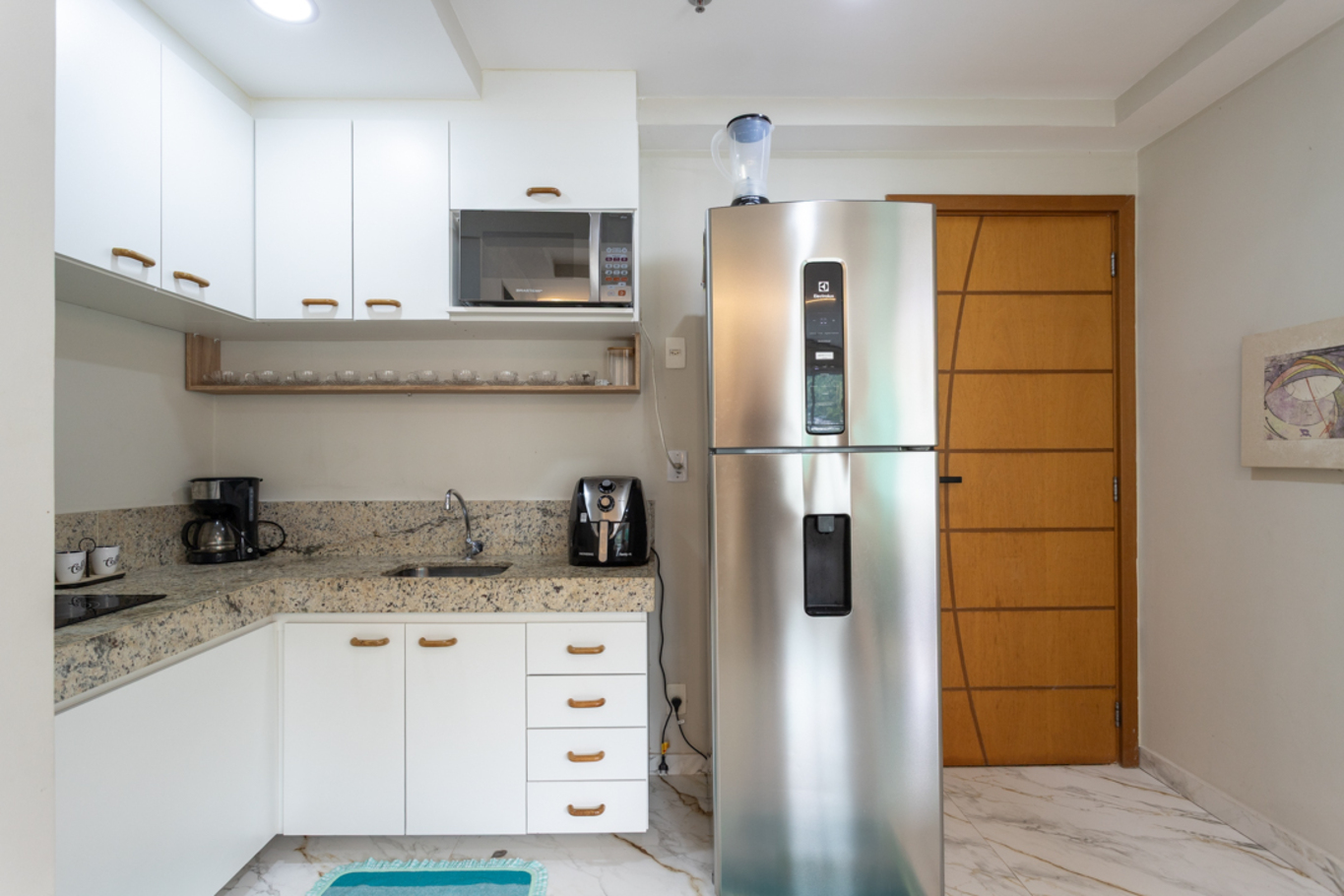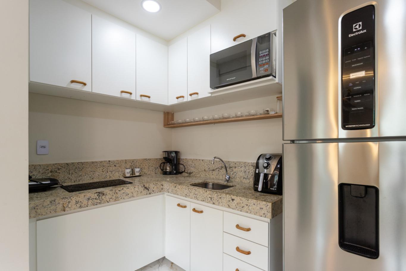- Cozinha equipada com fogão, geladeira, microondas, cafeteira, mesa de jantar e utensílios(exceto óleo e sal)