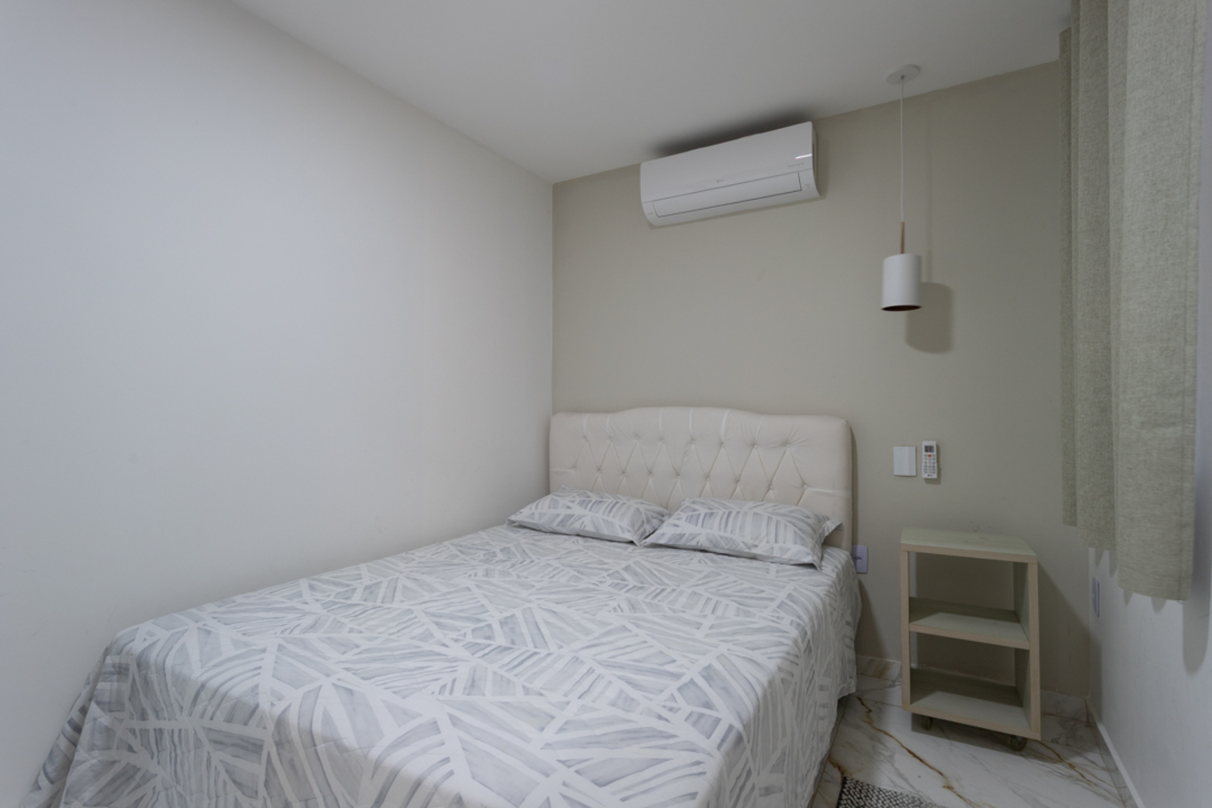 - Quarto 1: cama de casal, ar-condicionado, armário, edredom, protetor de colchão e roupa de cama