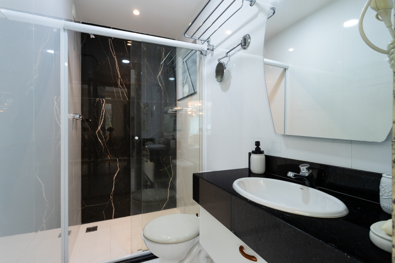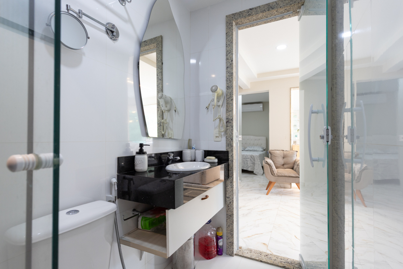 - Banheiro com box de vidro, chuveiro elétrico e secador de cabelo