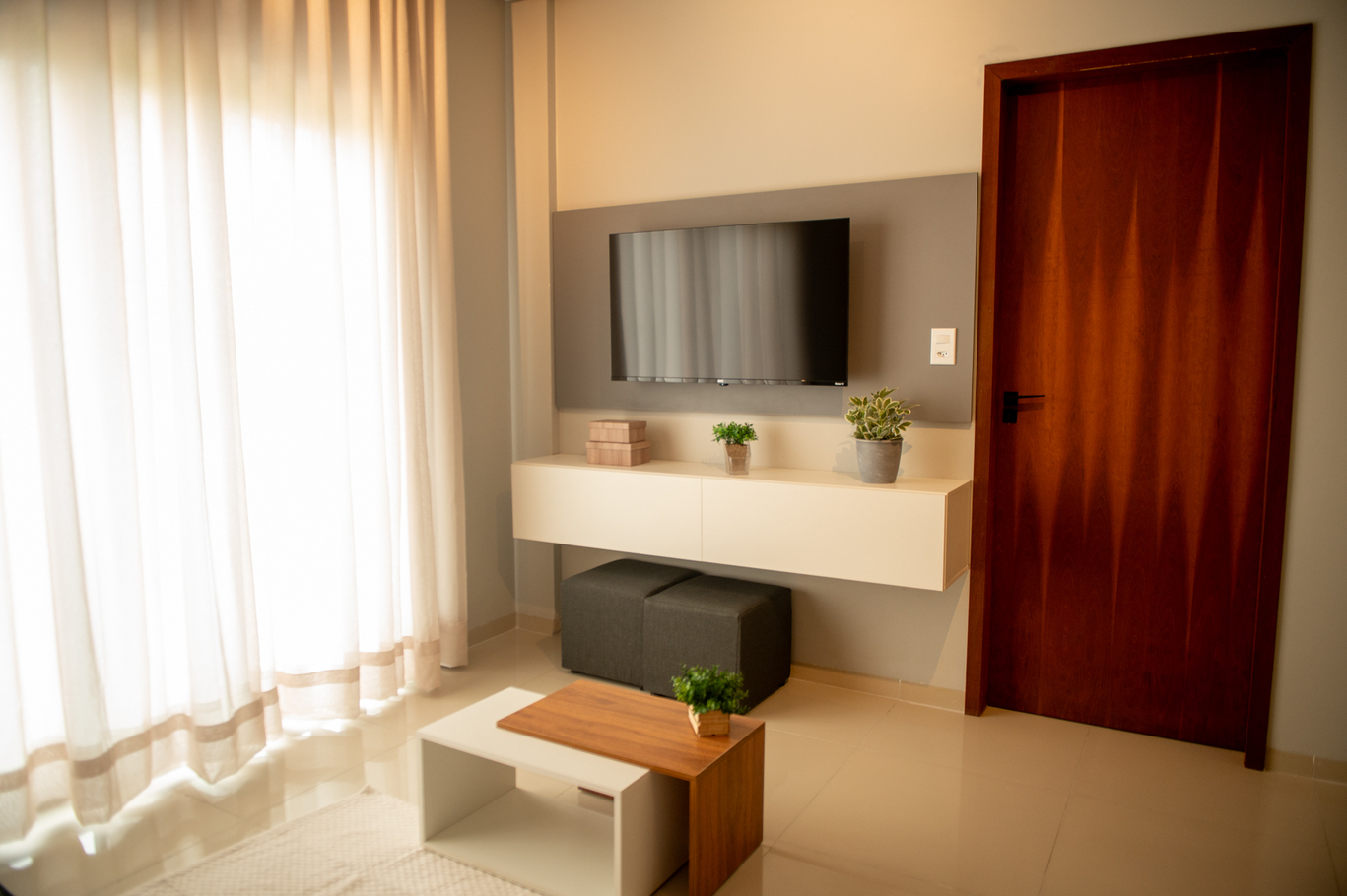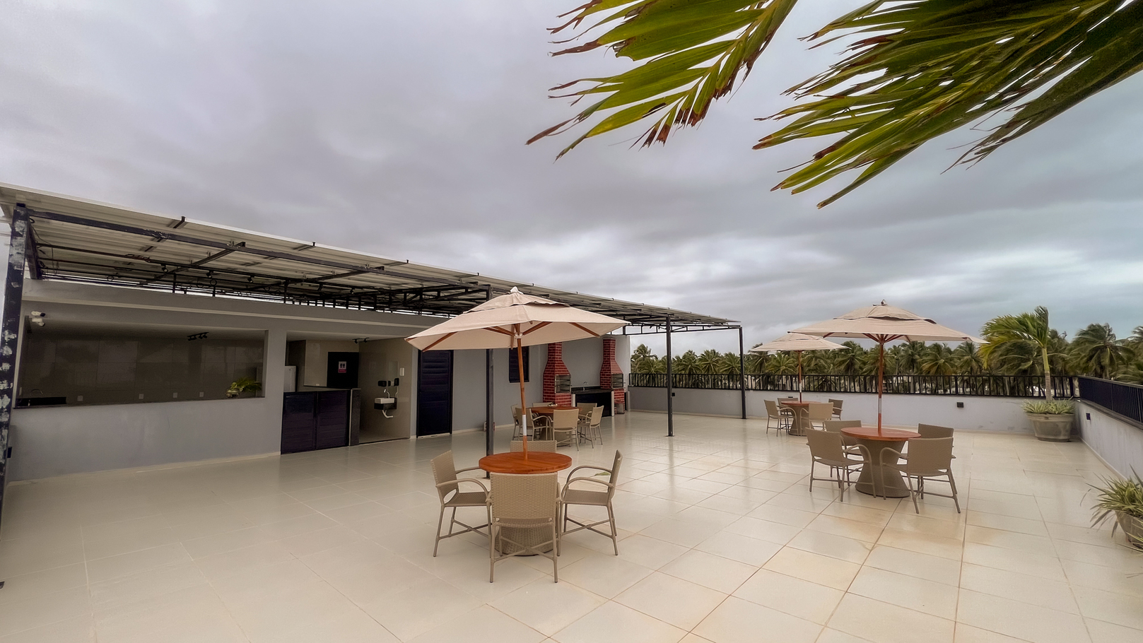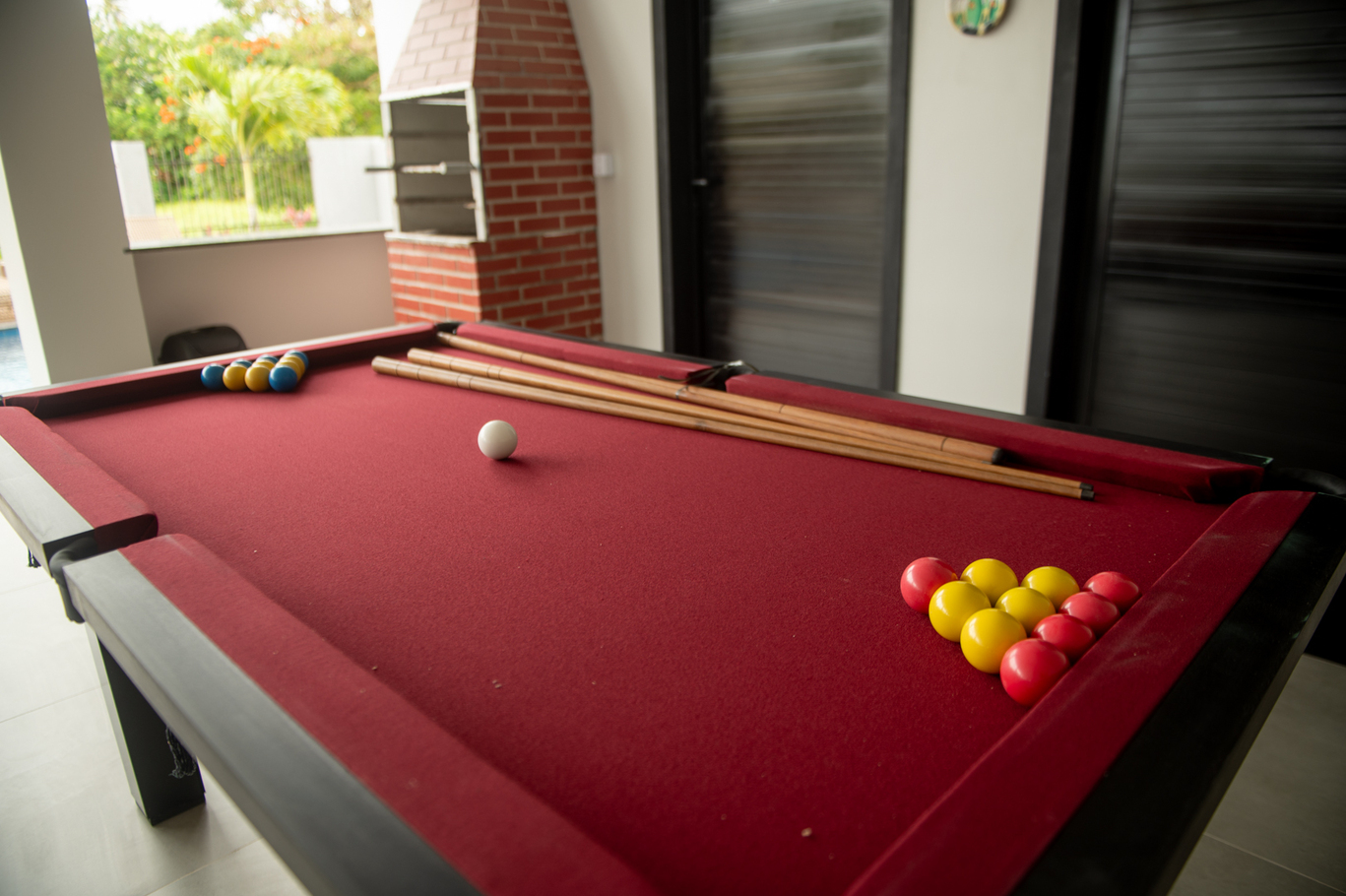 - Área de lazer com piscina, churrasqueira, espreguiçadeiras, Smart TV e salão de jogos