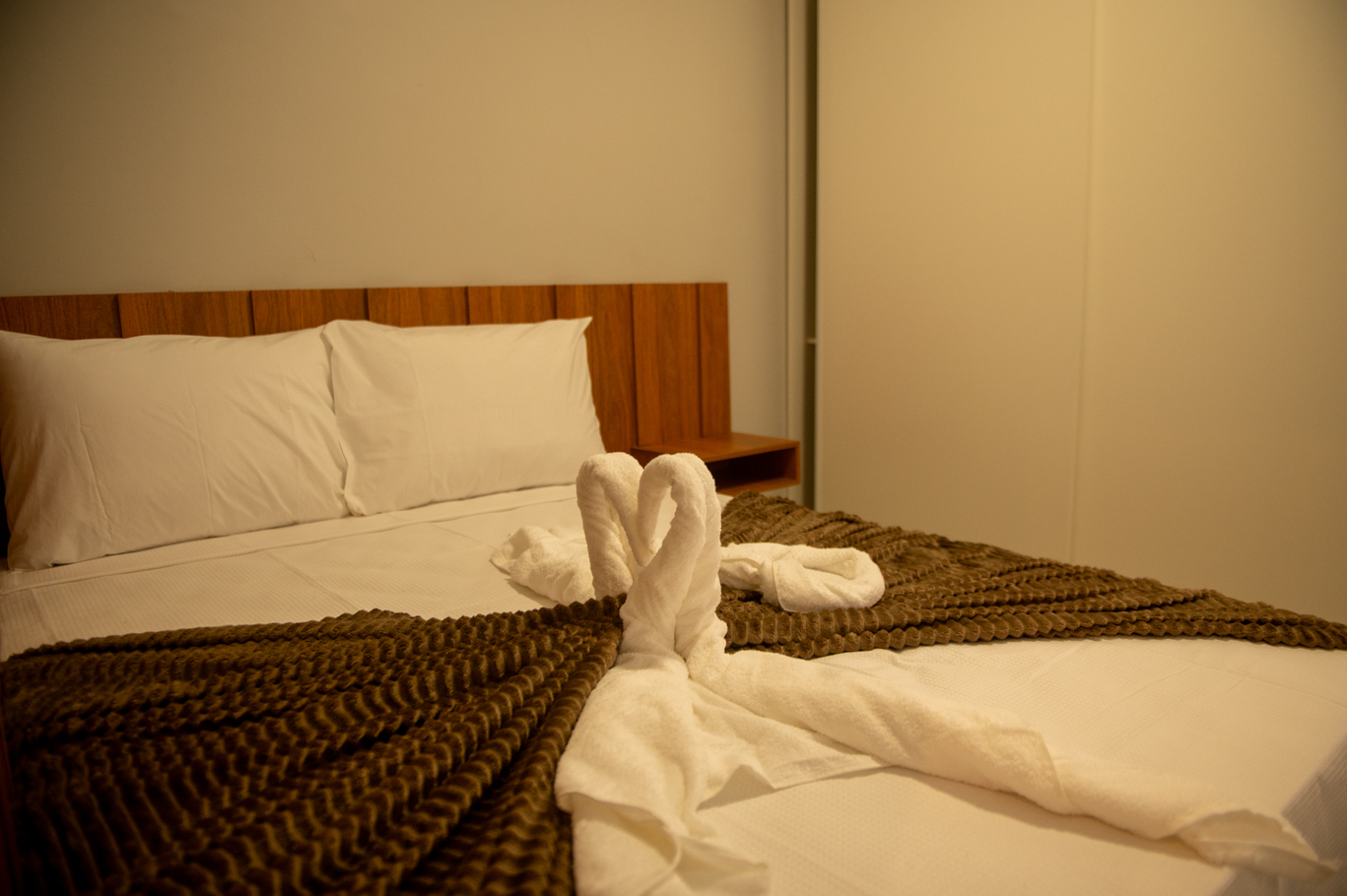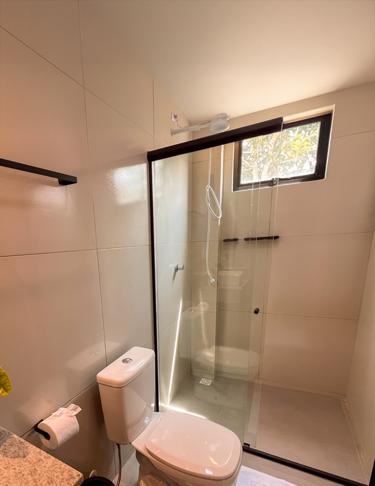 - Quarto 1 (suíte): cama queen, ar-condicionado e banheiro com box de vidro