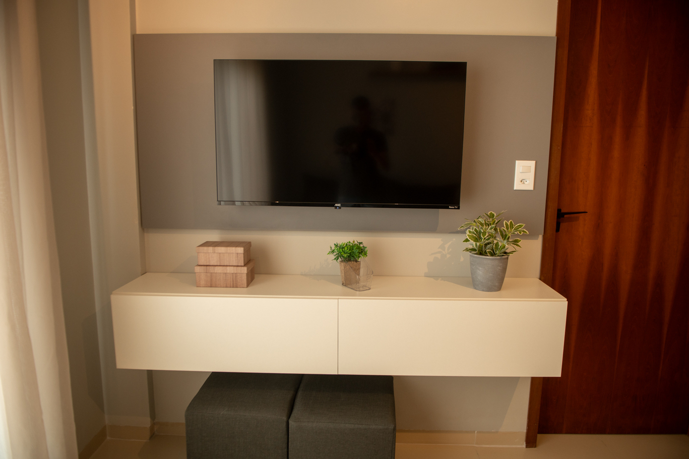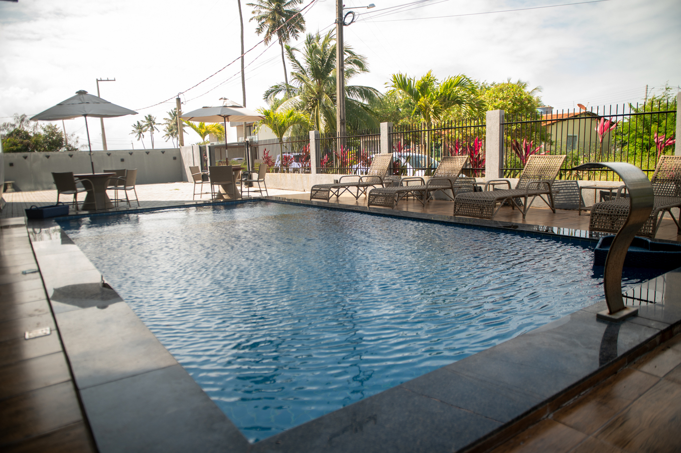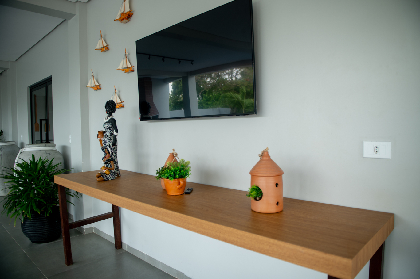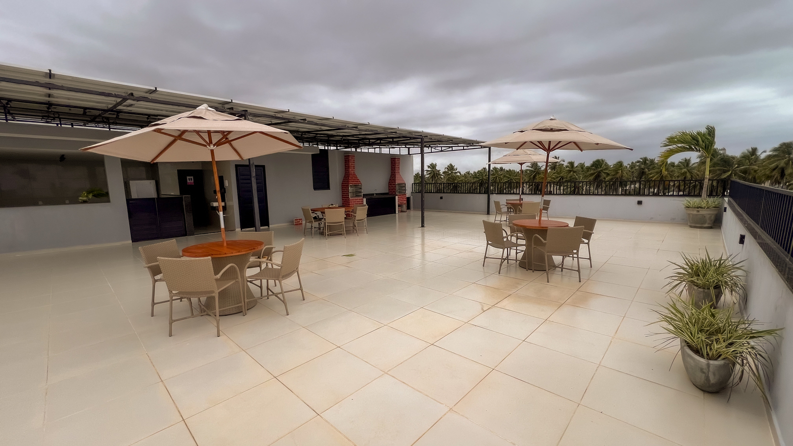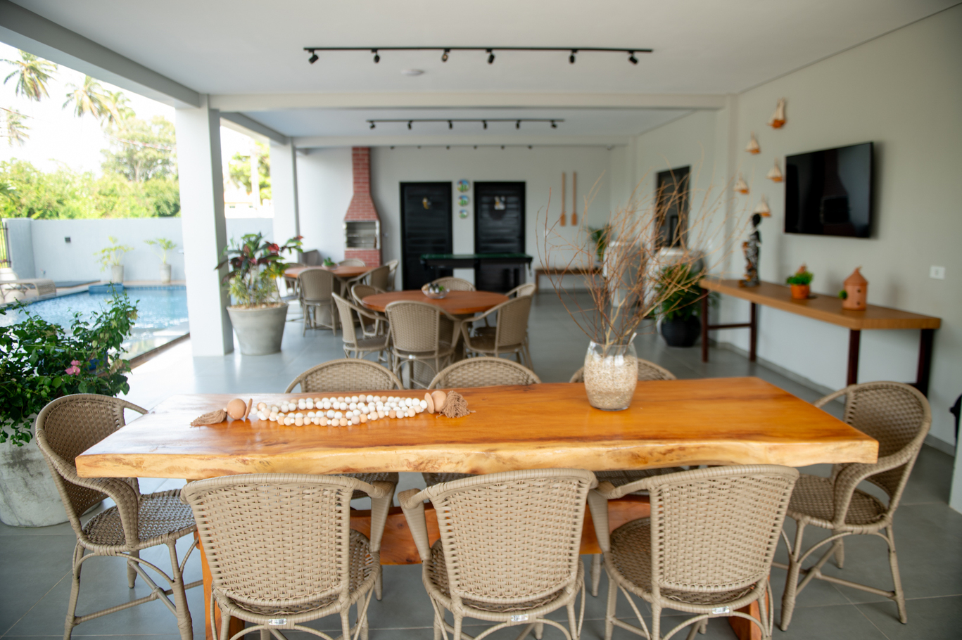 - Área de lazer com piscina, churrasqueira, espreguiçadeiras, Smart TV e salão de jogos