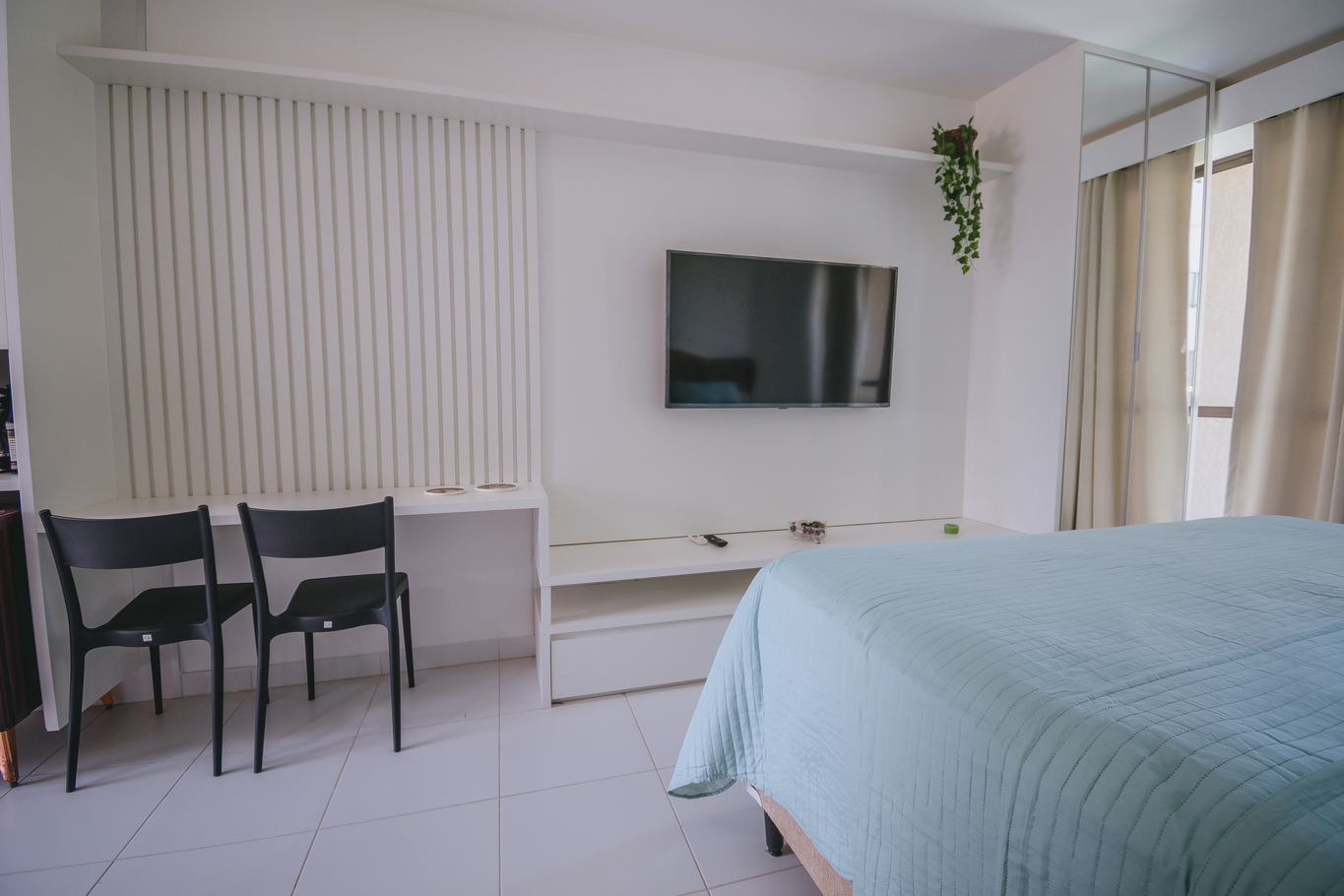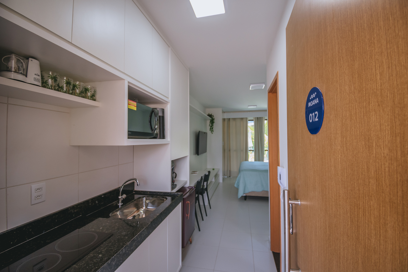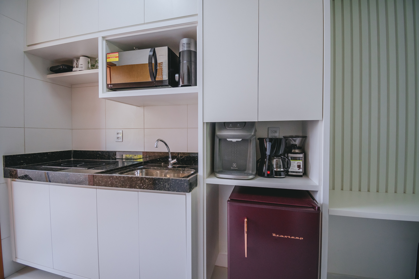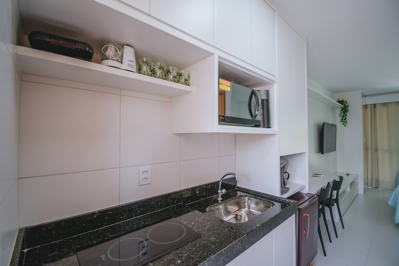 - Cozinha equipada com fogão, micro-ondas, geladeira frigobar, cafeteira, filtro, batedeira, louças e utensílios completos(exceto óleo e sal)