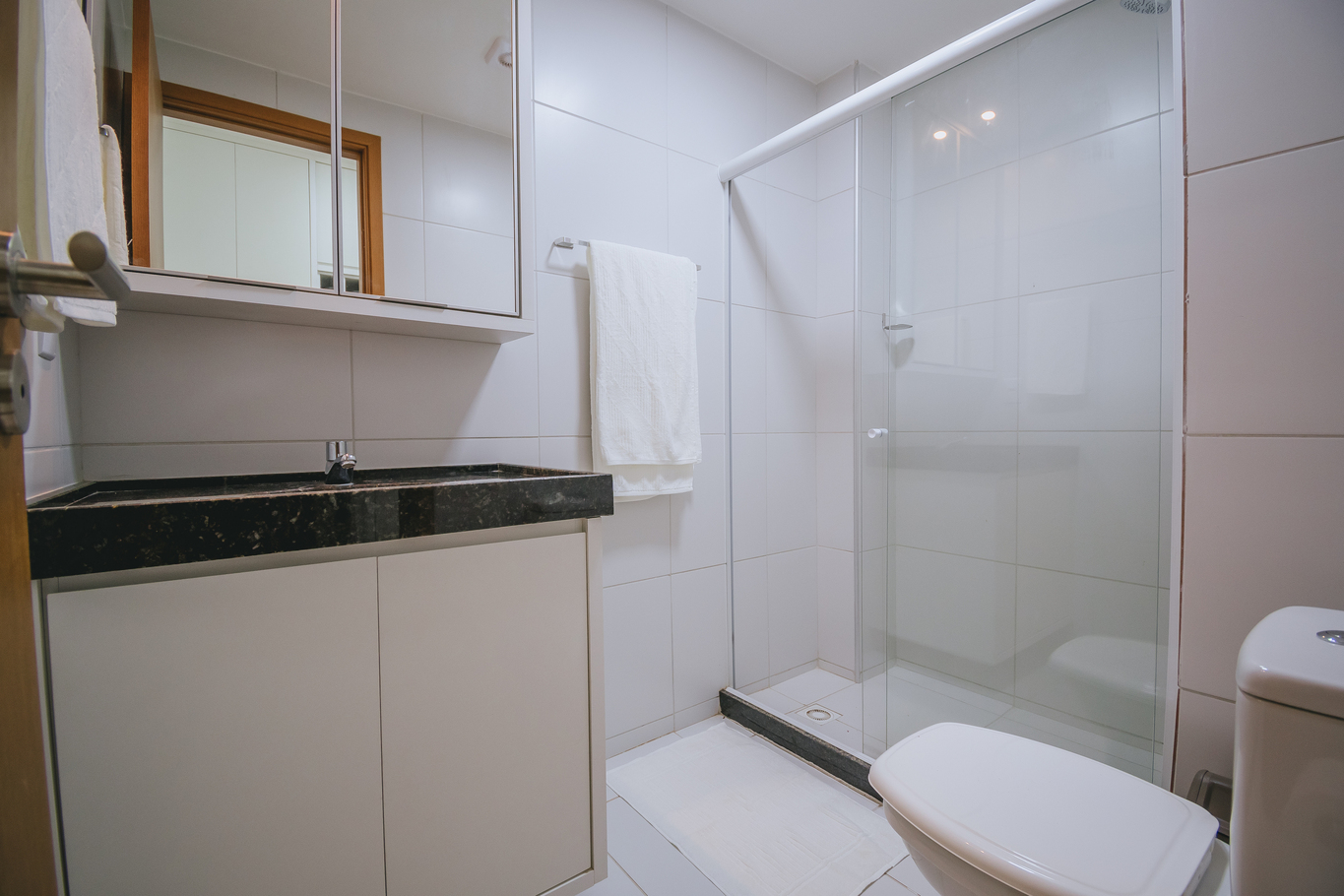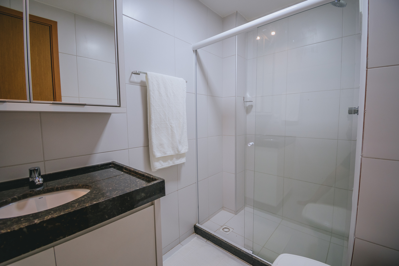 - Banheiro moderno, com chuveiro a gás e box de vidro