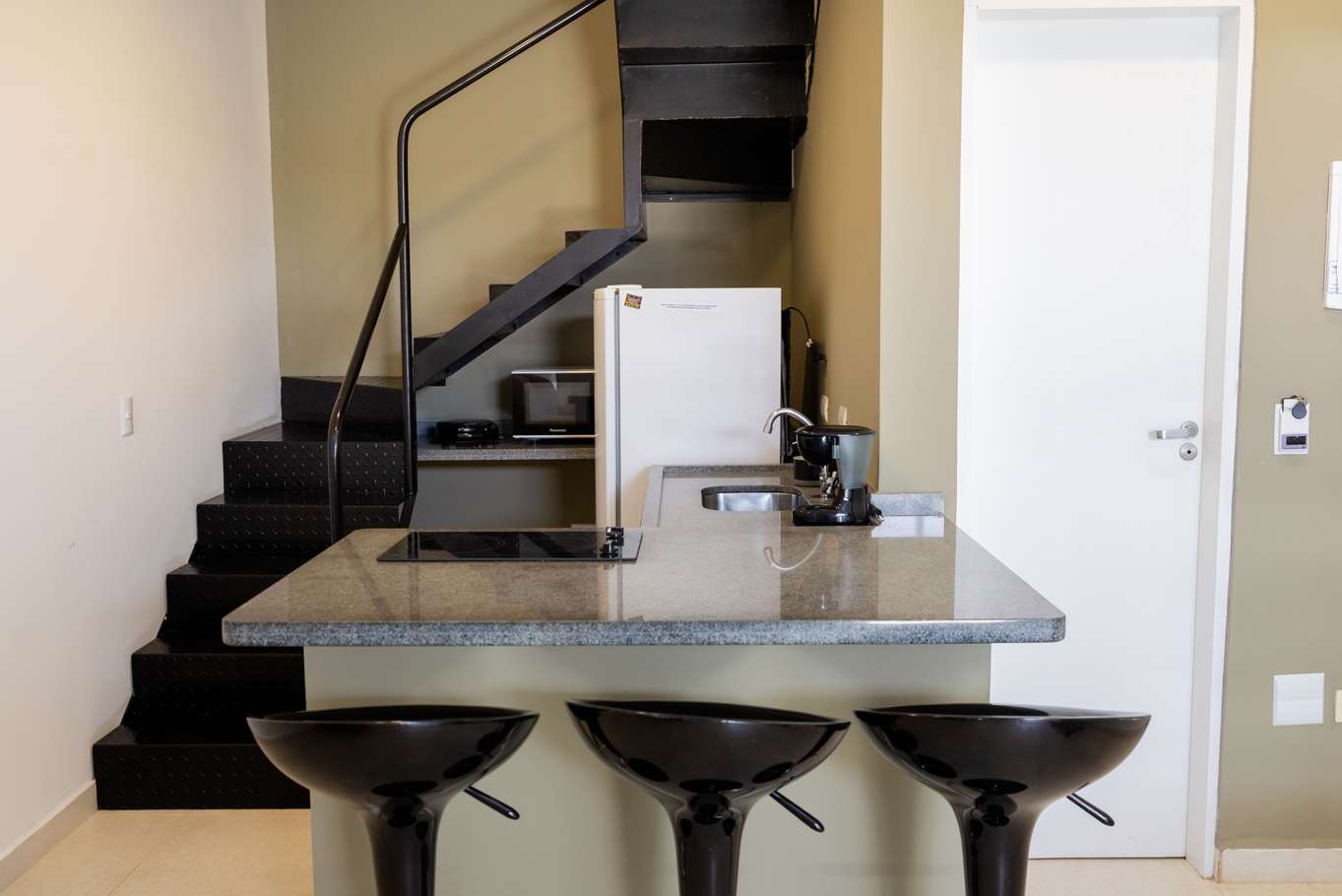 - Cozinha equipada com geladeira, fogão, micro-ondas, cafeteira, torradeira e utensílios diversos(exceto óleo e sal)
