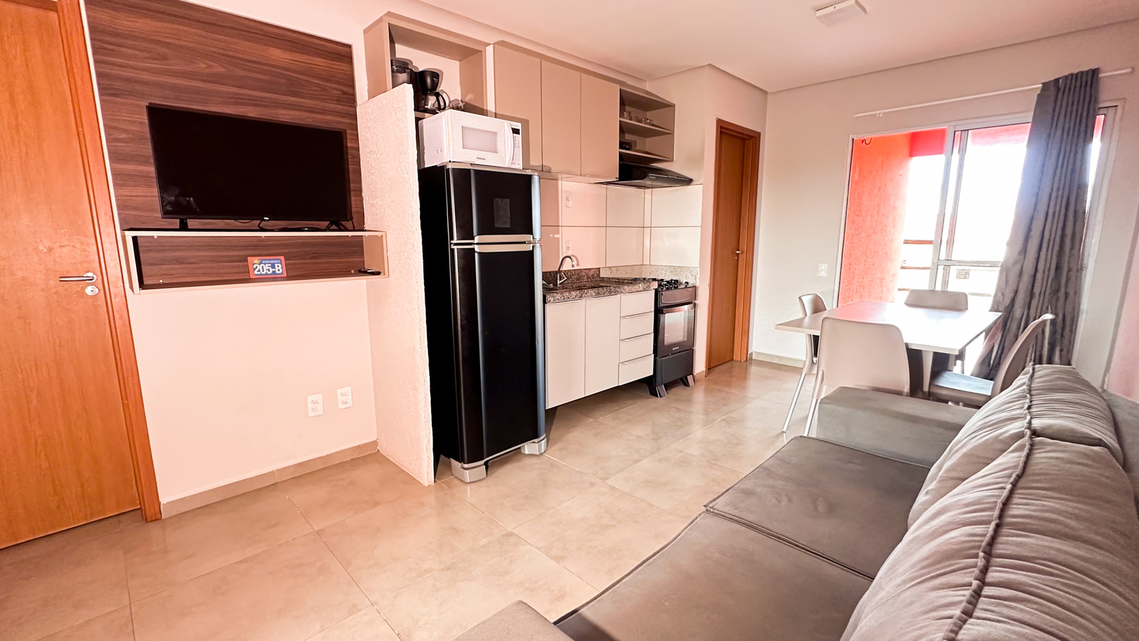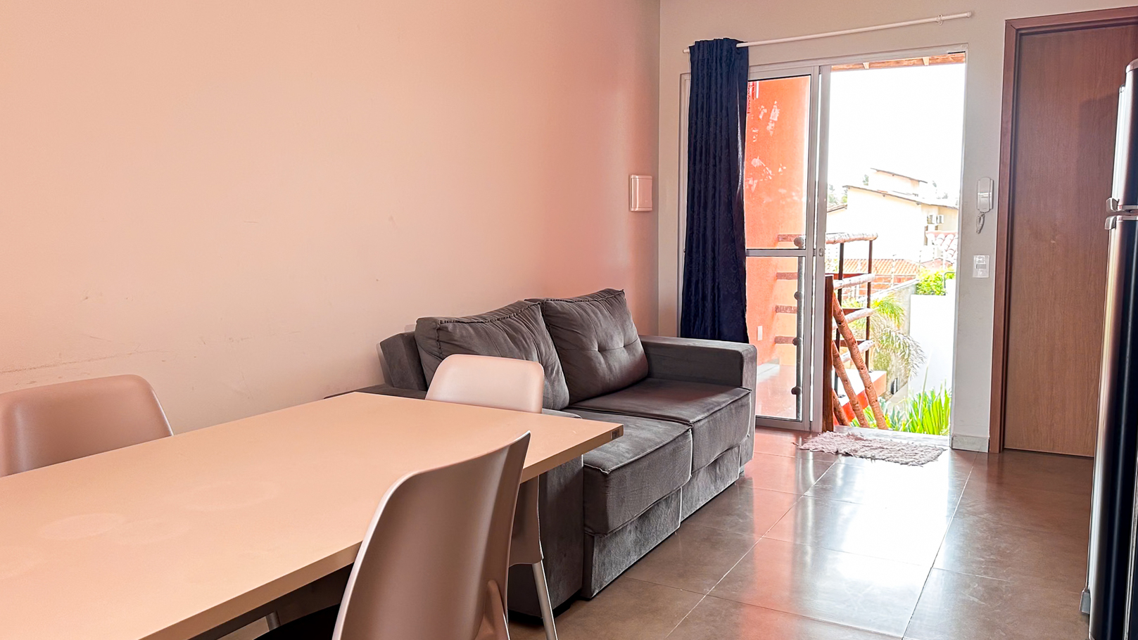 - Sala climatizada com sofá, mesa de jantar, smart TV e mesa de centro