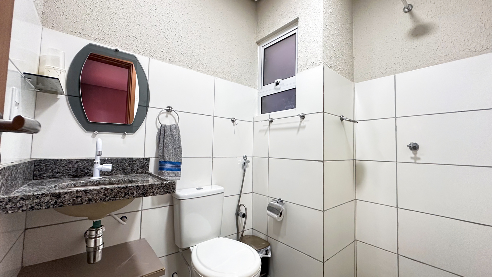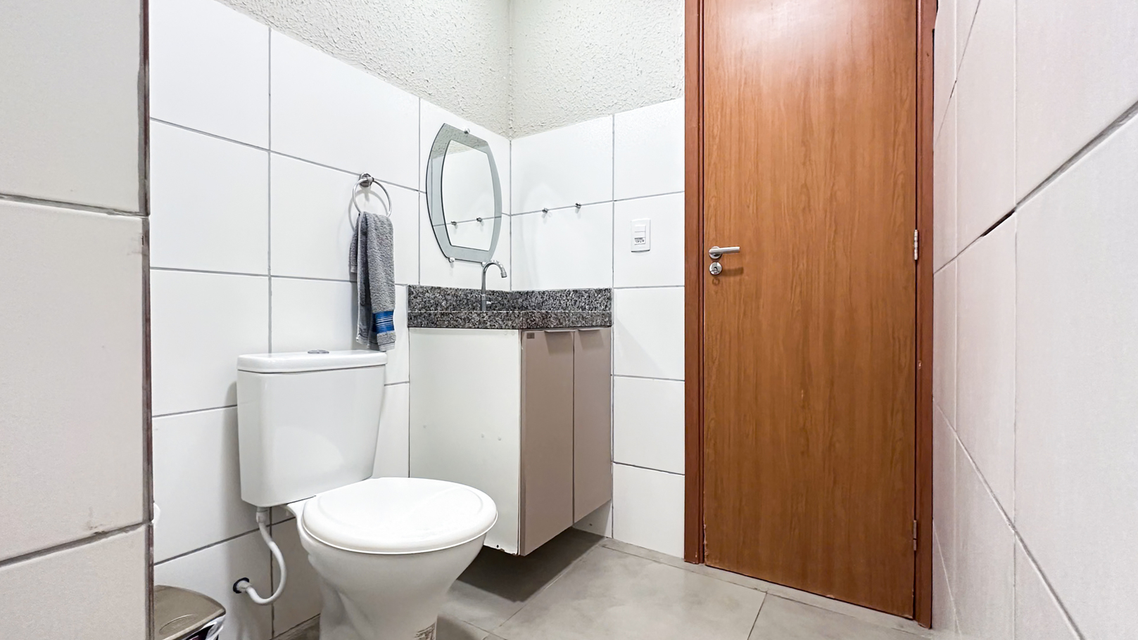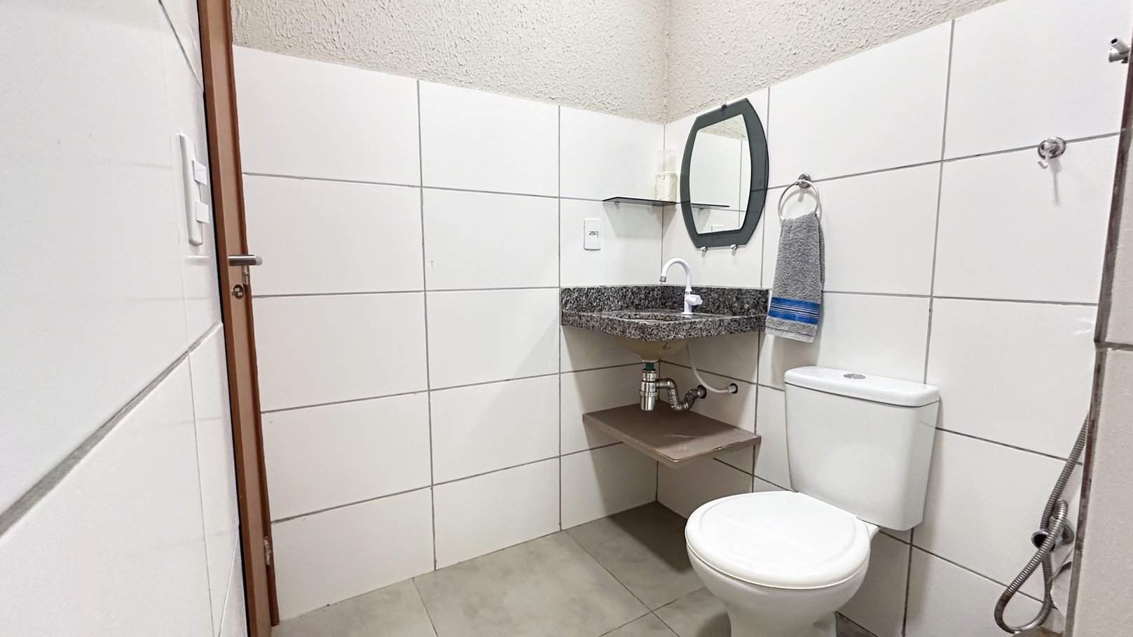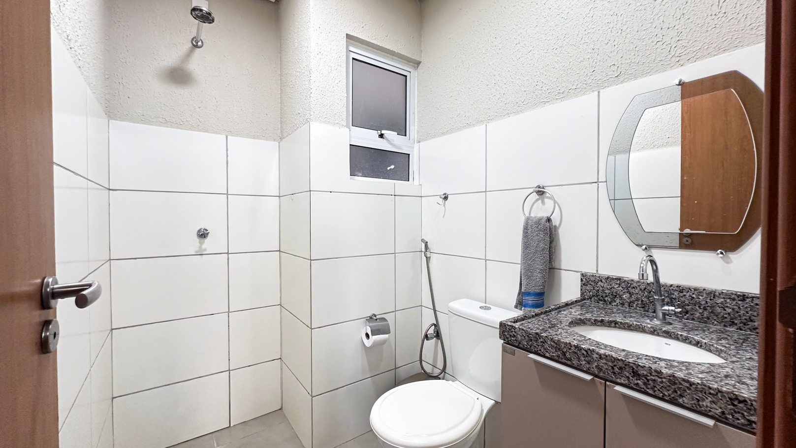 - Banheiro social completo com chuveiro elétrico e box de vidro