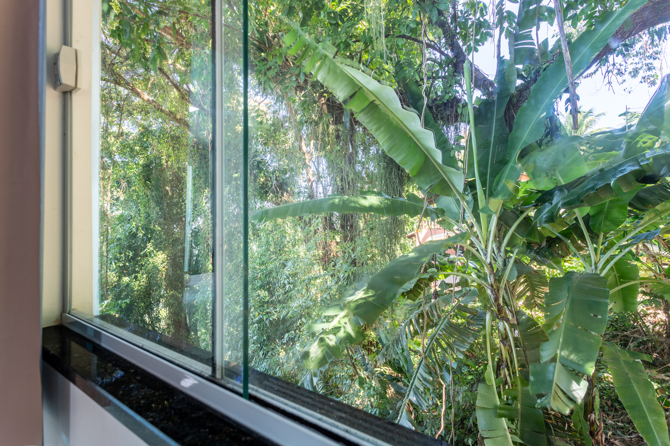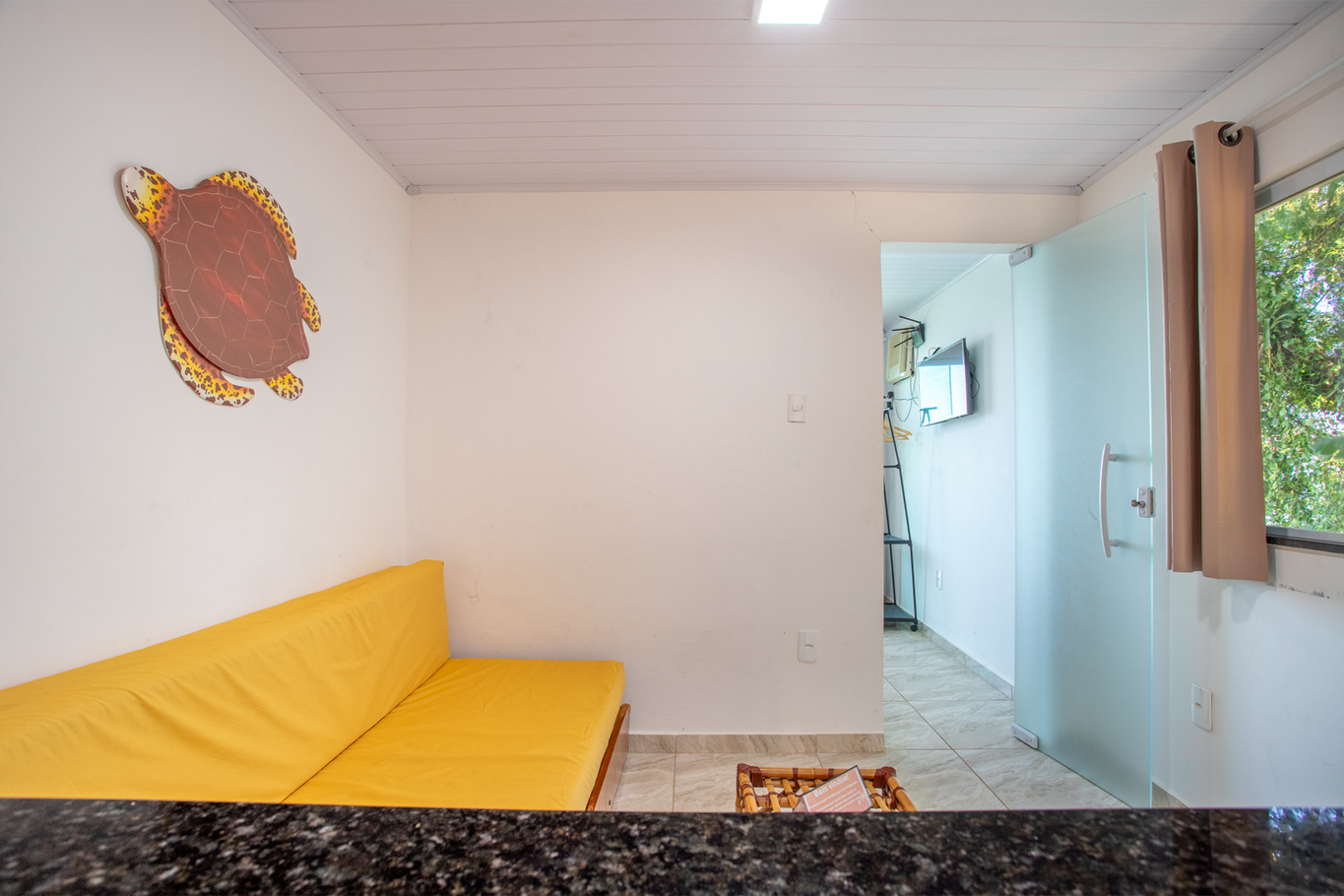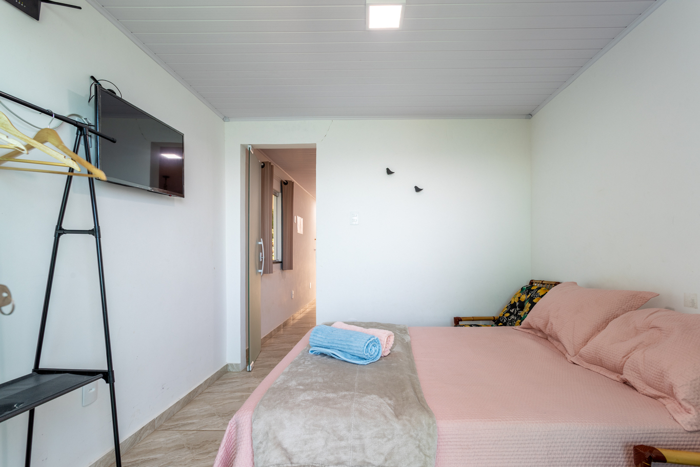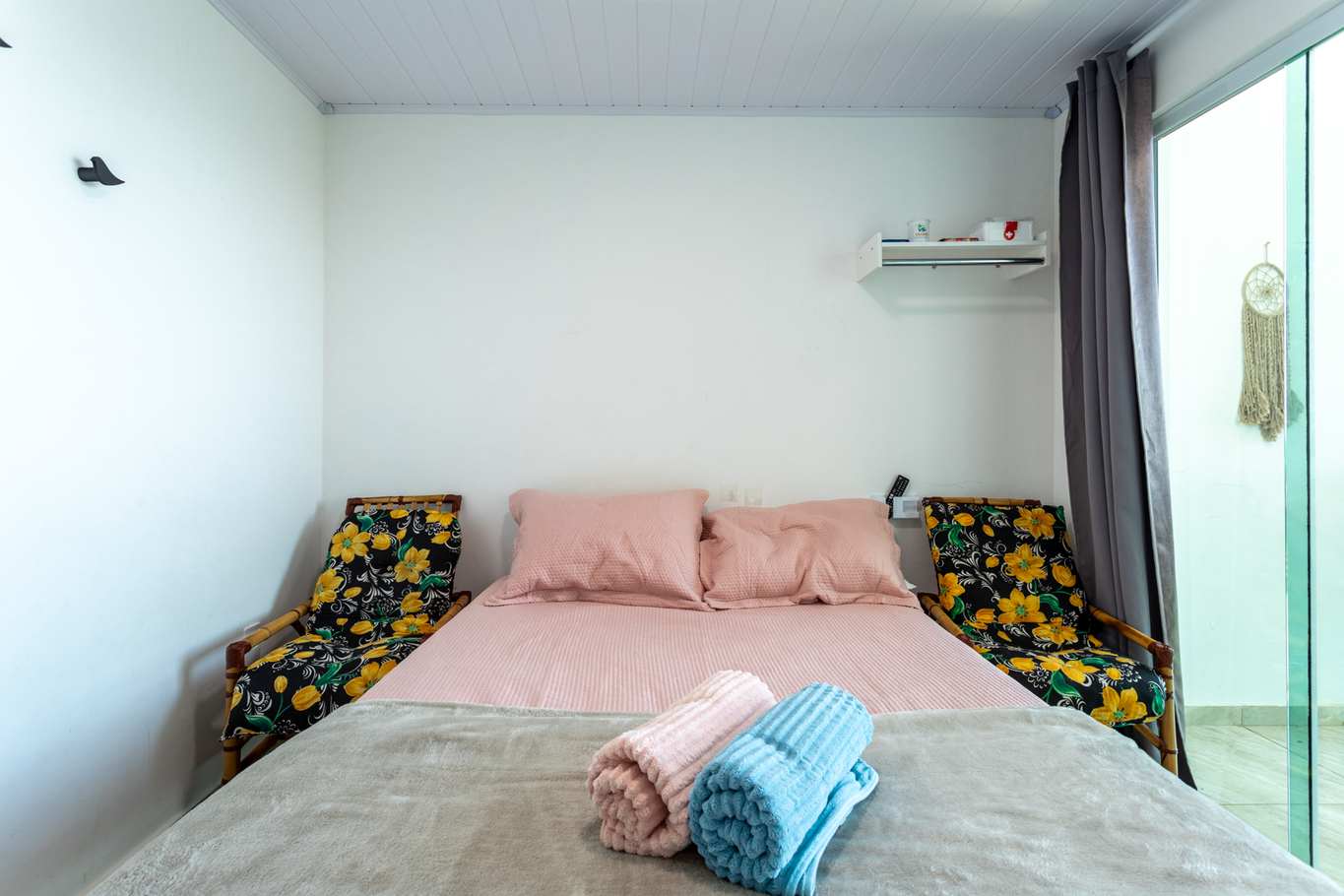 - Quarto com cama de casal, ar-condicionado, Smart TV, arara, cabideiro e 2 poltronas de bambu