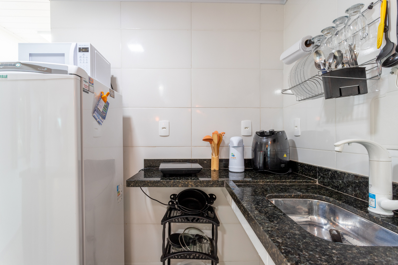 - Cozinha equipada com fogão, microondas, geladeira, fritadeira e utensílios(exceto óleo e sal)