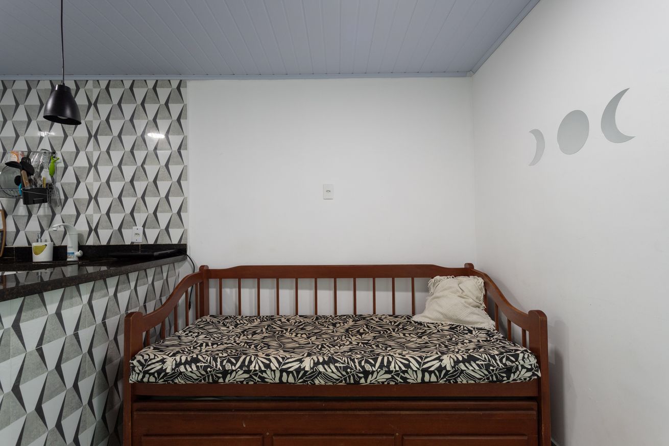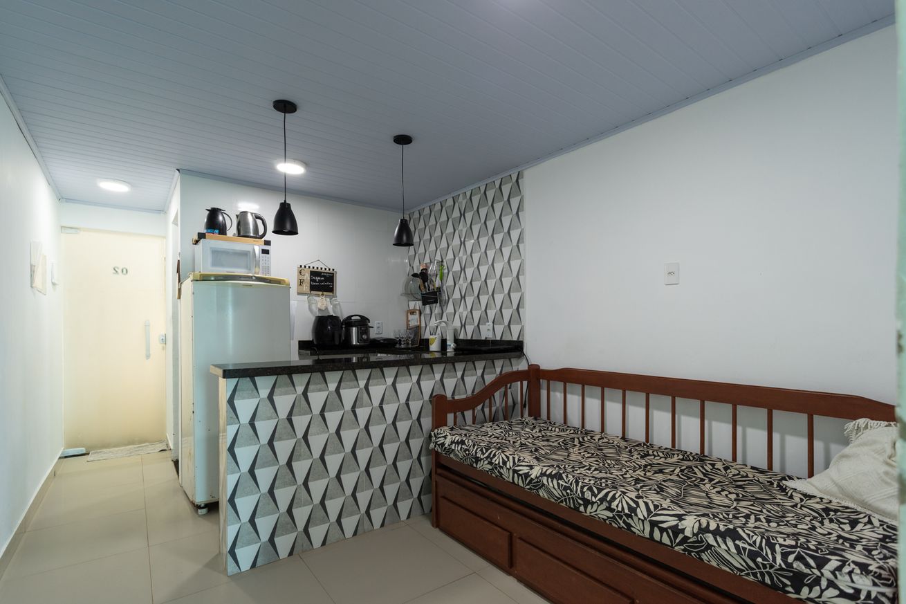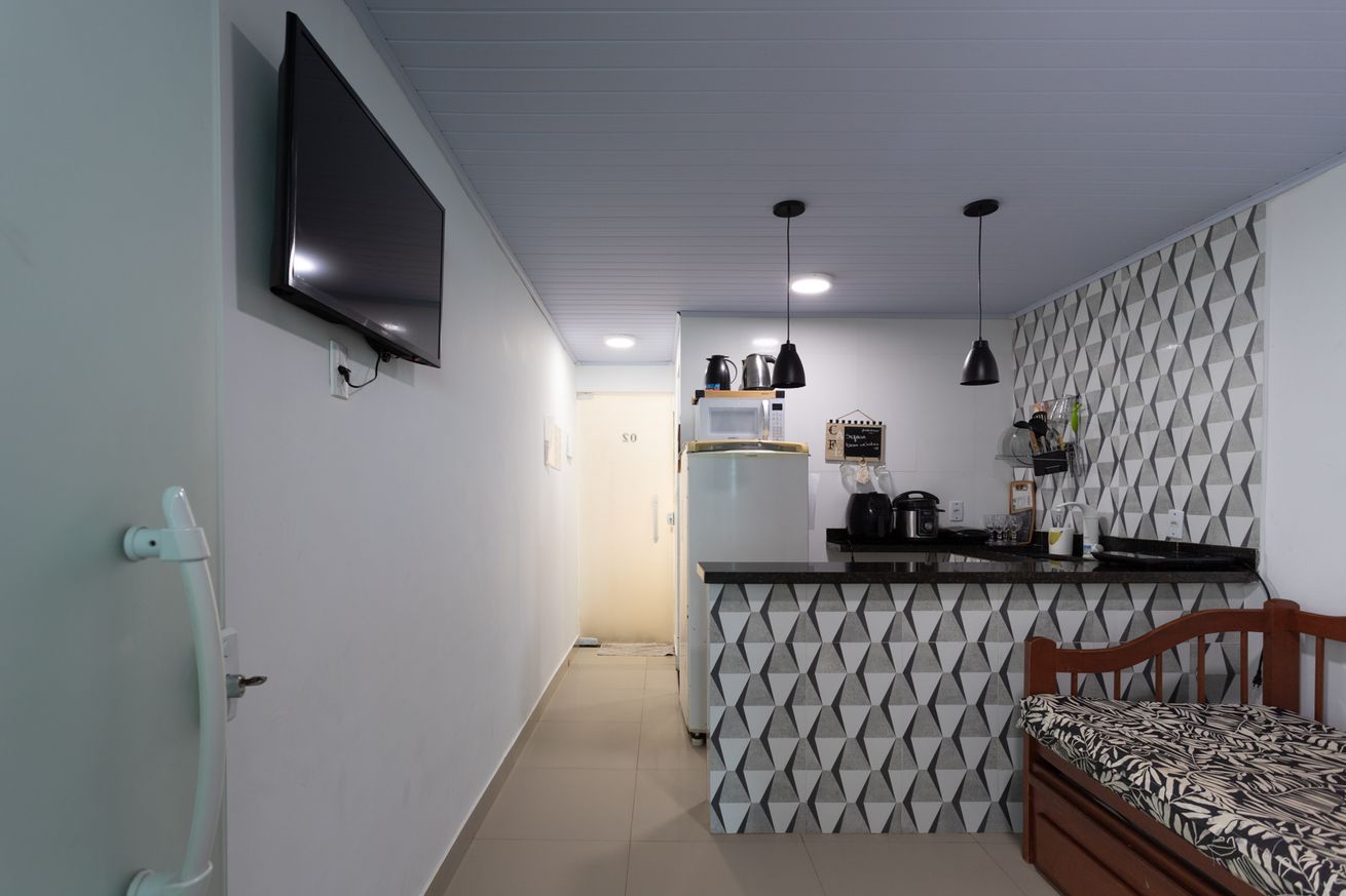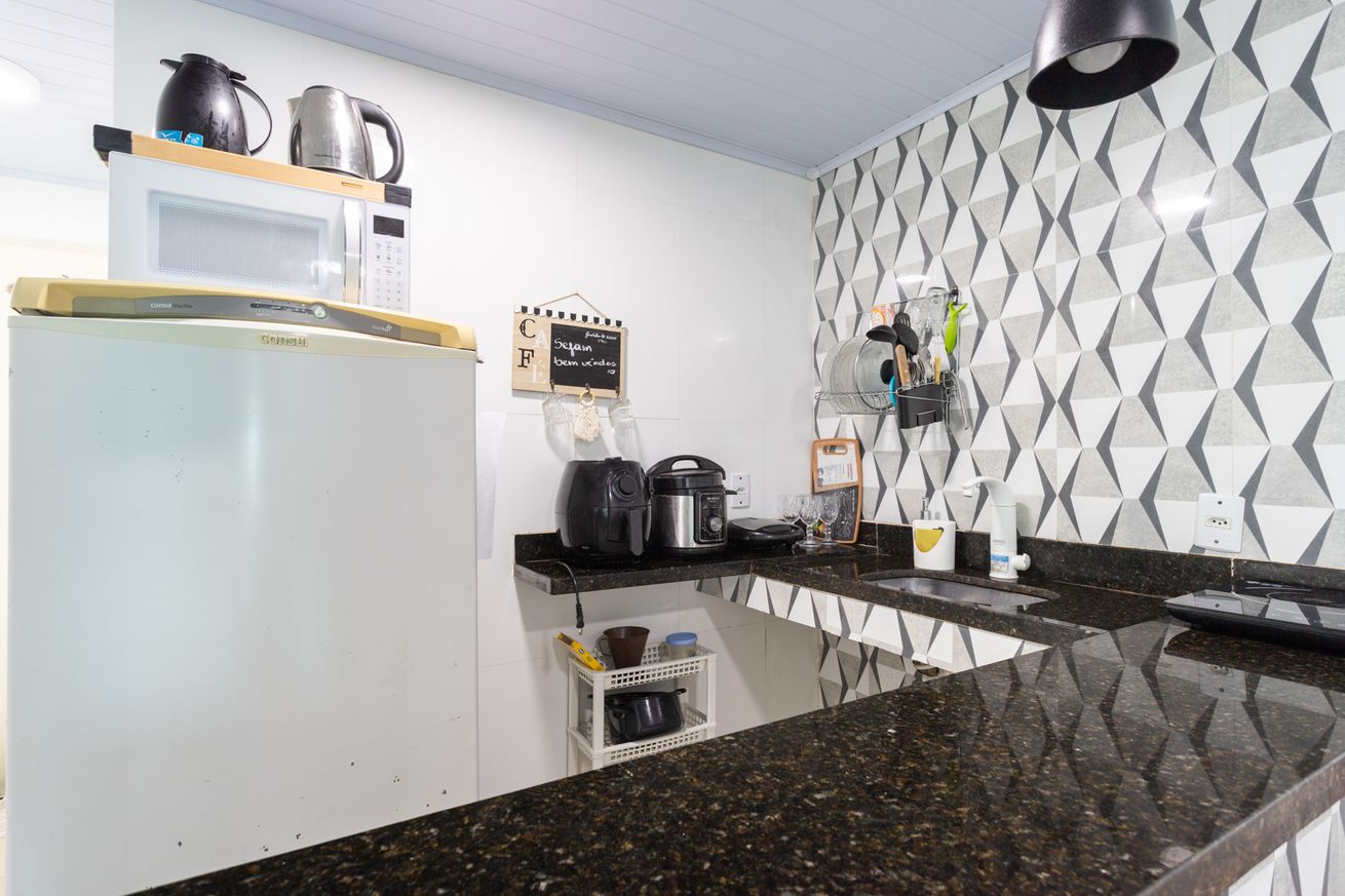 - Cozinha com cooktop 1 boca, geladeira,microondas, panela de pressão elétrica, chaleira, coador, garrafa térmica, utensílios e itens diversos(exceto óleo e sal)