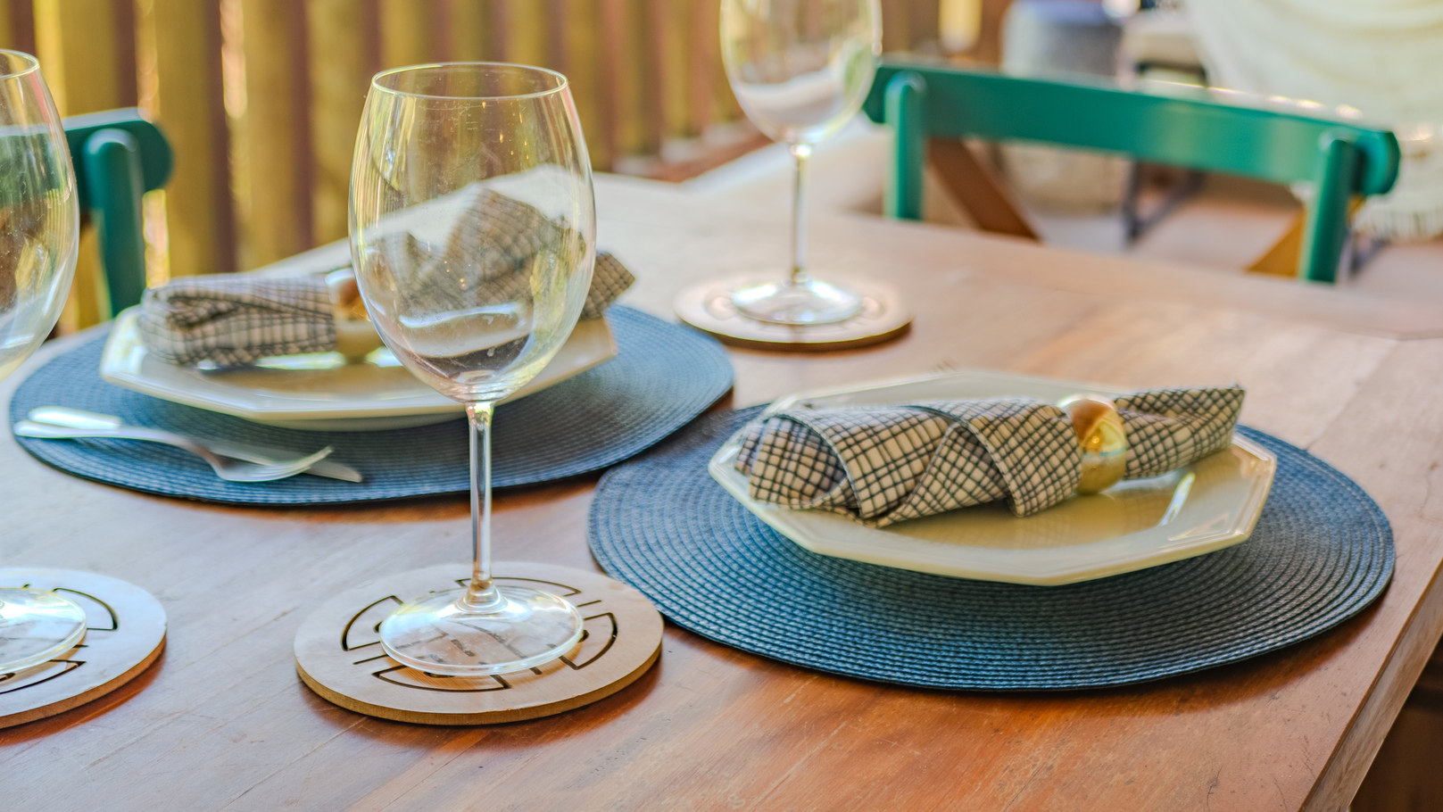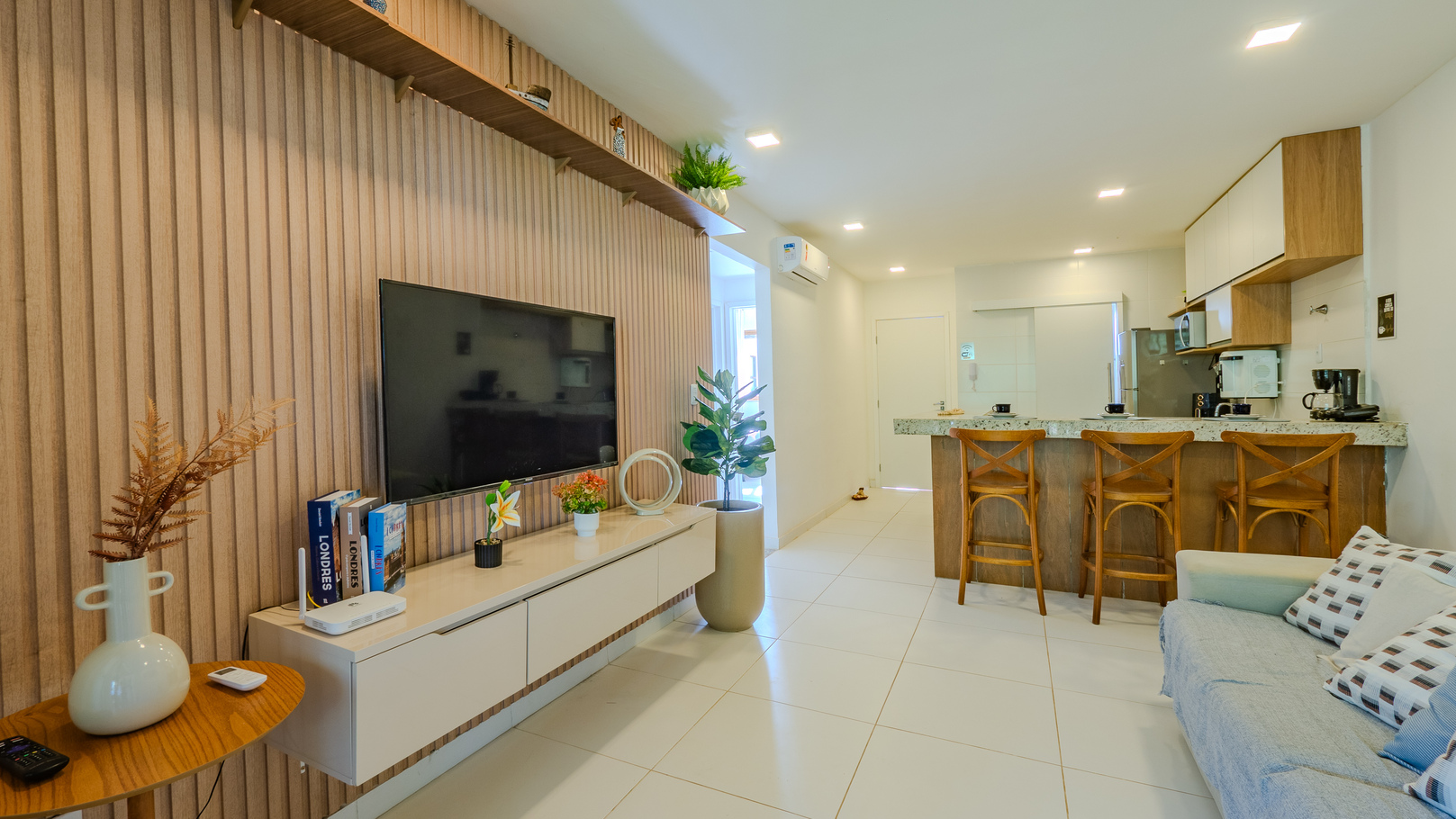 - Sala com ar-condicionado, sofá-cama, smart TV e mesa de jantar