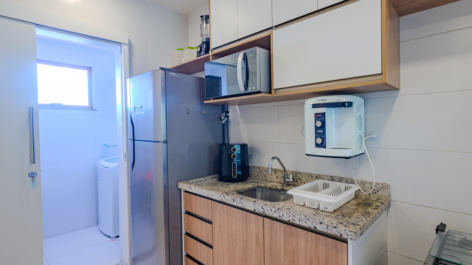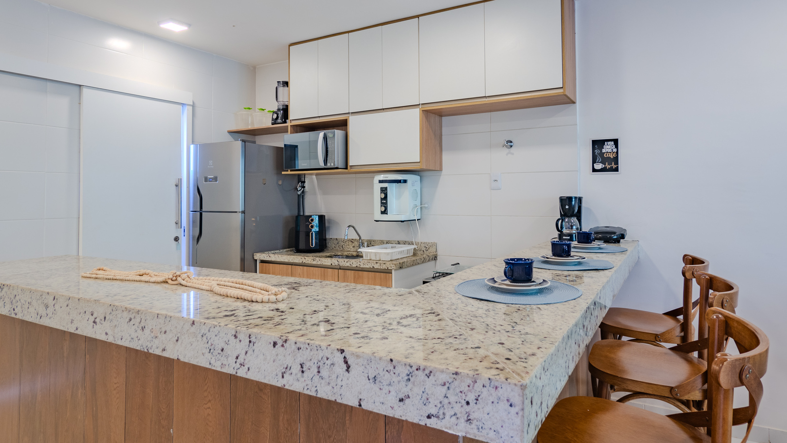 Cozinha equipada com fogão, forno, geladeira, freezer, micro-ondas, cafeteira, fritadeira, torradeira, liquidificador e utensílios(exceto óleo e sal)