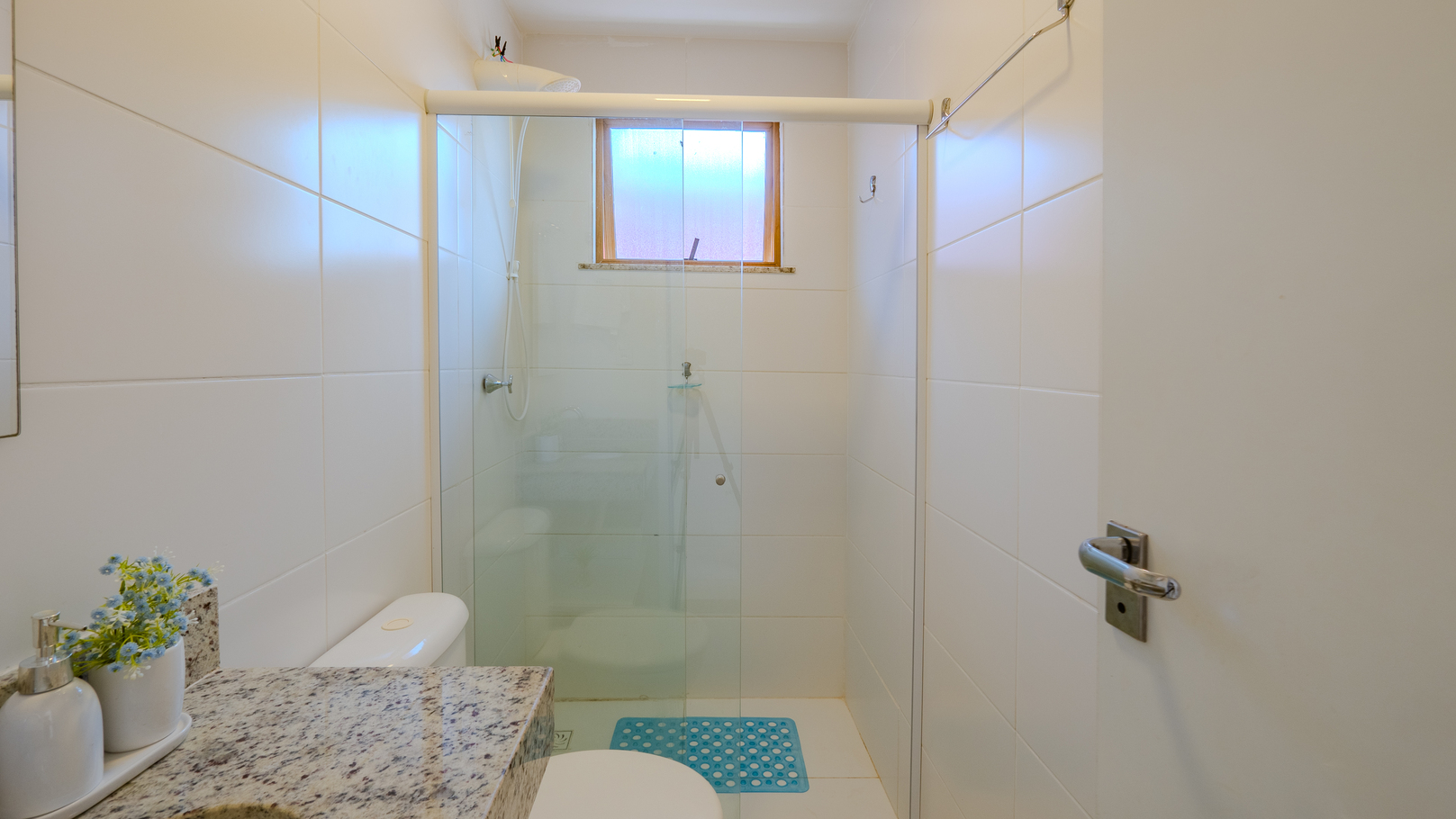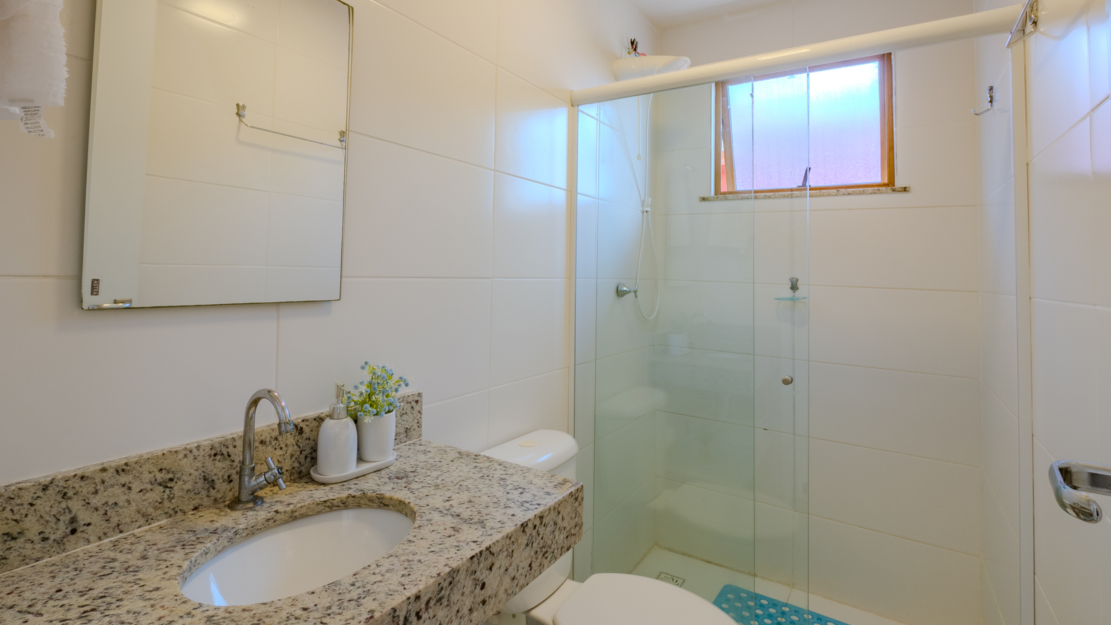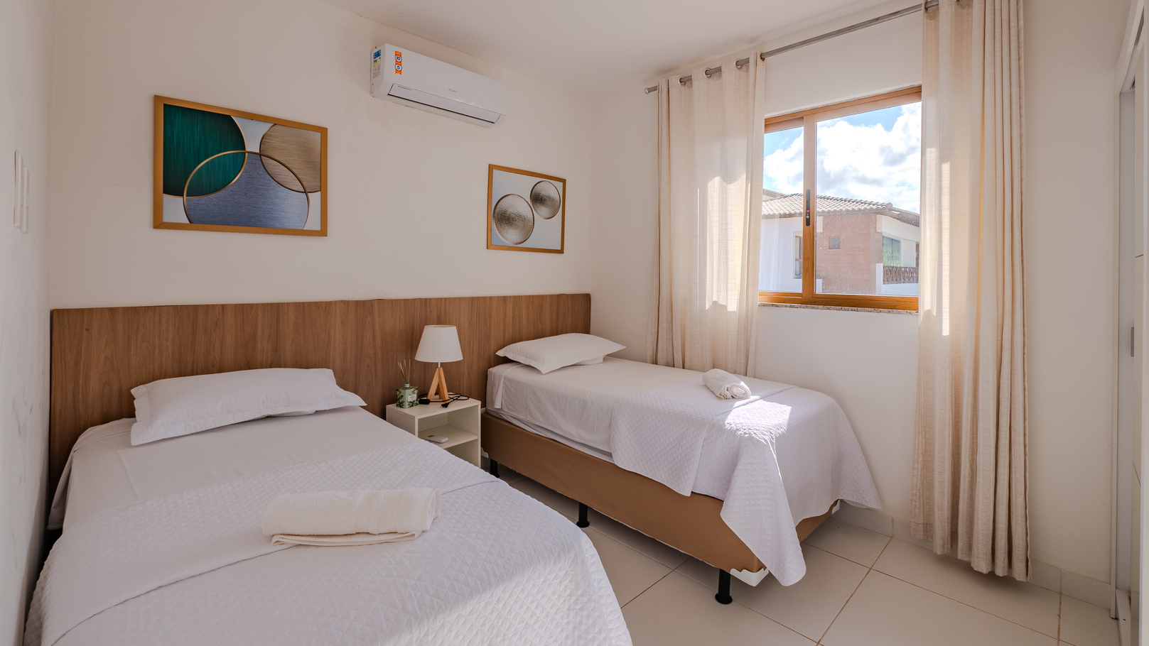 - Quarto 1 (suíte): cama de casal, ar-condicionado, armário, edredom e banheiro privativo com chuveiro elétrico, box de vidro/acrílico e secador de cabelo